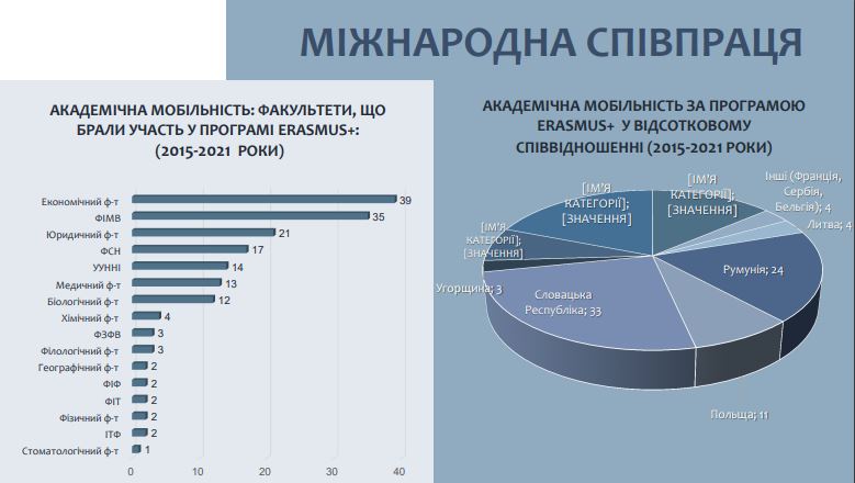 Станом на кінець 2021 року ДВНЗ «УжНУ» активно співпрацює з понад сотнею (125) закордонних партнерів; у 2021 році укладено 14 нових міжнародних білатеральних угод. Основні міжнародні проєкти, що діяли у 2021 році: «Промоція ремісництва і гастрономії регіону як невід’ємних складових культурної спадщини Карпатського єврорегіону» «Розширення діючої «Системи космічного захисту від надзвичайних ситуацій» у напрямку моніторингу небезпечних природних та техногенних геопроцесів на транскордонній території Угорщини, Словаччини, Румунії та України» «Нові енергетичні рішення у Карпатському регіоні» «Партнерство для геномних досліджень в Україні та Румунії» «Розумна Енергія транскордонного співробітництва» «Впровадження нових стандартів та технологій хірургічного лікування захворювань центральної нервової системи в транскордонному регіоні» «Навколишнє середовище для майбутнього через наукову освіту» «Карпатський зоряний шлях» «Посилення спроможностей у сфері кібербезпеки в Україні» - «Безпечний та інклюзивний кордон між Словаччиною та Україною – SIBSU» - «Інтеграція дуальної вищої освіти в Молдові та Україні» - «Транскарпатський центр Жана Моне з дослідження європейських стратегій розвитку» - «DESTIN – Журналістська освіта задля демократії в Україні: розробка стандартів, доброчесність та професіоналізм» - «За транскордонним співробітництвом європеїзація українських кордонів» Найактивніша співпраця у 2021 році розпочалася з наступними міжнародними партнерами: Вільний міжнародний університет Молдови, Технічний університет (Молдова), Вища Школа Баден-Вюртемберг (Німеччина), Університет Лайда (Іспанія), Варненський університет управління (Болгарія), Академія Вищої Школи (Польща), Інститут досліджень та розвитку європейської політики (Словенія), Університет в м. Пула (Хорватія), Медичний університет в Білостоці (Польща) та іншими.