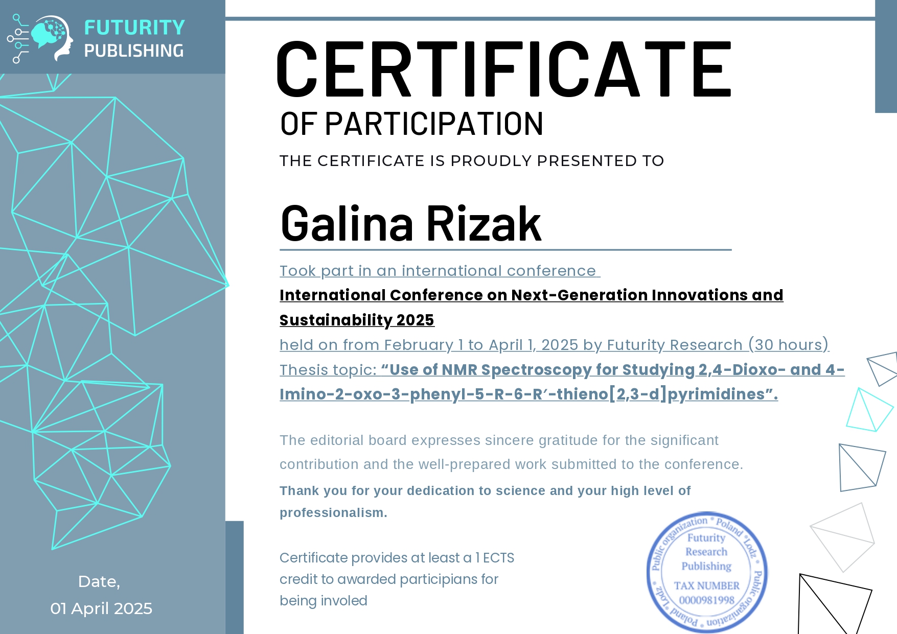 Відома вчена у галузі органічної хімії Галина Вікторівна Різак днями виступила на авторитетній науковій міжнародній конференції з доповіддю "Use of NMR Spectroscopy for Studying 2,4-Dioxo- and 4-Imino-2-oxo-3- phenyl-5-R-6-R′-thieno[2,3-d]pyrimidines".