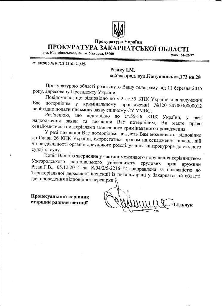 Телеграма №103006 від 5 квітня 2015 року. Повідомлення телеграфом. Київ, вул. Банкова, 11, Президенту України Порошенко Петру Олексійовичу Вельмишановний Петро Олексійович! Переконливо прошу Вас присвоїти звання Героя України (посмертно) Різаку Олексію...