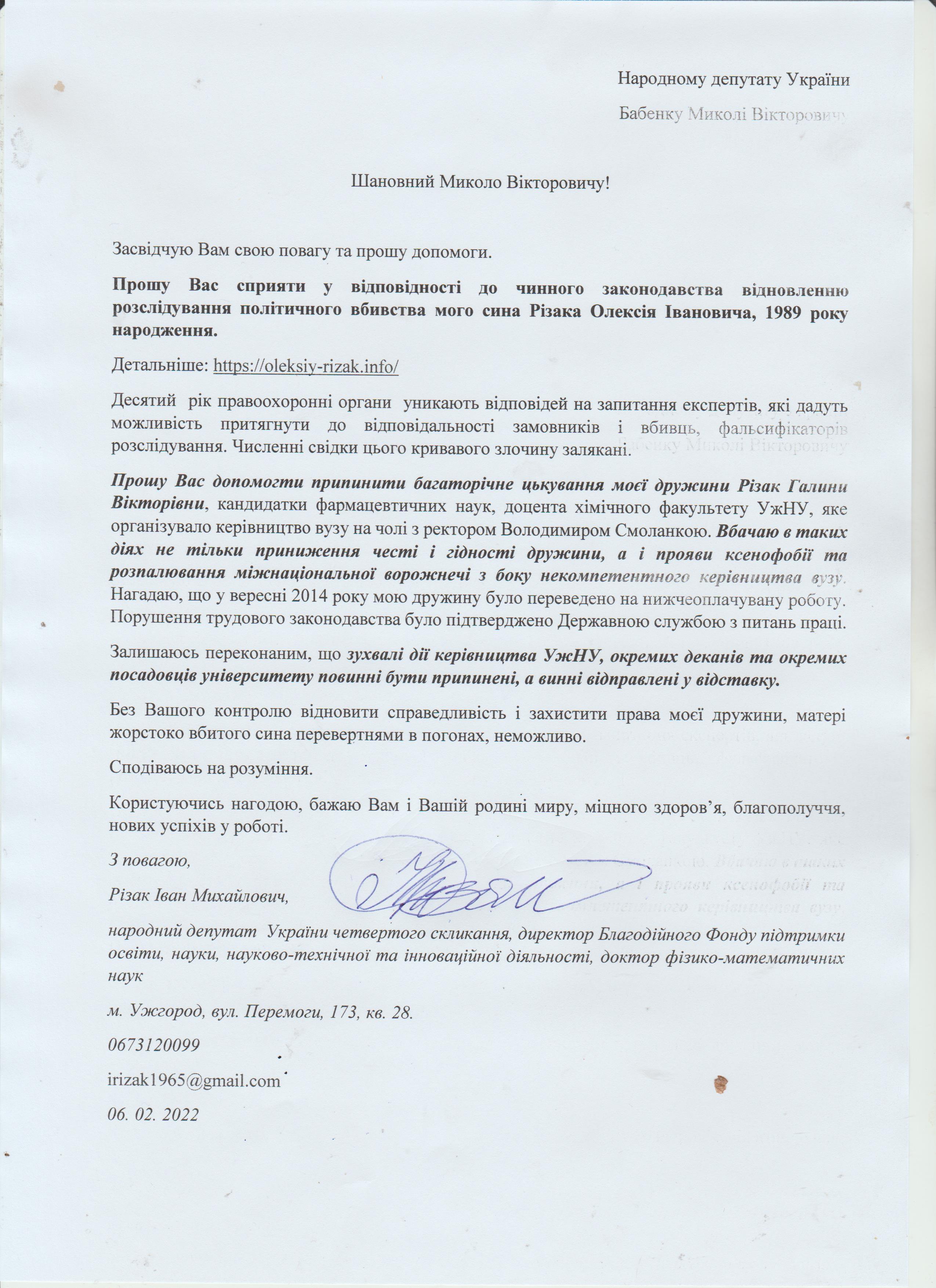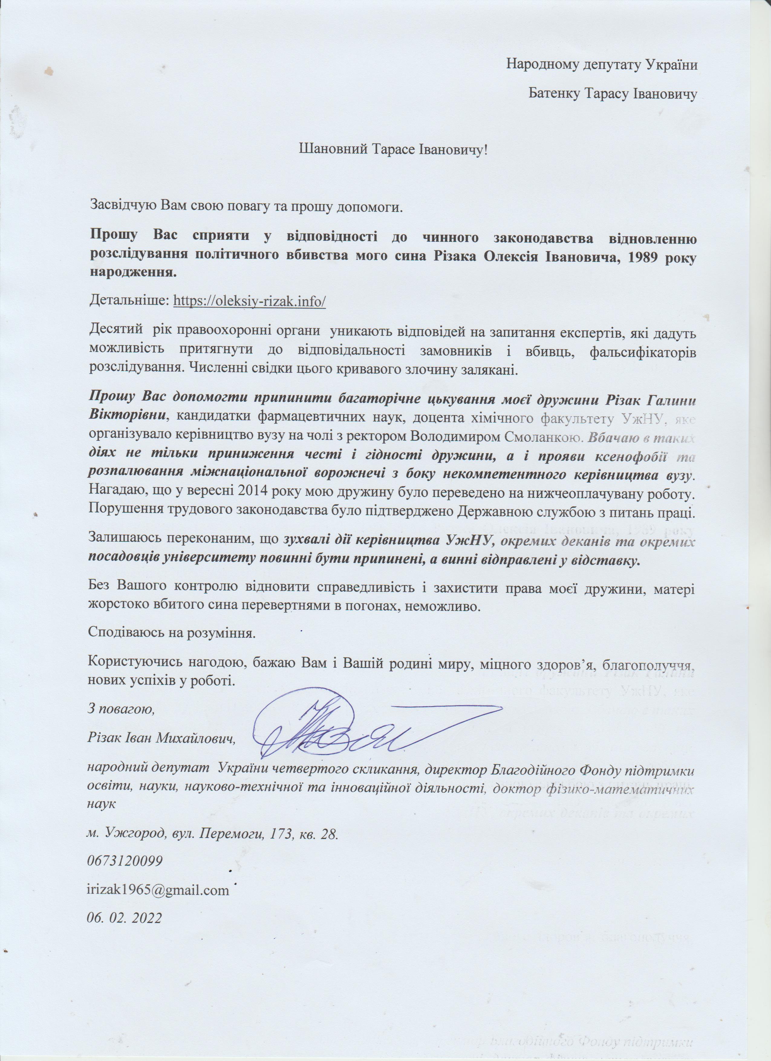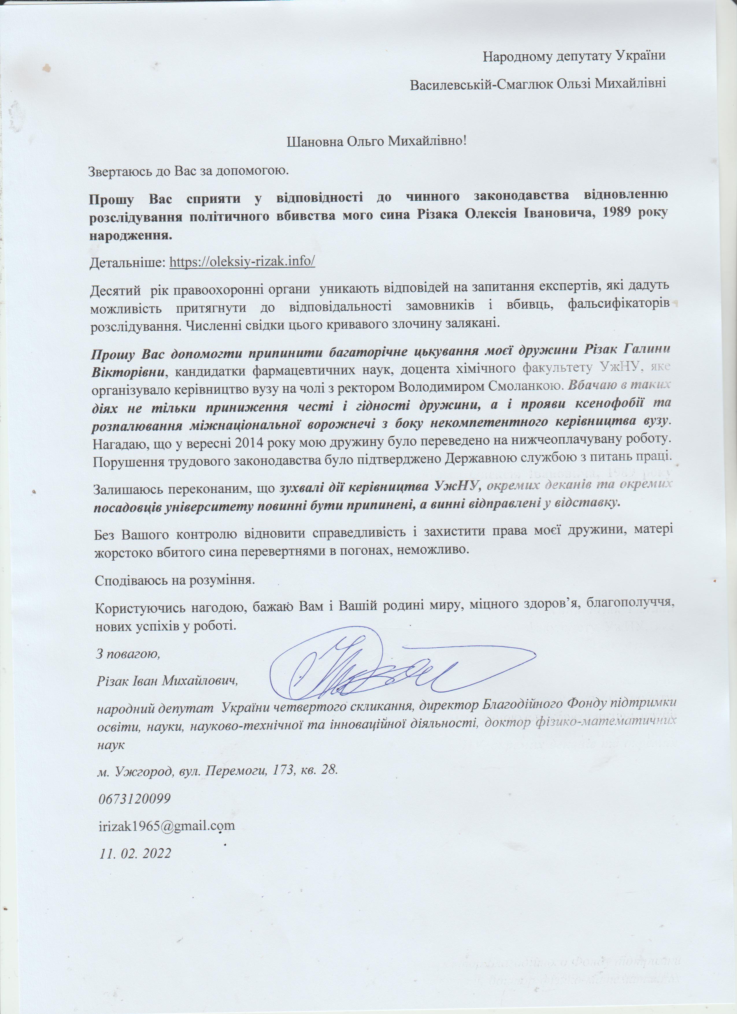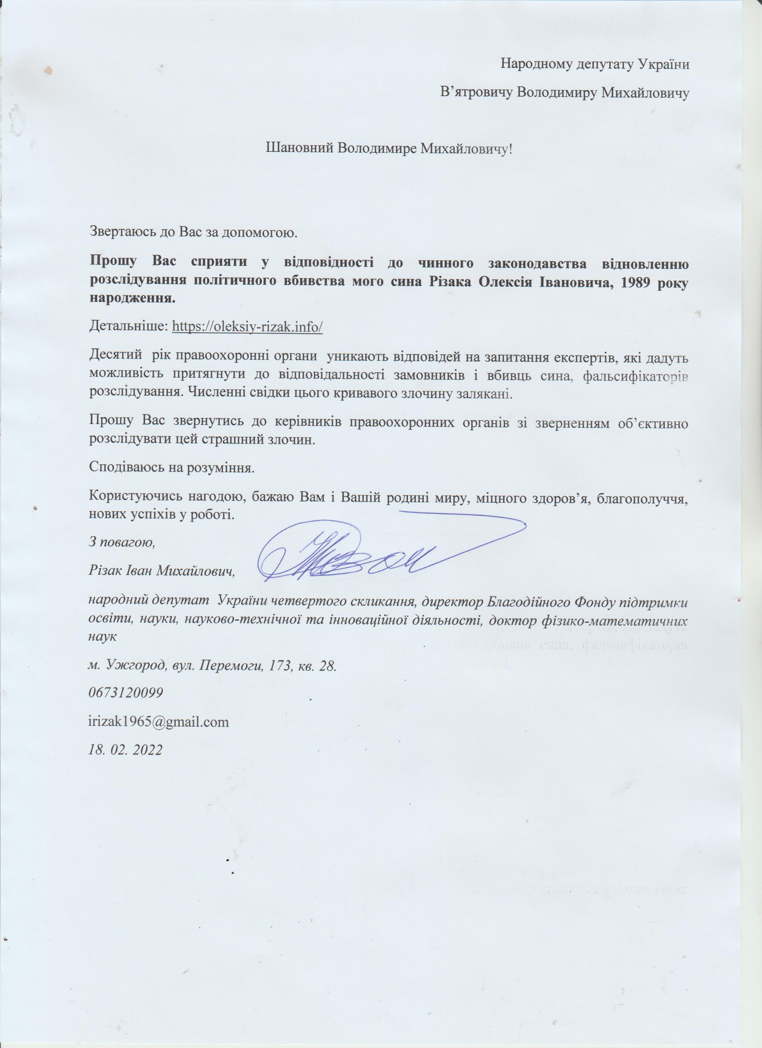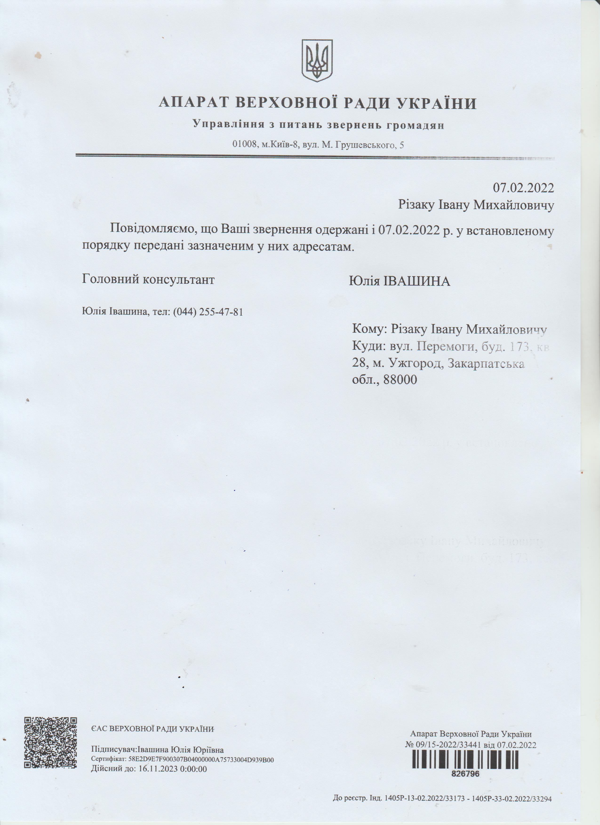 07.02.2022. Відповідь Апарату Верховної Ради України на звернення Івана Різака