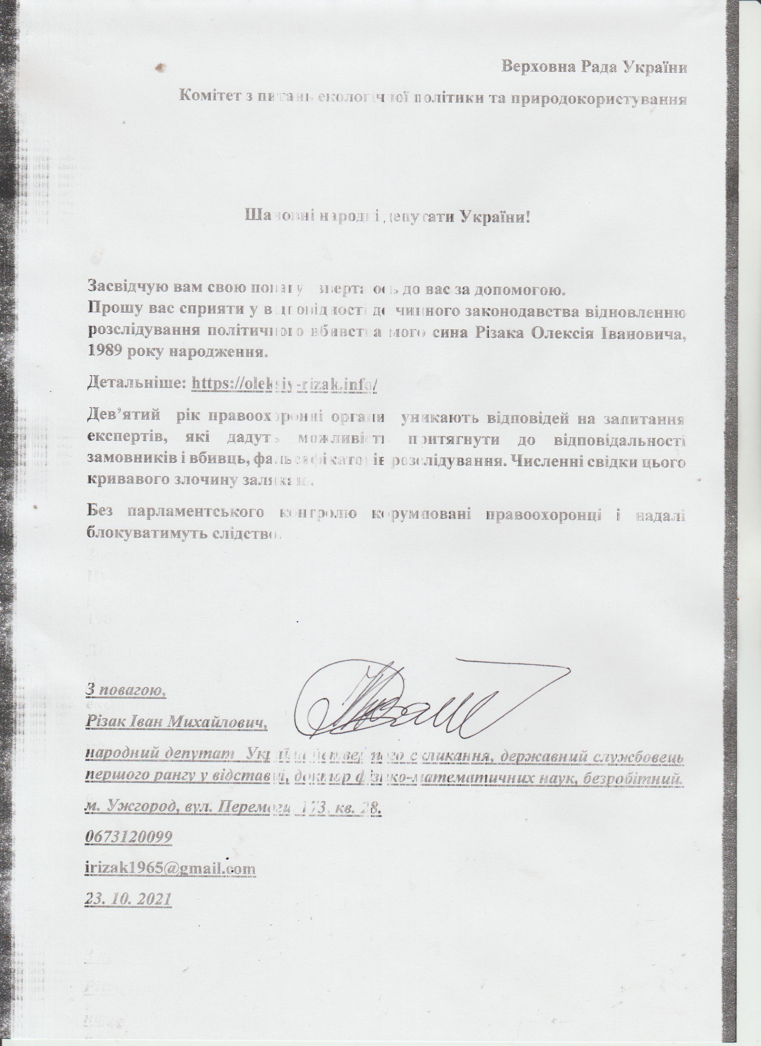 23.10.2021. Звернення Івана Різака до Комітету Верховної Ради України з питань екологічної політики та природокористування