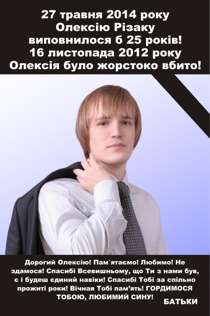 27 травня 2017 року Олексію Різаку виповнилося б 28 років… 27 травня - День Памяті безвинно убієнного РІЗАКА ОЛЕКСІЯ ІВАНОВИЧА. 16 листопада 2012 року Олексій Різак був жорстоко...
