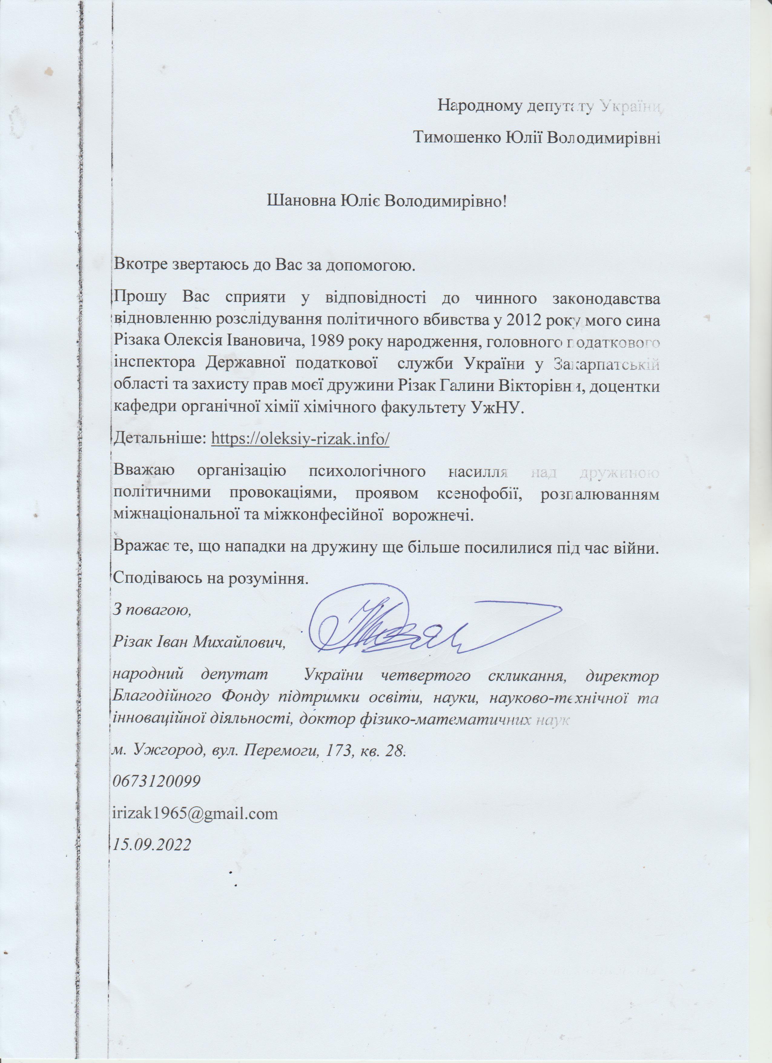 15.09.2022. Звернення Івана Різака до Юлії Тимошенко