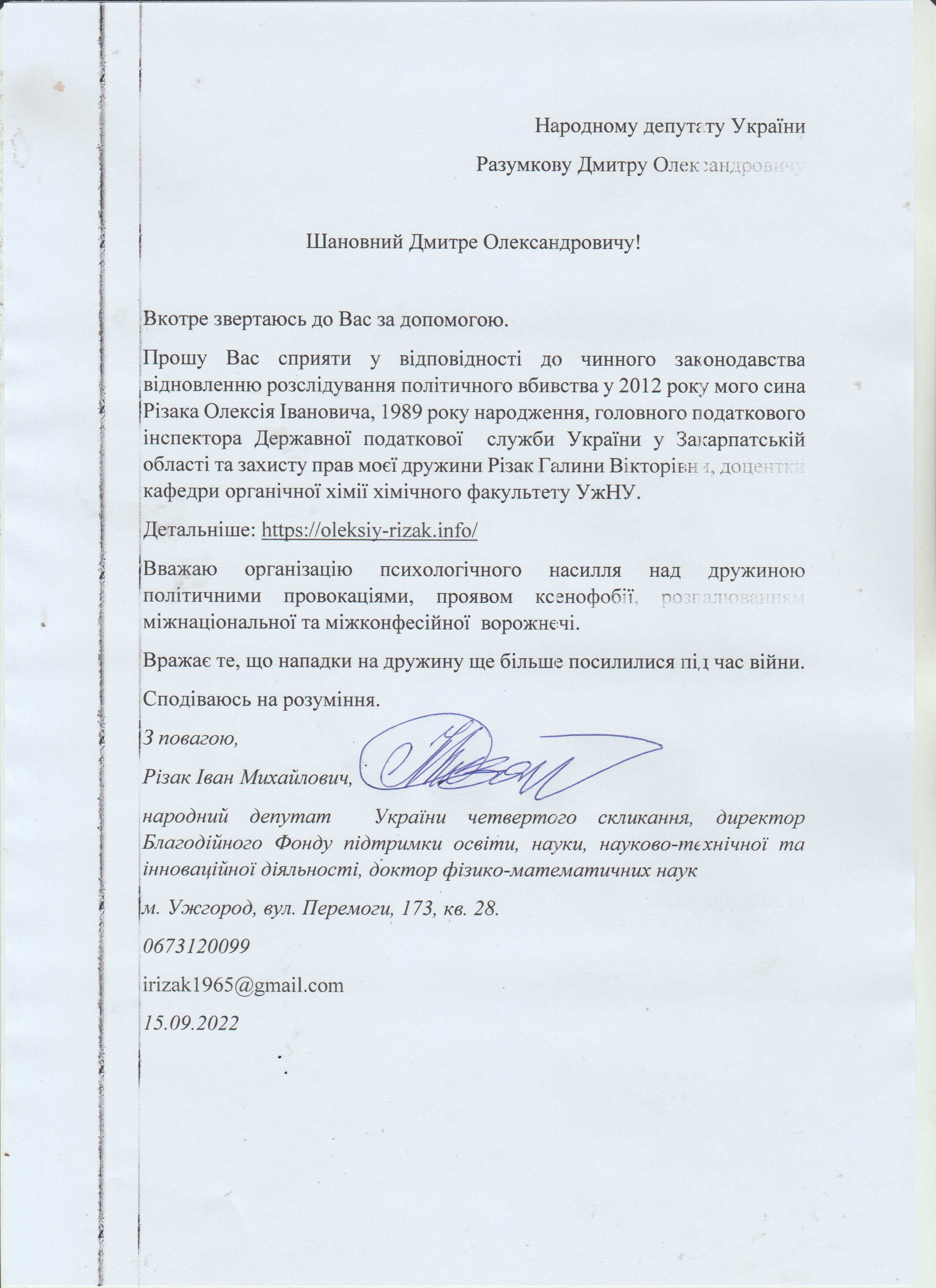 15.09.2022. Звернення Івана Різака до Дмитра Разумкова