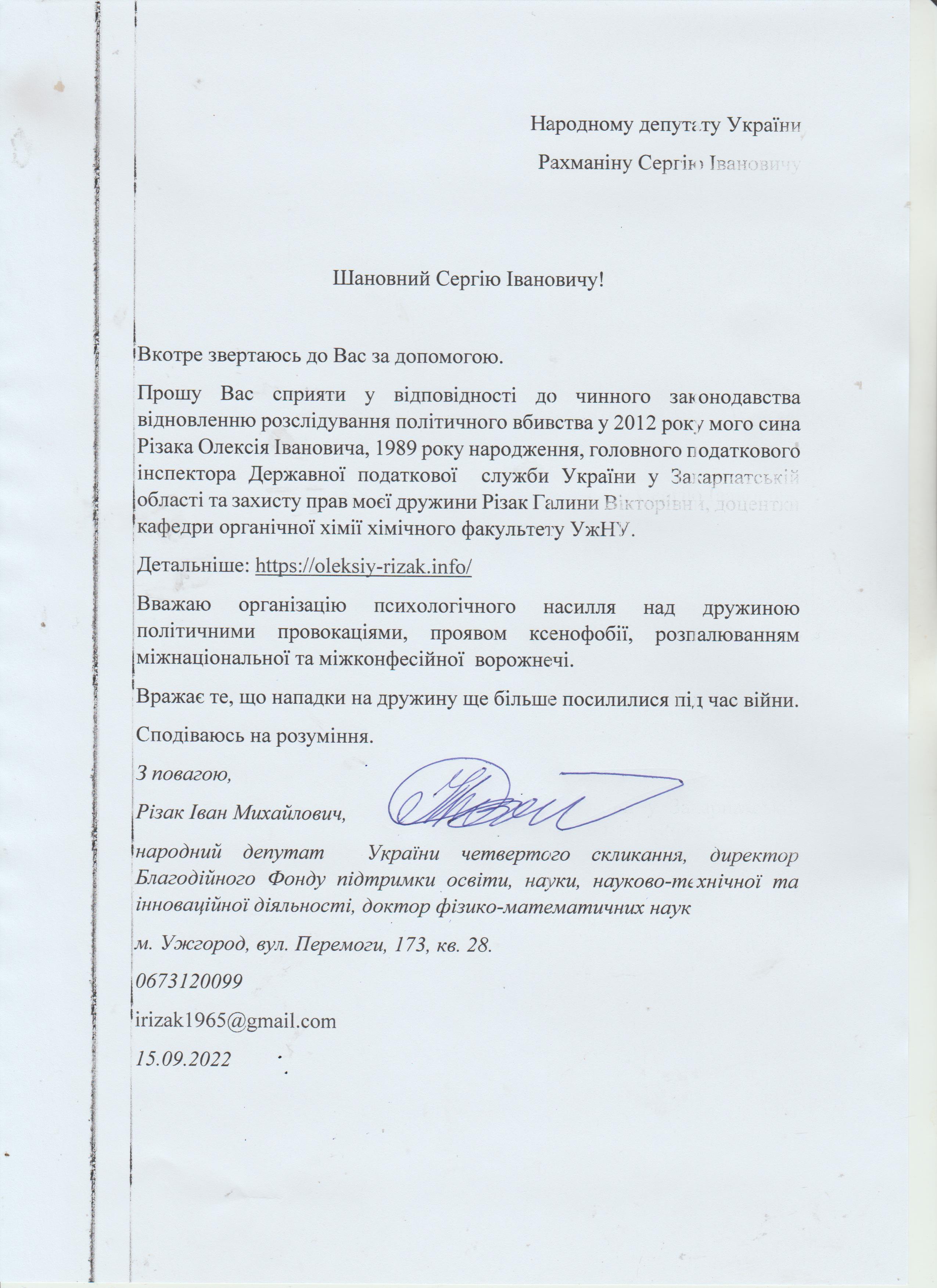 15.09.2022. Звернення Івана Різака до Сергія Рахманіна