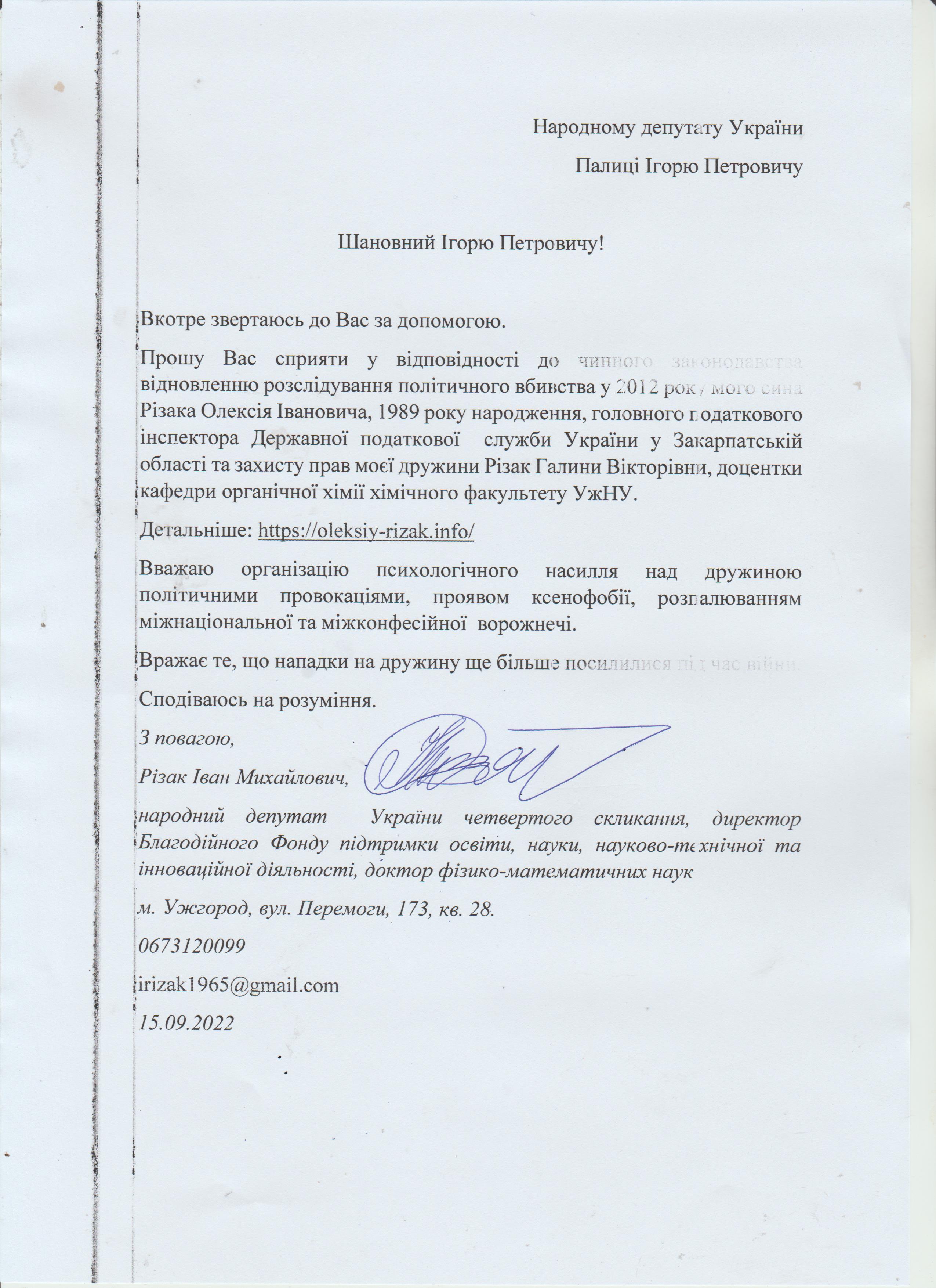 15.09.2022. Звернення Івана Різака до Ігоря Палиці