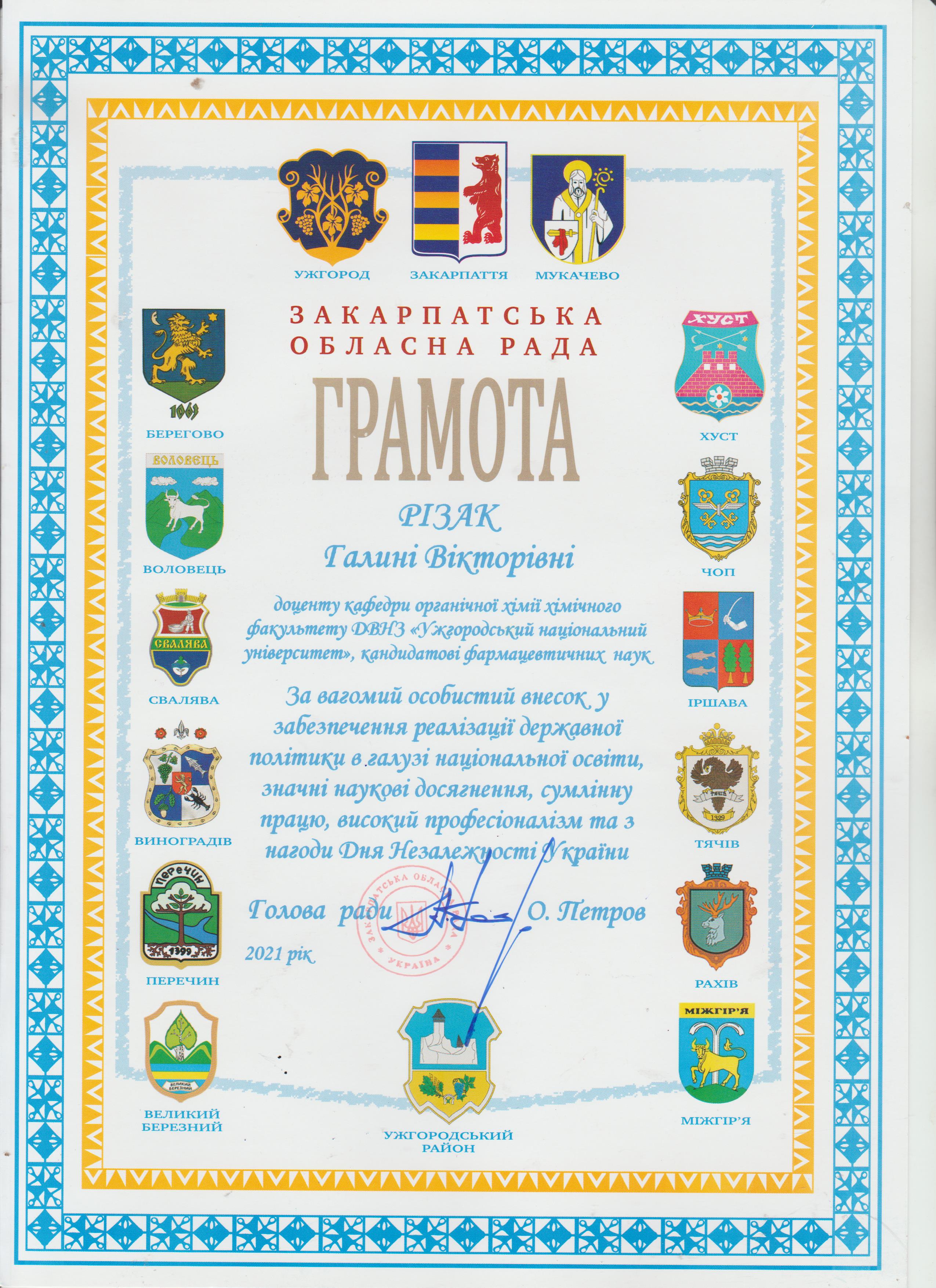 Доцента кафедри органічної хімії УжНУ, кандидата фармацевтичних наук Галину Різак нагороджено відзнакою УПЦ та грамотою Закарпатської обласної ради