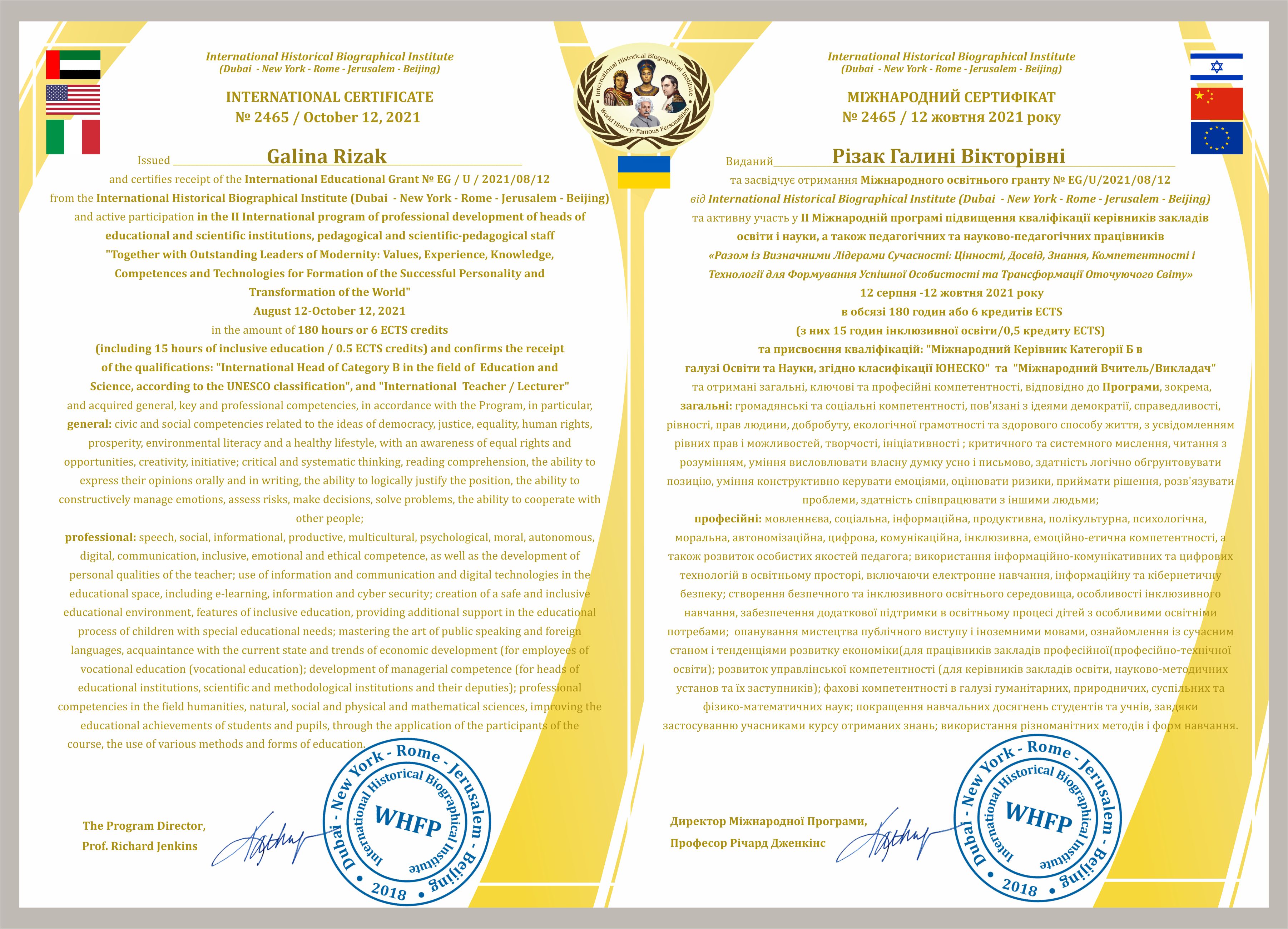 Галина Різак. доцент кафедри органічної хімії хімічного факультету, кандидат фармацевтичних наук взяла участь у II Міжнародній програмі підвищення кваліфікації керівників закладів освіти і науки, а також педагогічних та науково-педагогічніиих працівників "разом із Визначними Лідерами Сучасності: Цінності, Досвід, Знання, Компетентності, і технології для Формування Успішної Особистості та Трансформації Оточуючого Світу".