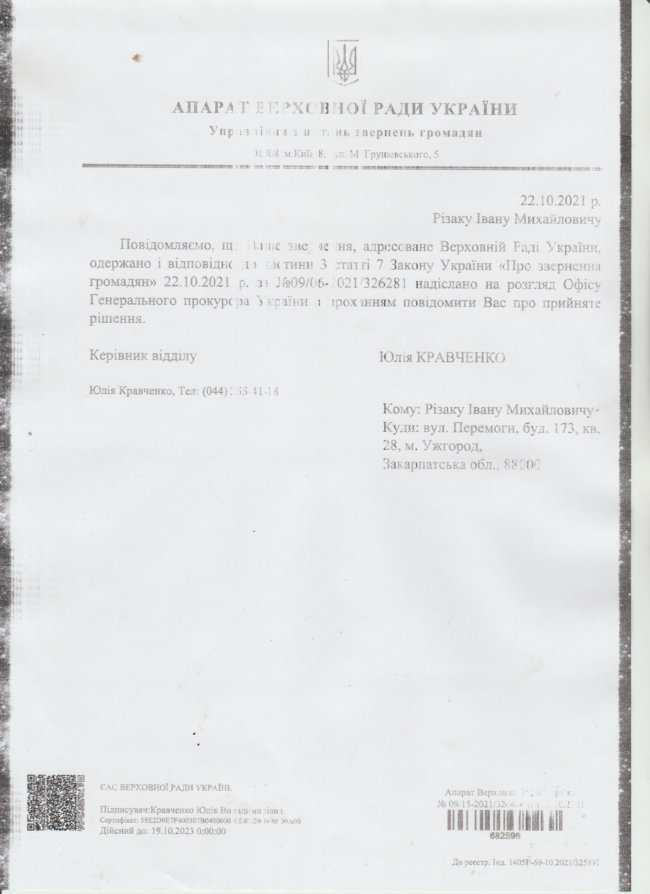 24.10. 2021. Відповідь Апарату Верховної Ради України