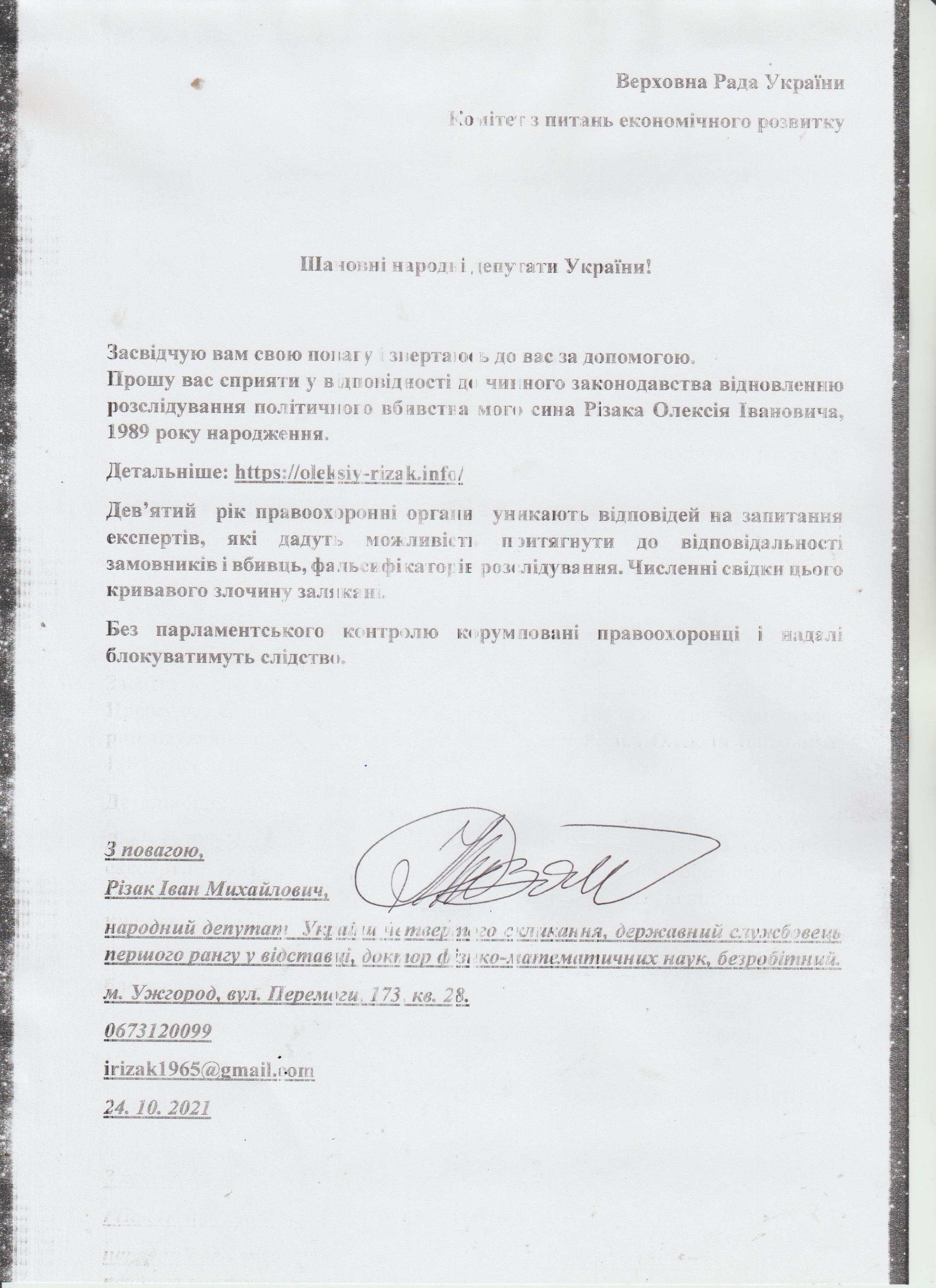 24.10.2021. Важливе звернення Івана Різака до Комітету Верховної ради України з питань економічного розвитку