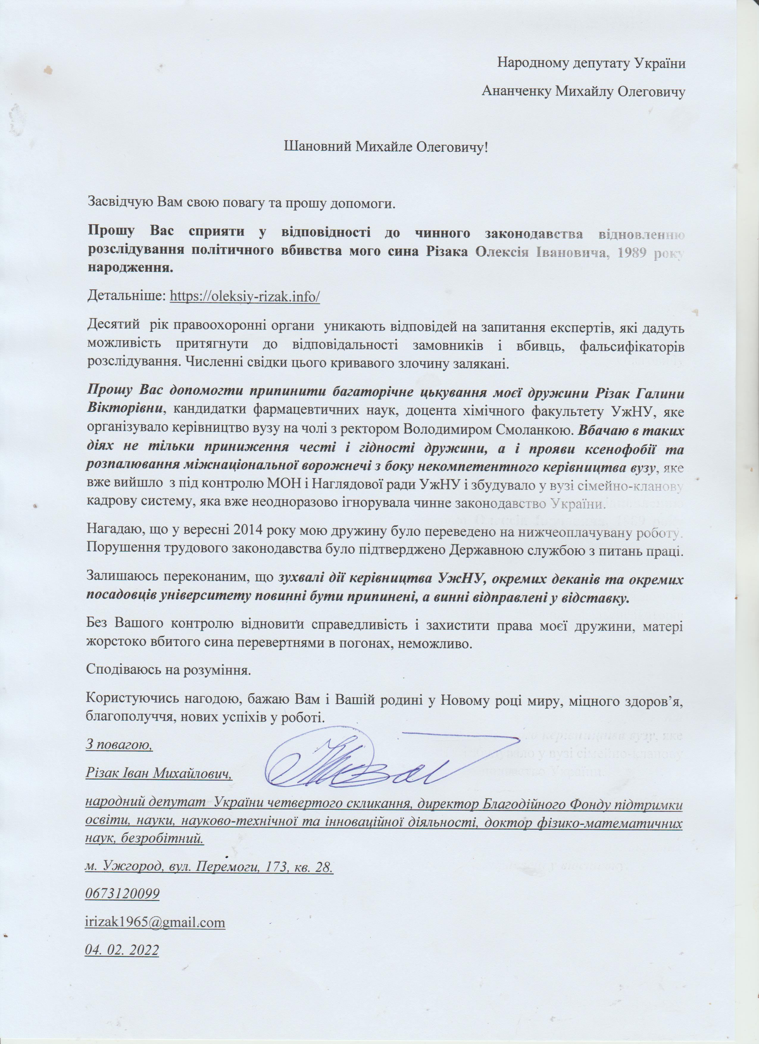 Звернення Івана Різака до Михайла Ананченка