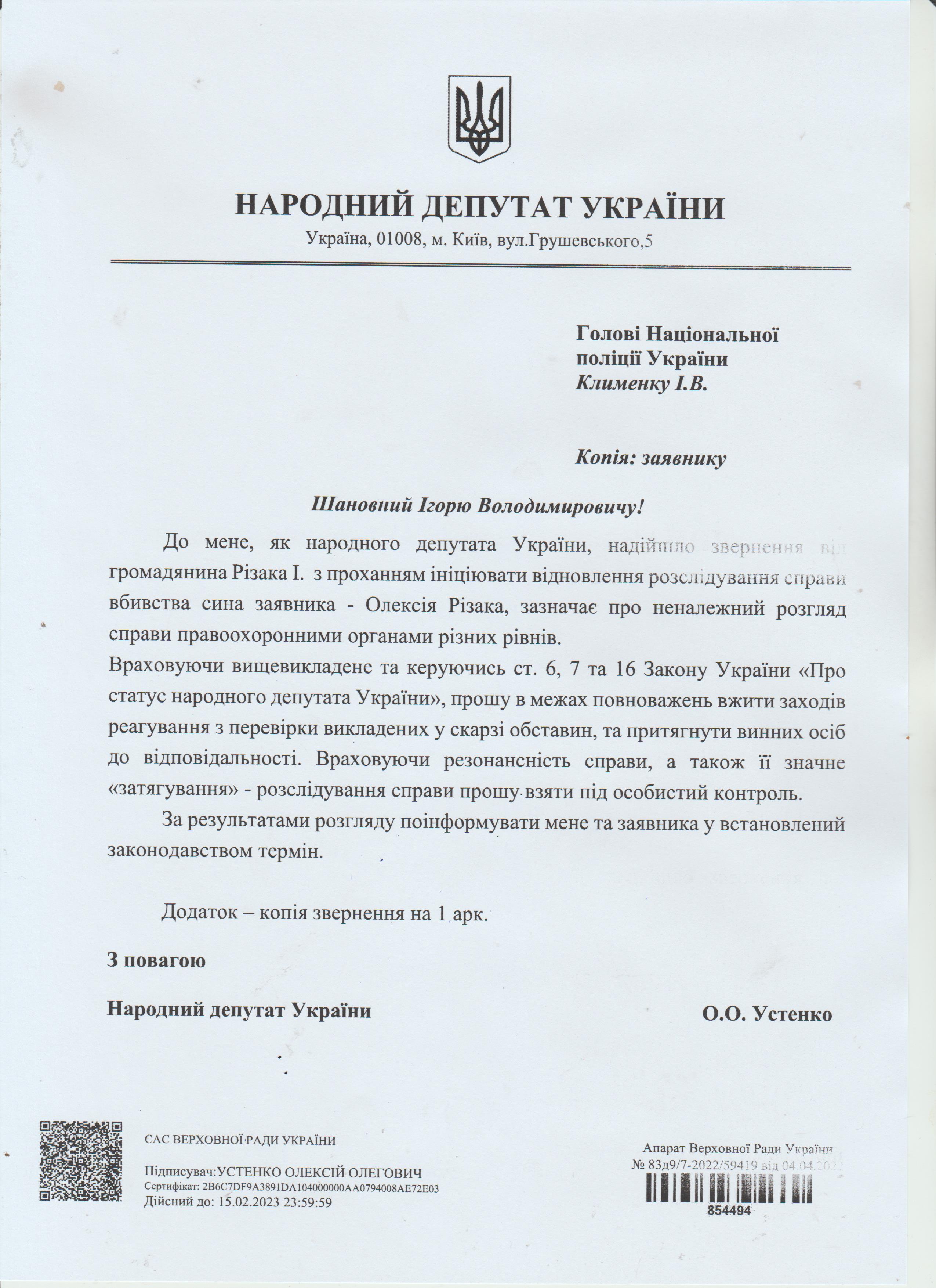04.04.2022. Дякуємо народному депутату України Олексію Устенку за реагування на звернення Івана Різака!
