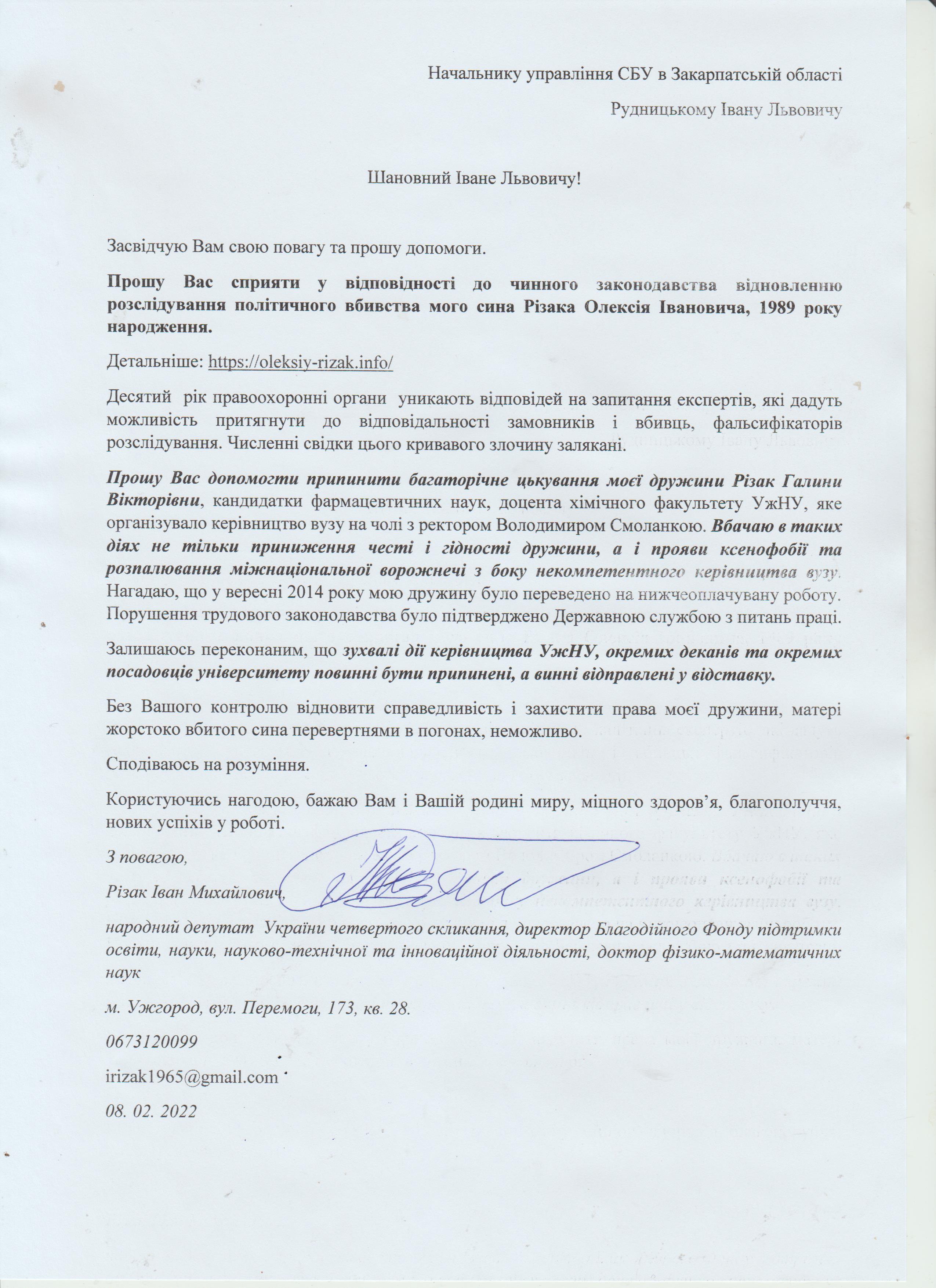 Шановні Анатолію Леонідовичу, Василю Дмитровичу, Василю Миколайовичу! Звертаюся до Вас як батько, як колишній керівник області, як простий житель цього краю, який хоче, щоб на цій землі ніколи не проливалася кров наших рідних, знайомих і близьких. Переконаний, що у політичного керівництва держави є достатньо волі для того, щоб поставити на місце «безпредельщиков», які пробують дестабілізувати ситуацію у державі. Переконаний, що події на кшталт помаранчевого терору у 2005 роців області більше не повторяться. З глибокою повагою, Різак Іван Михайлович, що проживає за адресою м. Ужгород, вул. Капушанська, б.173 кв. 28, голова Закарпатської обласної державної адміністрації (вересень 2002р. – січень 2005р.), народний депутат IV скликання, державний службовець І рангу, багаторічний голова і член координаційного комітету по боротьбі з організованою злочинністю при ОДА, кандидат фізико-математичних наук, тимчасово непрацюючий.