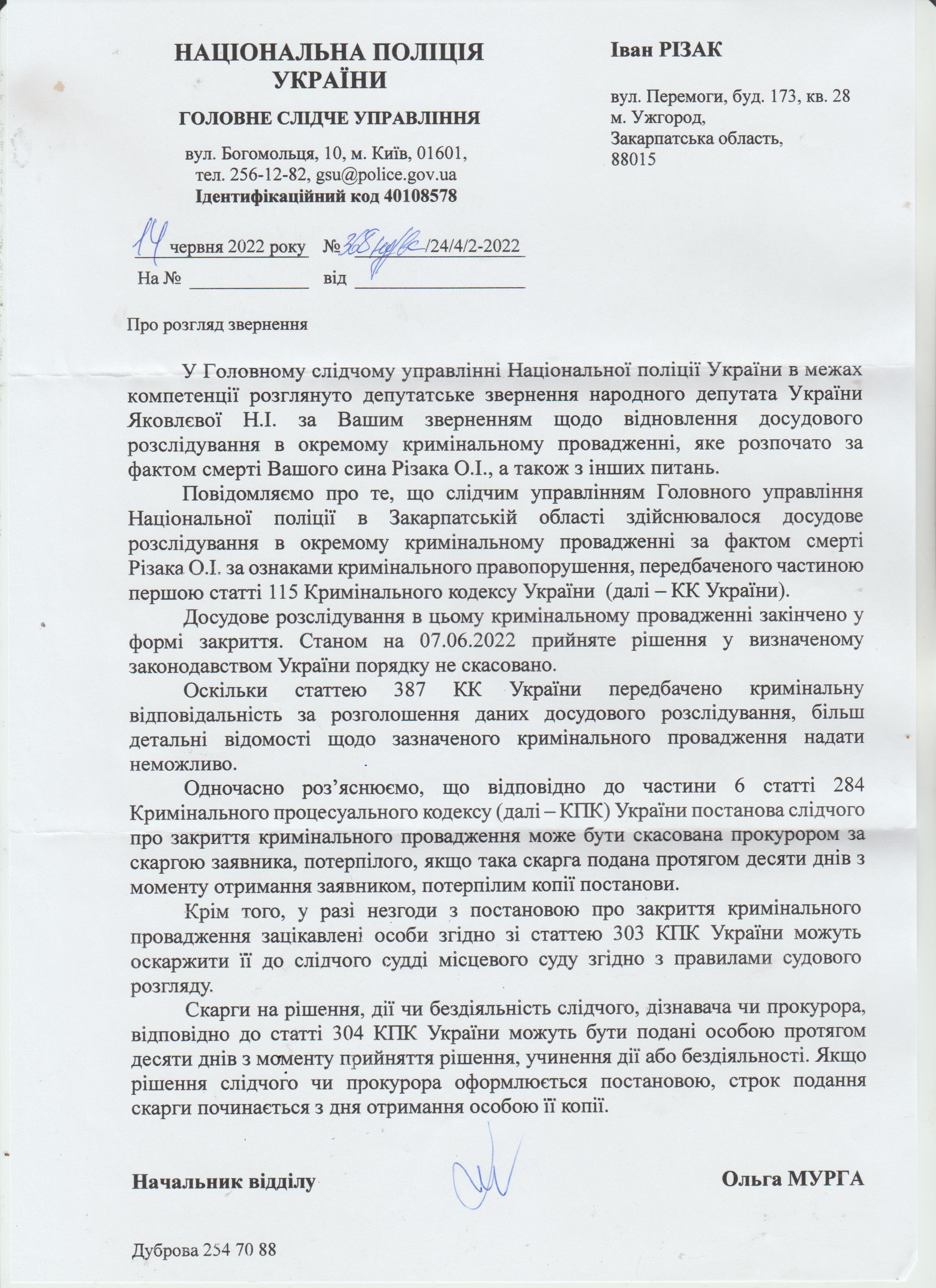 А у вищевказаному листі зазначено «У відповідності до вимог ст..ст.60,111 КПК України,повідомляю Вас, що досудове розслідування за фактом смерті Різака О.І., за ознаками кримінального правопорушення, передбаченого ч.1 ст.115 КК України, відомості про яке внесені до Єдиного реєстру досудових розслідувань за № 12012070030000012 від 21.12.2013 року закінчено. /.../26.12.2013 року кримінальне провадження № 12012070030000012 було закрито на підставі п.1 ч.1 ст.284 КК України.