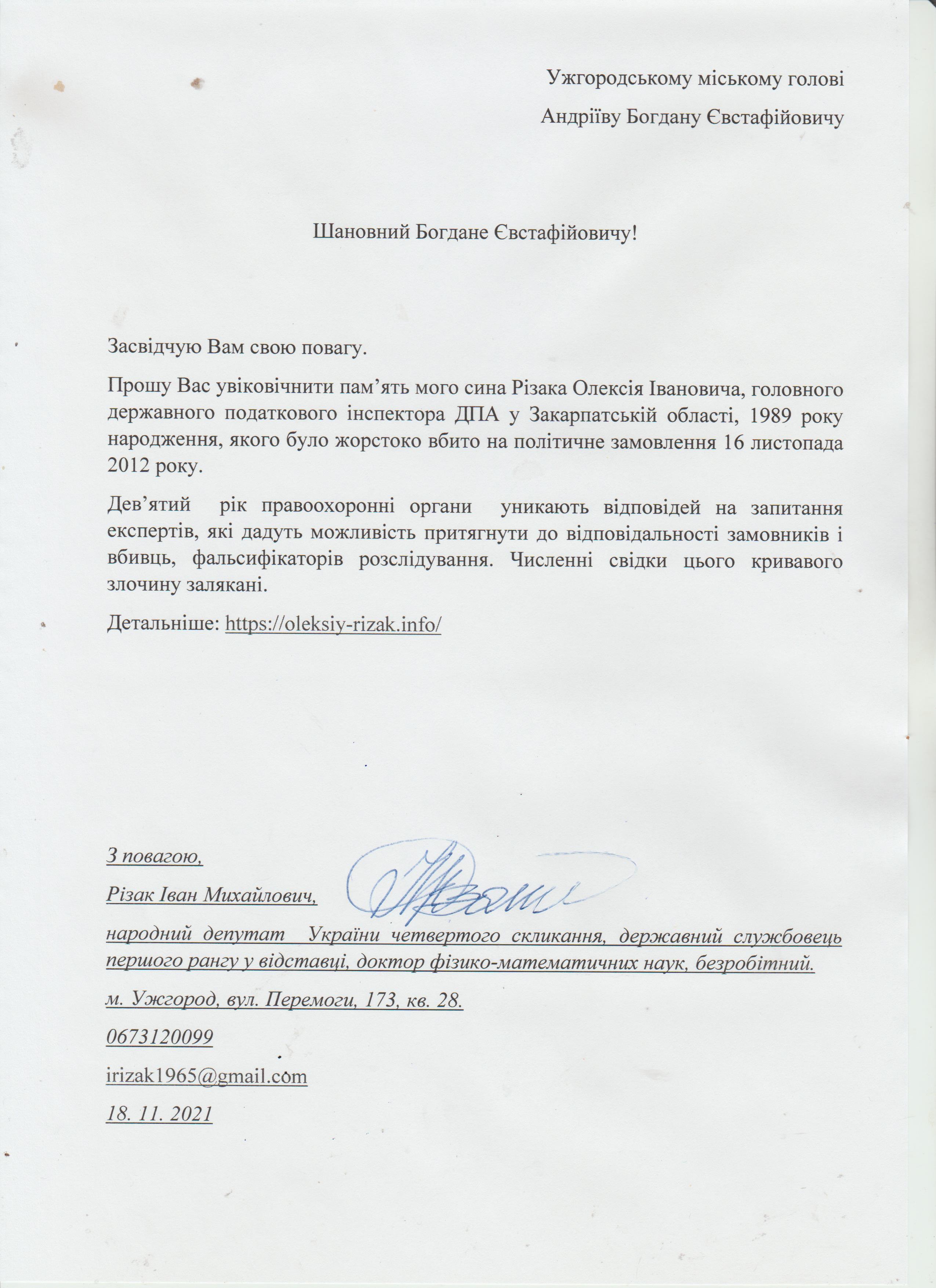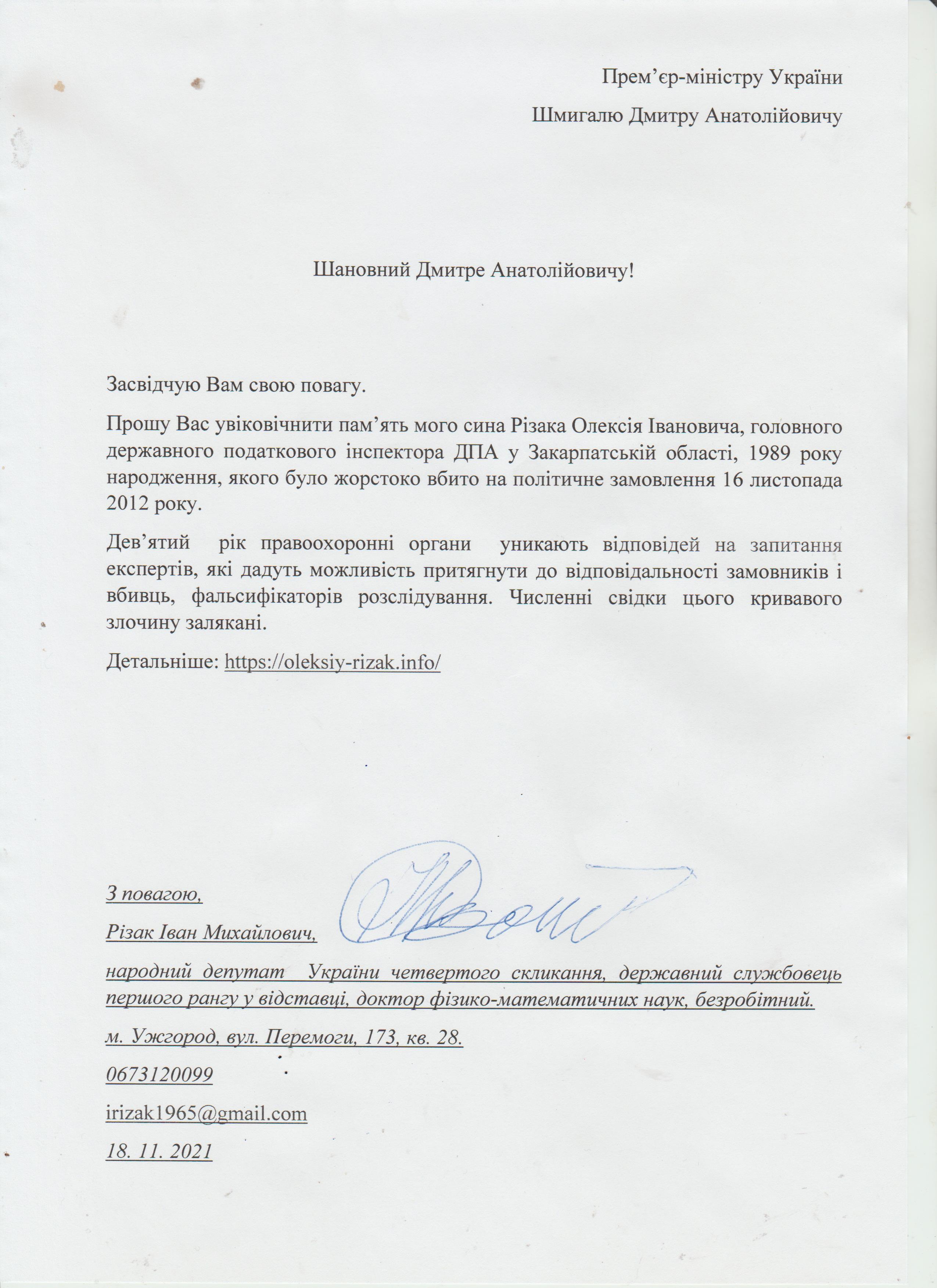 Це дає мені підстави говорити про те, що вбивство мого сина – чітко спланована спецоперація з відповідним інформаційним забезпеченням по своїм масштабам схожа на гебельсівську пропаганду. На час поширення цієї версії загибелі сина не було жодної, підкреслюю жодної, підстави говорити про самогубство, оскільки на той час слідчі не знайшли і сліду падіння з багатоповерхівки Олексія Різака, а також не провели жодної слідчої дії з громадянкою із-за «нещасливої» любові до якої мій син закінчив життя самогубством. Щиро прошу Вас, в найближчі години перекваліфікувати цю трагедію за статею КПК «вбивство» і всебічно, об’єктивно та системно провести відповідні слідчі дії для знаходження впливових замовників і звірів-вбивць мого рідного сина. Коротко Вас проінформую, що Різак Олексій Іванович, 1989 р.н., магістр фінансів (закінчив економічний факультет Харківського національного університету імені В.Н. Каразіна з відзнакою), магістр – юрист (закінчив магістратуру національного університету «Юридична академія України імені Ярослава Мудрого»), має військове звання – молодший лейтенант запасу, працював головним державним податковим інспектором першого рангу ДПС у Закарпатській області. Активно займався спортом. У свій час виступав за юнацьку збірну України з футболу, професійний клуб ФК «Закарпаття». На сьогоднішній день виступав за збірну ДПС у Закарпатській області, щоденно займався фізкультурою (для прикладу скажу, щоранку віджимався до 500 разів, а кількість ранкових стрибків на скакалці сягала 2000 разів, разом зі мною освоював східні єдиноборства), мав щирі відносини із дівчиною, колегами по роботі, був серйозним і відповідальним фахівцем. Додам також, що за півтори години до знаходження його тіла я спілкувався з ним особисто по телефону і обговорював подробиці матчу чемпіонату Італії з футболу Мілан – Фіорентина, під час цієї розмови ми обговорили майбутню поїздку у Київ, а також похід у гості до знайомих. Переконаний, нічого не могло статися за ці півтори години після нашої доброї розмови з почуттям гумору і присутності його дівчини, якій я передав вітання.