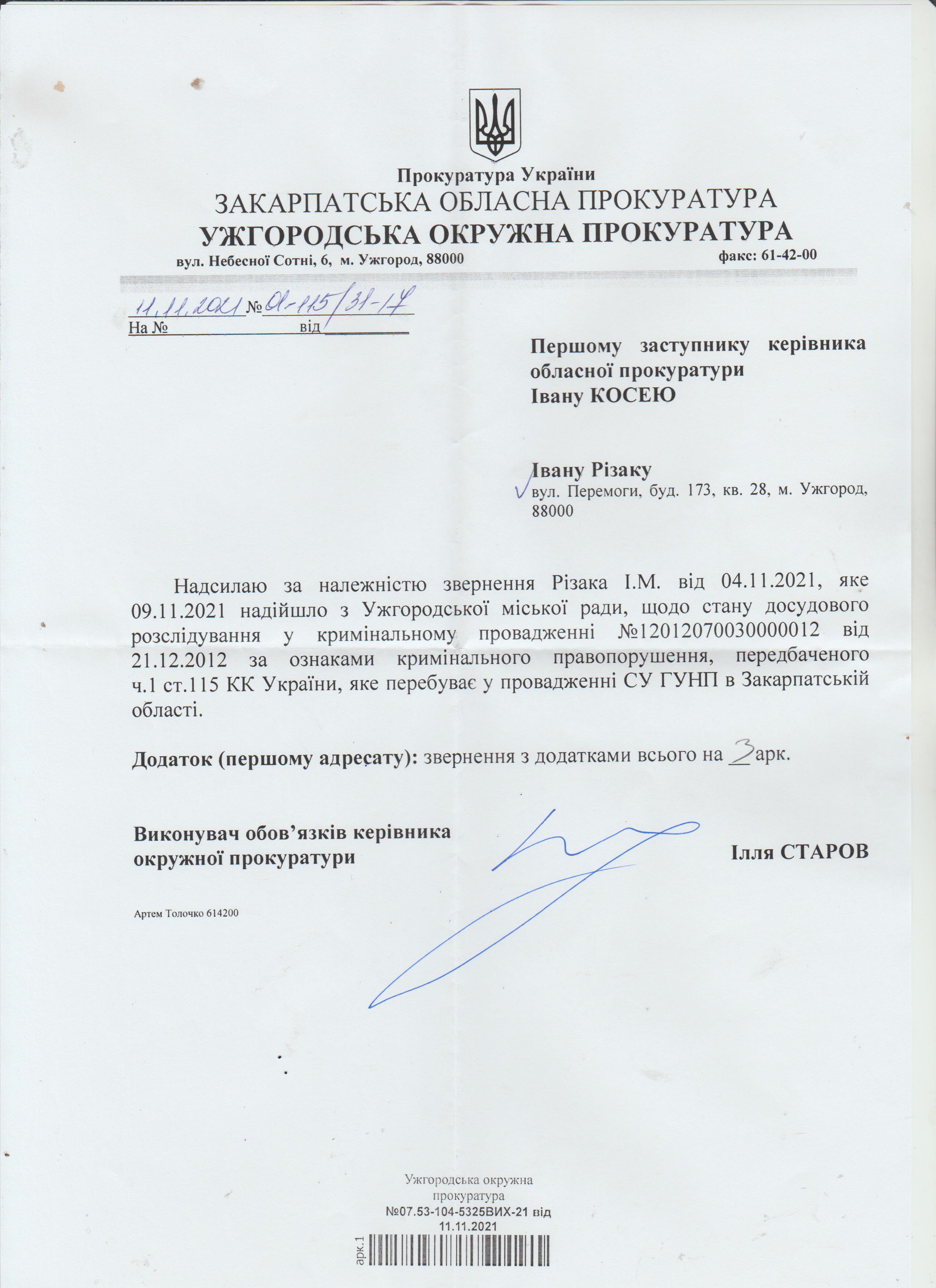 Згідно з листом старшого слідчого СУ УМВС України в Закарпатській області майора міліції Лазаря О.Ю. № 7/5930 від 27.12.2013 року, постановою про закриття кримінального провадження від 26 грудня 2013 року (далі за текстом – «Постанова») на підставі п.1 ч.1 ст.284 КПК України закрито кримінальне провадження № 12012070030000012 за фактом вбивства Різака О.І., за ознаками кримінального правопорушення, передбаченого ч.1 ст.115 КК України.
