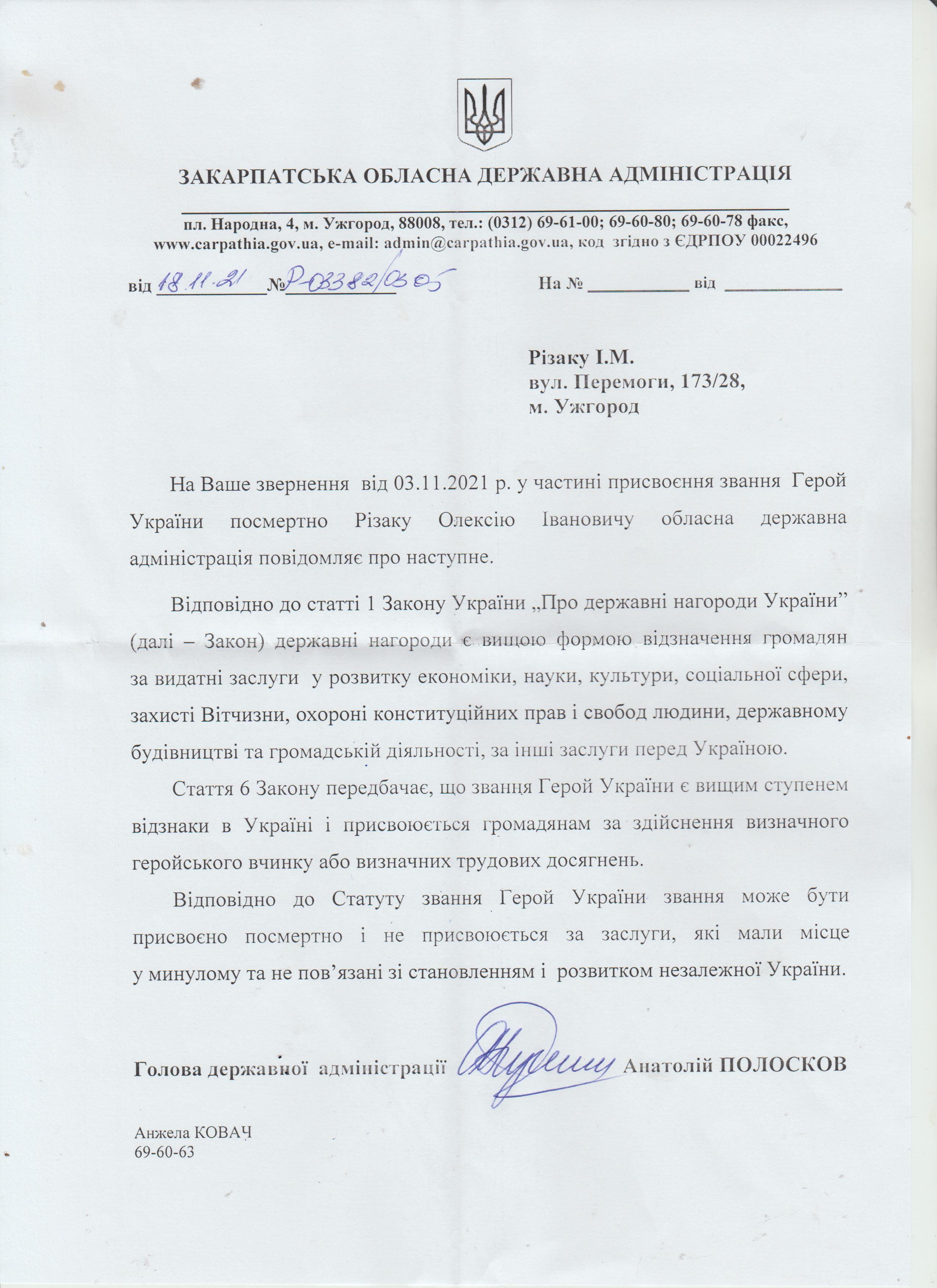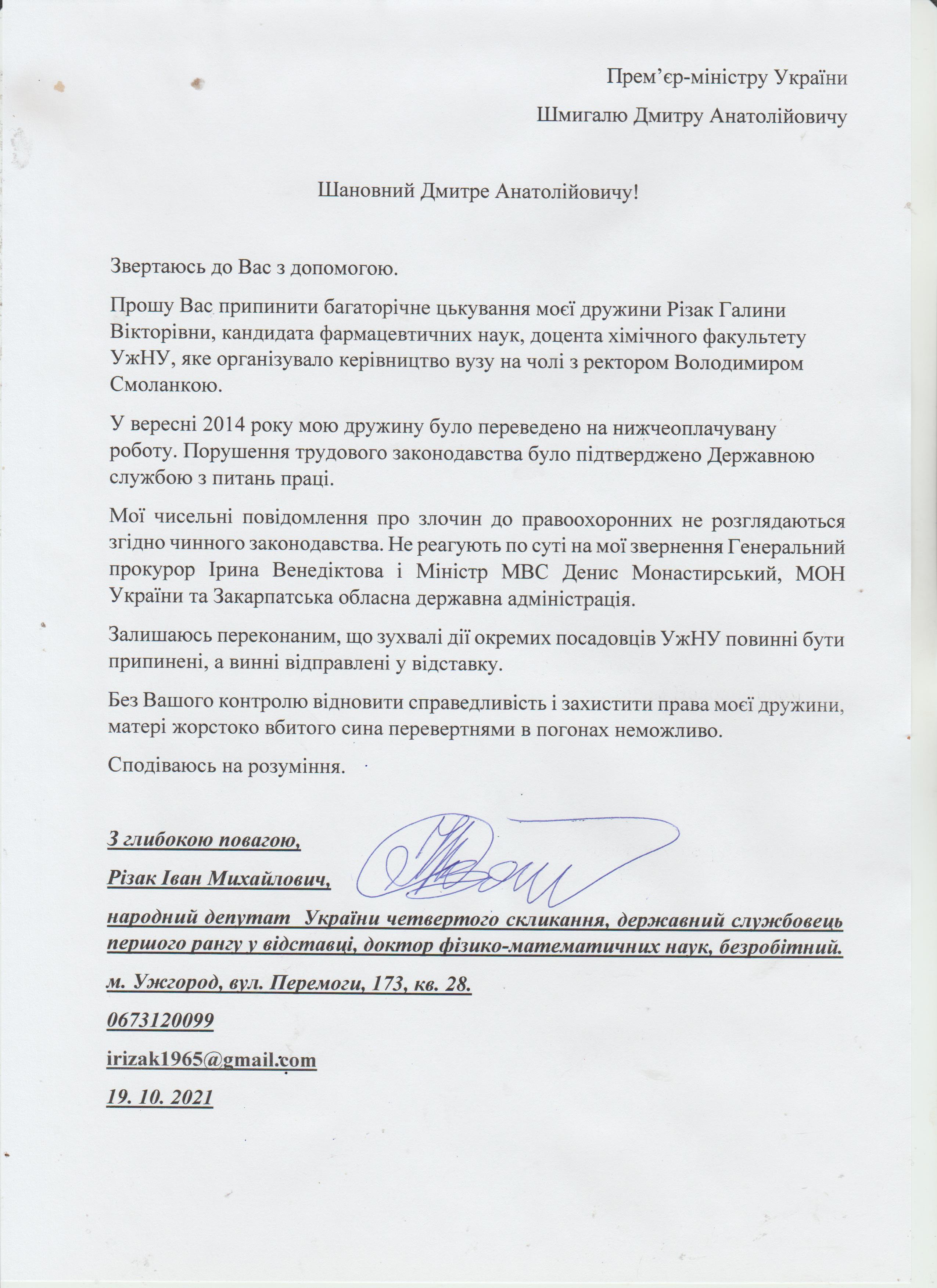 Шановні Анатолію Леонідовичу, Василю Дмитровичу, Василю Миколайовичу! Звертаюся до Вас як батько, як колишній керівник області, як простий житель цього краю, який хоче, щоб на цій землі ніколи не проливалася кров наших рідних, знайомих і близьких. Переконаний, що у політичного керівництва держави є достатньо волі для того, щоб поставити на місце «безпредельщиков», які пробують дестабілізувати ситуацію у державі. Переконаний, що події на кшталт помаранчевого терору у 2005 роців області більше не повторяться. З глибокою повагою, Різак Іван Михайлович, що проживає за адресою м. Ужгород, вул. Капушанська, б.173 кв. 28, голова Закарпатської обласної державної адміністрації (вересень 2002р. – січень 2005р.), народний депутат IV скликання, державний службовець І рангу, багаторічний голова і член координаційного комітету по боротьбі з організованою злочинністю при ОДА, кандидат фізико-математичних наук, тимчасово непрацюючий.