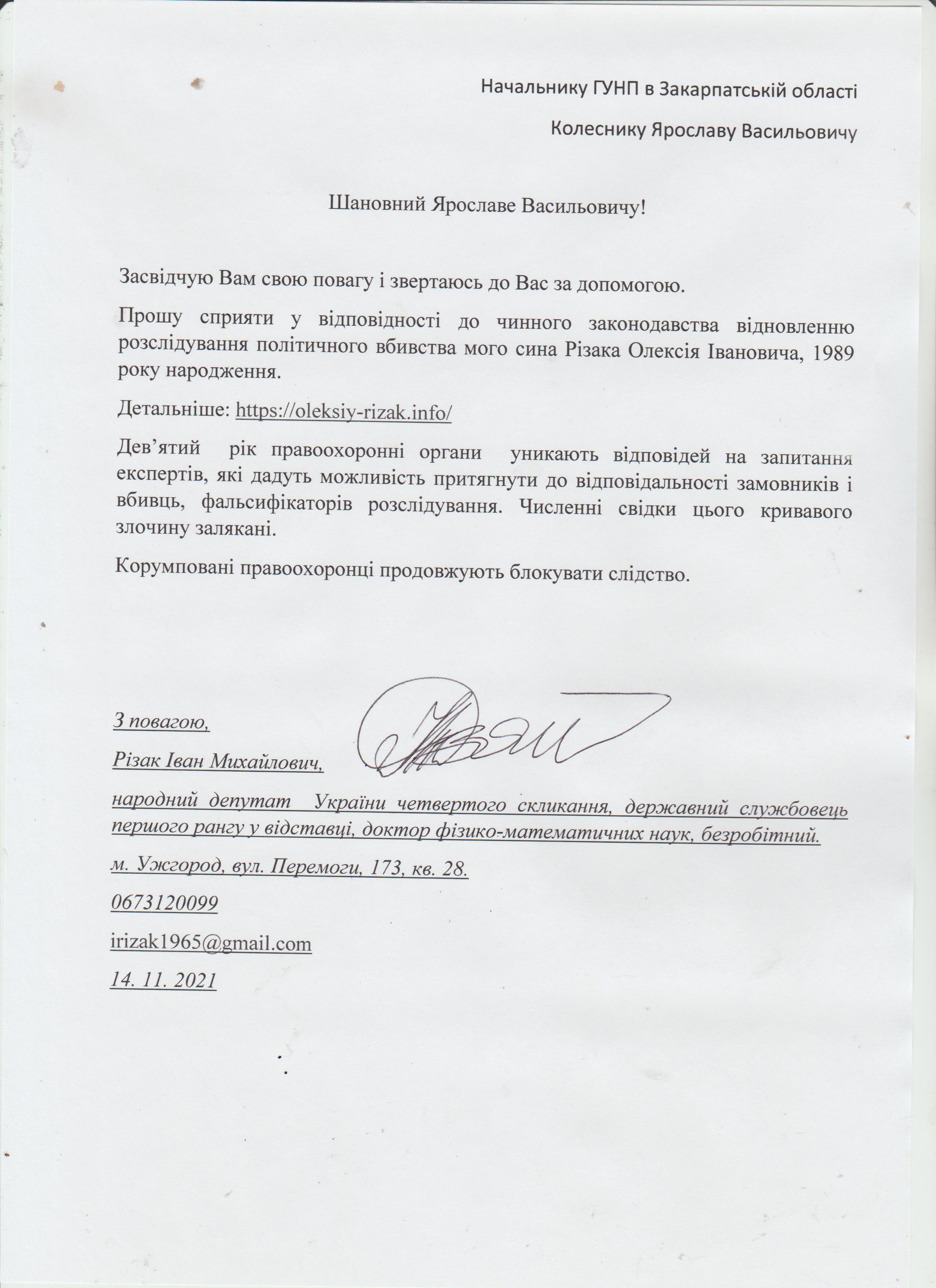 З метою сприяння слідству, а також всебічно об’єктивного розслідування справи прошу Вас доручити своїм підлеглим перевірити наступні питання: 1) чи міг володіти працівник ДПС в Закарпатській області Олексій Різак якоюсь інформацією про тіньовий та кримінальний бізнес в області, знання якої загрожувало б його життю? 2) перевірити у відповідних державних органах наявність у Різака Олексія Івановича та його близьких родичів майна, фінансів, земельних ділянок, підприємств, бізнесу, акцій, облігацій та інших цінних паперів, володіння якими могло б потенційно загрожувати його життю з боку конкурентів та інших співвласників? 3) чи були у нього відносини з громадянкою чи її родичами такими, що могли серйозно впливати на його майновий, матеріальний та ін. стан. 4) чи залучались до спеціальної перевірки, яку потрібно проходити при зарахуванні на державну службу, підрозділи зовнішнього спостереження якоїсь із правоохоронних структур області (я стверджую, що з часу переїзду мене в Закарпаття за нами було встановлене тотальне зовнішнє спостереження)? 5) хотілося б дізнатися (думаю, що це не є слідчою таємницею) в який час і з допомогою якого транспорту 16 листопада 2012 року виїхав син від своєї дівчини, чи проводжала вона його сама або з близькими родичами, чи бачила щось підозріле і яким таксі він виїжджав додому? 6) хотілося б також дізнатися хто першим побачив тіло вбитого юнака і повідомив швидку допомогу і міліцію? 7) з метою перевірки версії спроби отруєння сина Олексія, прошу дати на перевірку у спеціальну токсикологічну лабораторію результати трьох аналізів в «Астра-дія» і одного аналізу, проведеного в кардіодиспансері кілька тижнів тому.