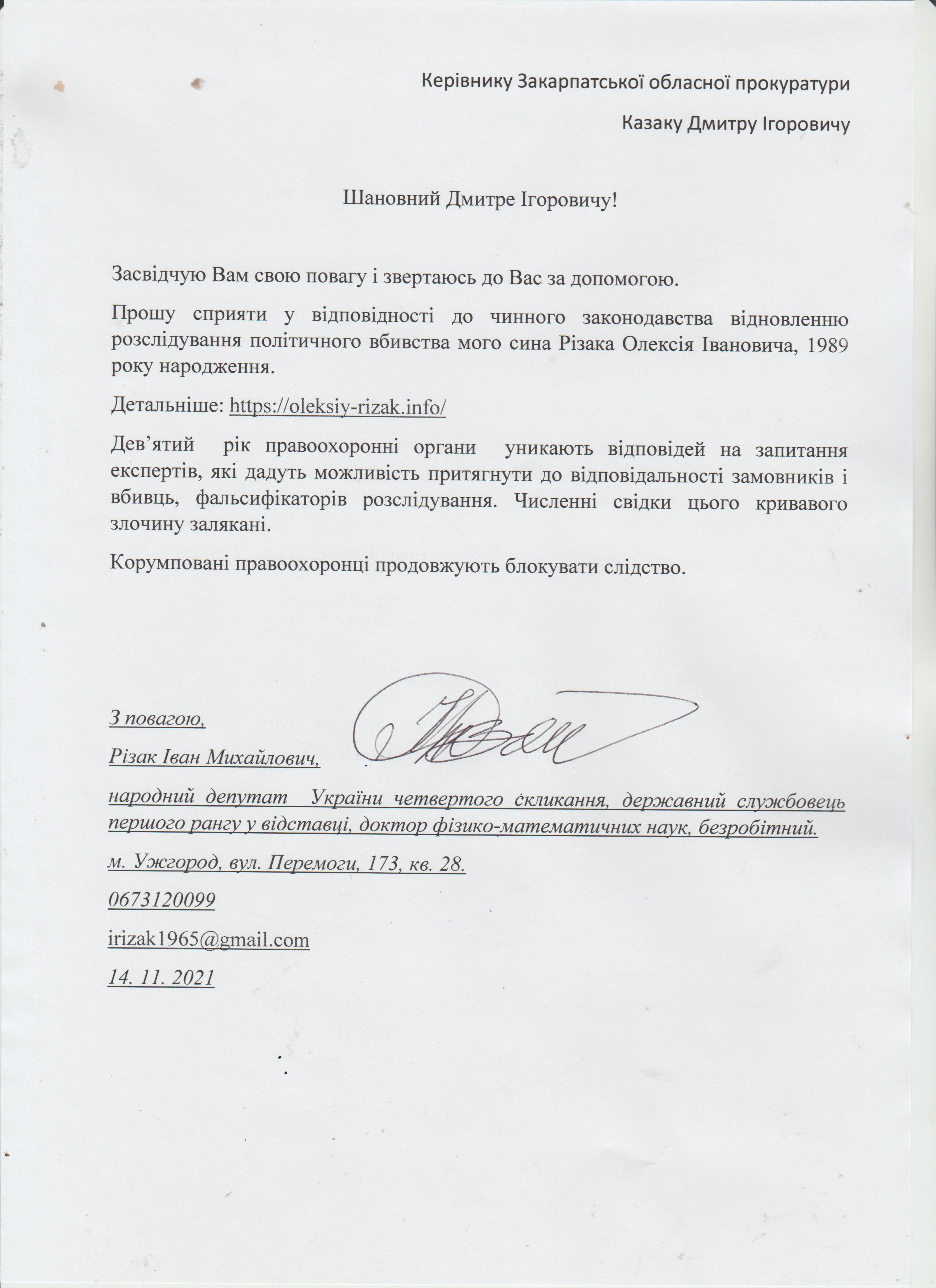 Шановні Анатолію Леонідовичу, Василю Дмитровичу, Василю Миколайовичу! Звертаюся до Вас як батько, як колишній керівник області, як простий житель цього краю, який хоче, щоб на цій землі ніколи не проливалася кров наших рідних, знайомих і близьких. Переконаний, що у політичного керівництва держави є достатньо волі для того, щоб поставити на місце «безпредельщиков», які пробують дестабілізувати ситуацію у державі. Переконаний, що події на кшталт помаранчевого терору у 2005 роців області більше не повторяться. З глибокою повагою, Різак Іван Михайлович, що проживає за адресою м. Ужгород, вул. Капушанська, б.173 кв. 28, голова Закарпатської обласної державної адміністрації (вересень 2002р. – січень 2005р.), народний депутат IV скликання, державний службовець І рангу, багаторічний голова і член координаційного комітету по боротьбі з організованою злочинністю при ОДА, кандидат фізико-математичних наук, тимчасово непрацюючий.