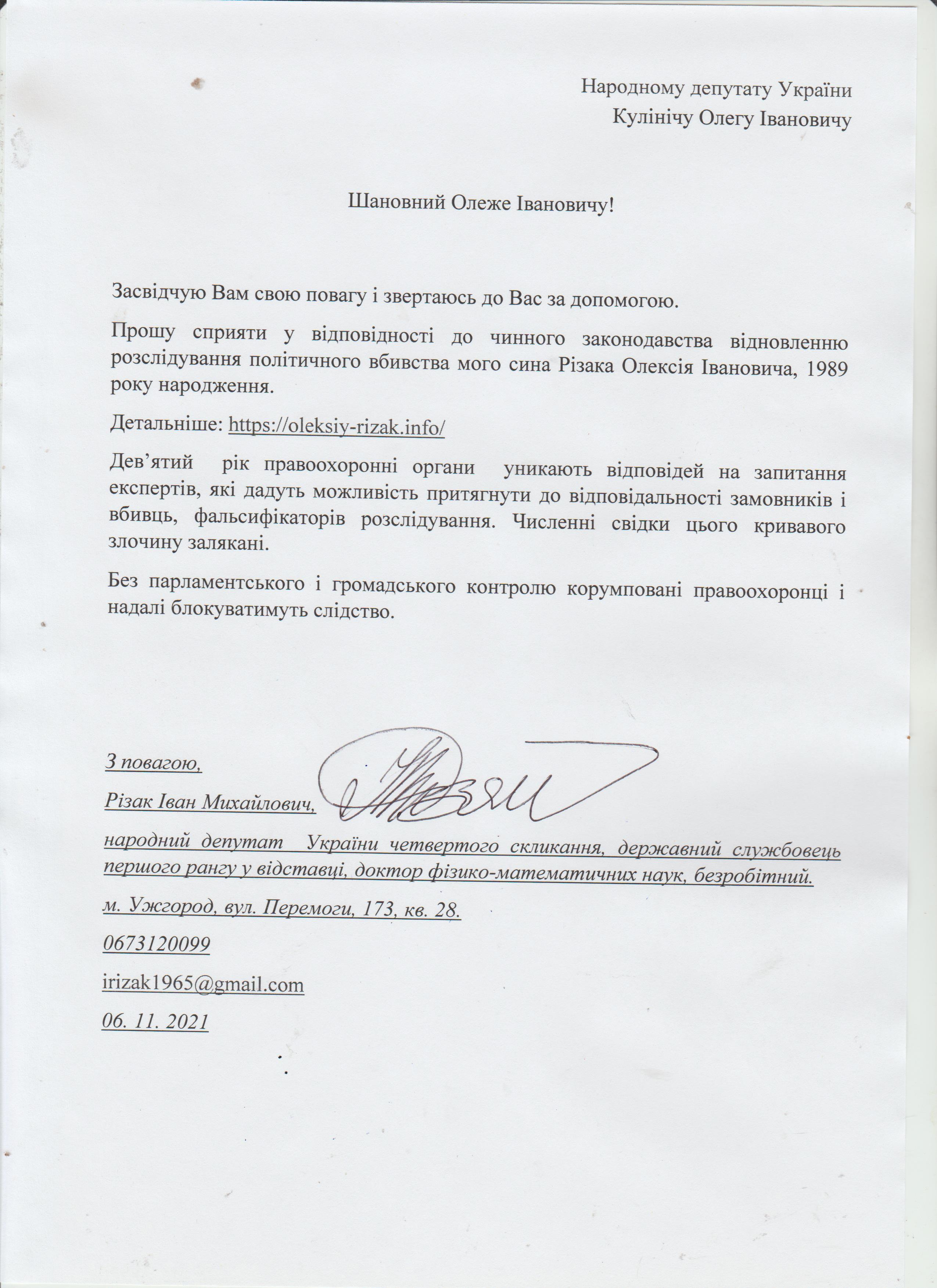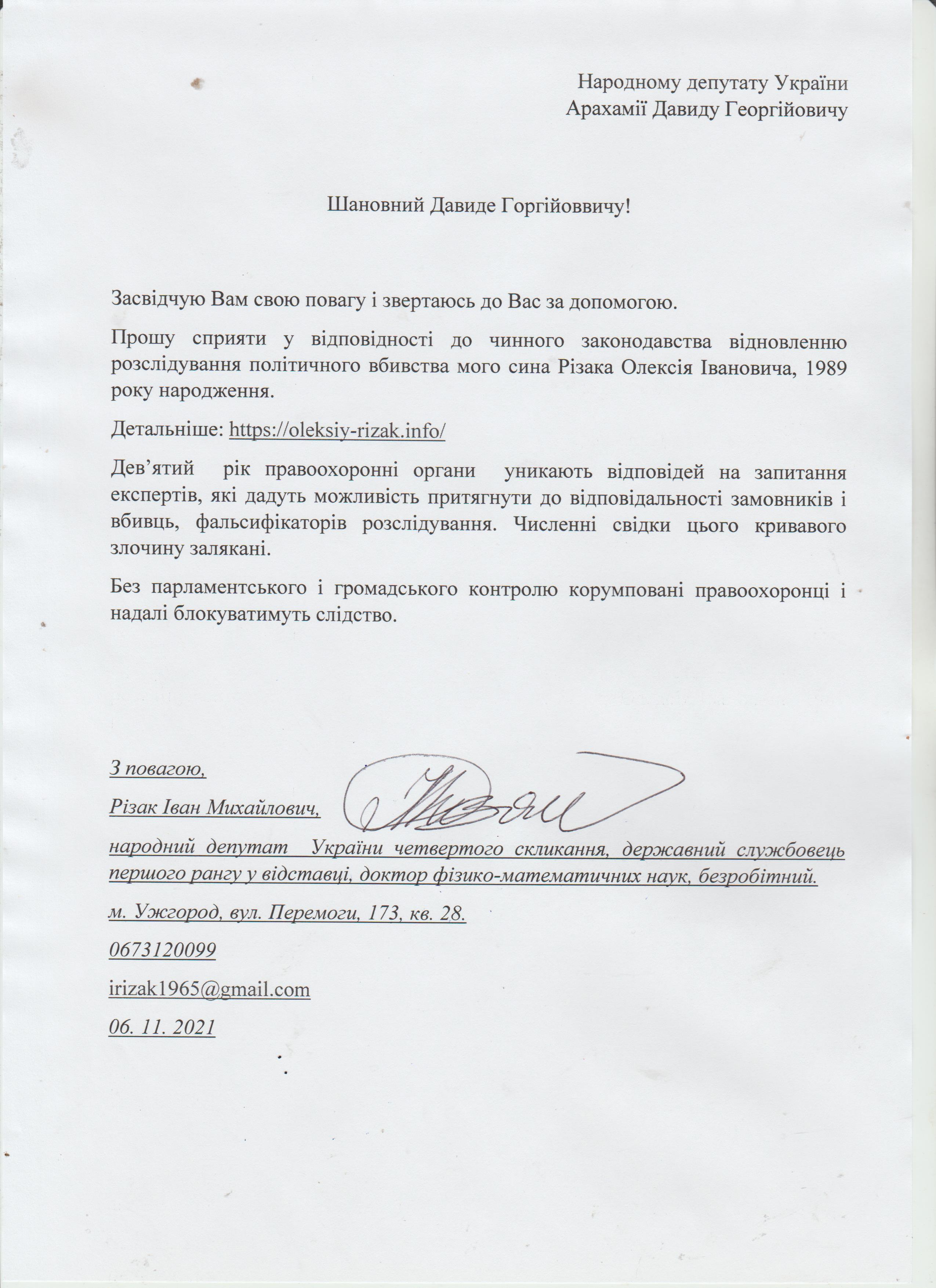 Шановні Анатолію Леонідовичу, Василю Дмитровичу, Василю Миколайовичу! Звертаюся до Вас як батько, як колишній керівник області, як простий житель цього краю, який хоче, щоб на цій землі ніколи не проливалася кров наших рідних, знайомих і близьких. Переконаний, що у політичного керівництва держави є достатньо волі для того, щоб поставити на місце «безпредельщиков», які пробують дестабілізувати ситуацію у державі. Переконаний, що події на кшталт помаранчевого терору у 2005 роців області більше не повторяться. З глибокою повагою, Різак Іван Михайлович, що проживає за адресою м. Ужгород, вул. Капушанська, б.173 кв. 28, голова Закарпатської обласної державної адміністрації (вересень 2002р. – січень 2005р.), народний депутат IV скликання, державний службовець І рангу, багаторічний голова і член координаційного комітету по боротьбі з організованою злочинністю при ОДА, кандидат фізико-математичних наук, тимчасово непрацюючий.