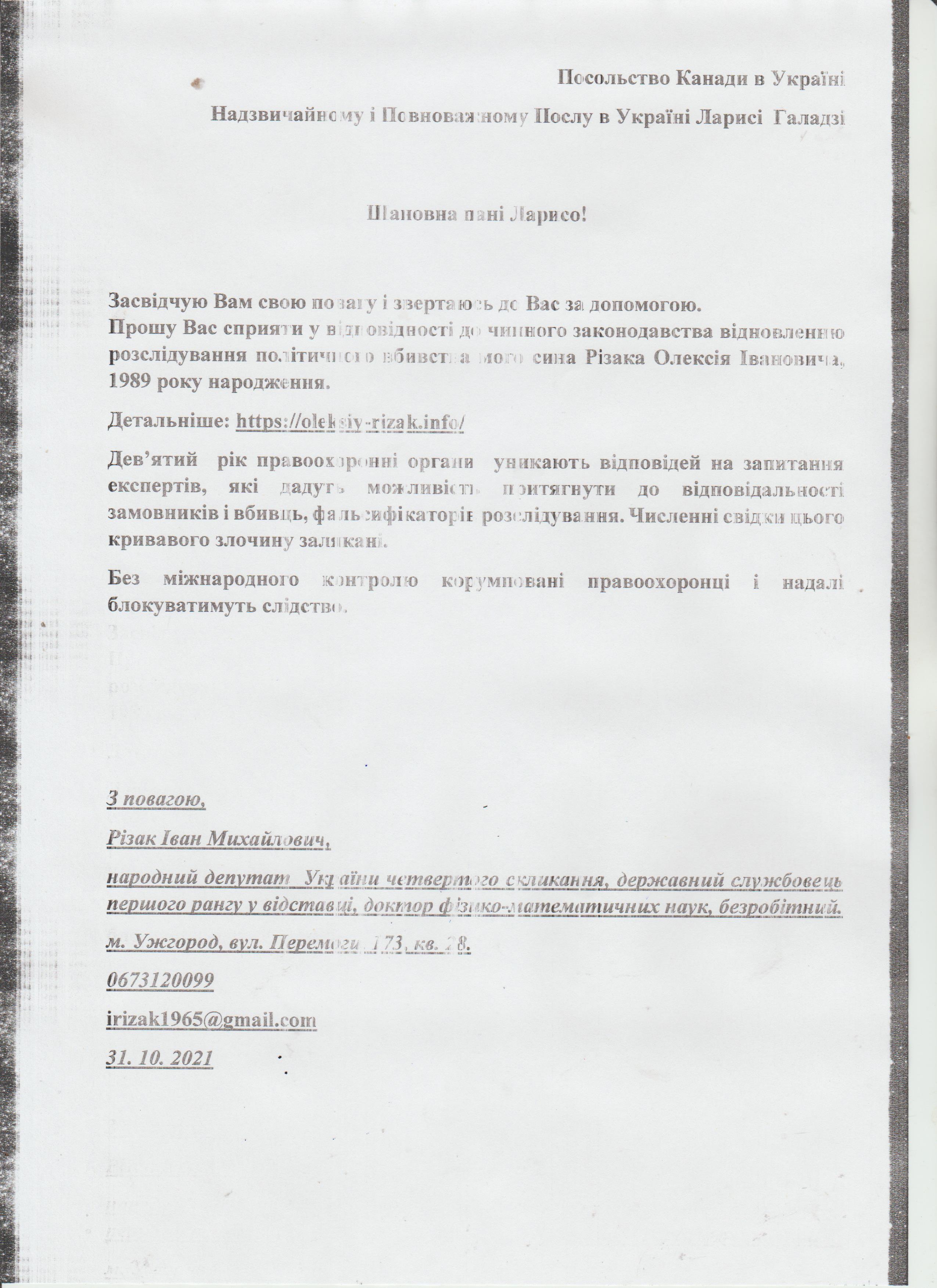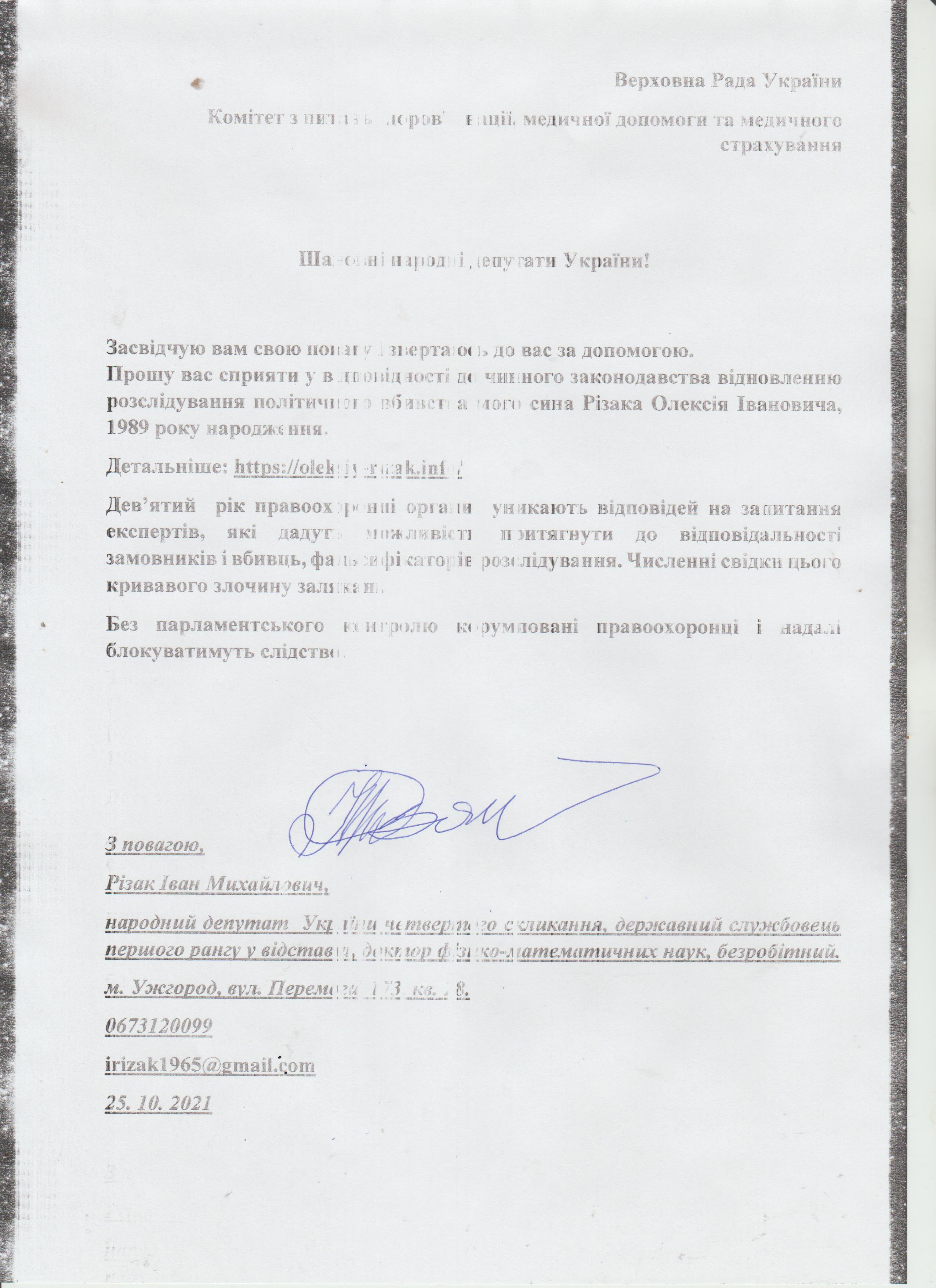 З метою сприяння слідству, а також всебічно об’єктивного розслідування справи прошу Вас доручити своїм підлеглим перевірити наступні питання: 1) чи міг володіти працівник ДПС в Закарпатській області Олексій Різак якоюсь інформацією про тіньовий та кримінальний бізнес в області, знання якої загрожувало б його життю? 2) перевірити у відповідних державних органах наявність у Різака Олексія Івановича та його близьких родичів майна, фінансів, земельних ділянок, підприємств, бізнесу, акцій, облігацій та інших цінних паперів, володіння якими могло б потенційно загрожувати його життю з боку конкурентів та інших співвласників? 3) чи були у нього відносини з громадянкою чи її родичами такими, що могли серйозно впливати на його майновий, матеріальний та ін. стан. 4) чи залучались до спеціальної перевірки, яку потрібно проходити при зарахуванні на державну службу, підрозділи зовнішнього спостереження якоїсь із правоохоронних структур області (я стверджую, що з часу переїзду мене в Закарпаття за нами було встановлене тотальне зовнішнє спостереження)? 5) хотілося б дізнатися (думаю, що це не є слідчою таємницею) в який час і з допомогою якого транспорту 16 листопада 2012 року виїхав син від своєї дівчини, чи проводжала вона його сама або з близькими родичами, чи бачила щось підозріле і яким таксі він виїжджав додому? 6) хотілося б також дізнатися хто першим побачив тіло вбитого юнака і повідомив швидку допомогу і міліцію? 7) з метою перевірки версії спроби отруєння сина Олексія, прошу дати на перевірку у спеціальну токсикологічну лабораторію результати трьох аналізів в «Астра-дія» і одного аналізу, проведеного в кардіодиспансері кілька тижнів тому.