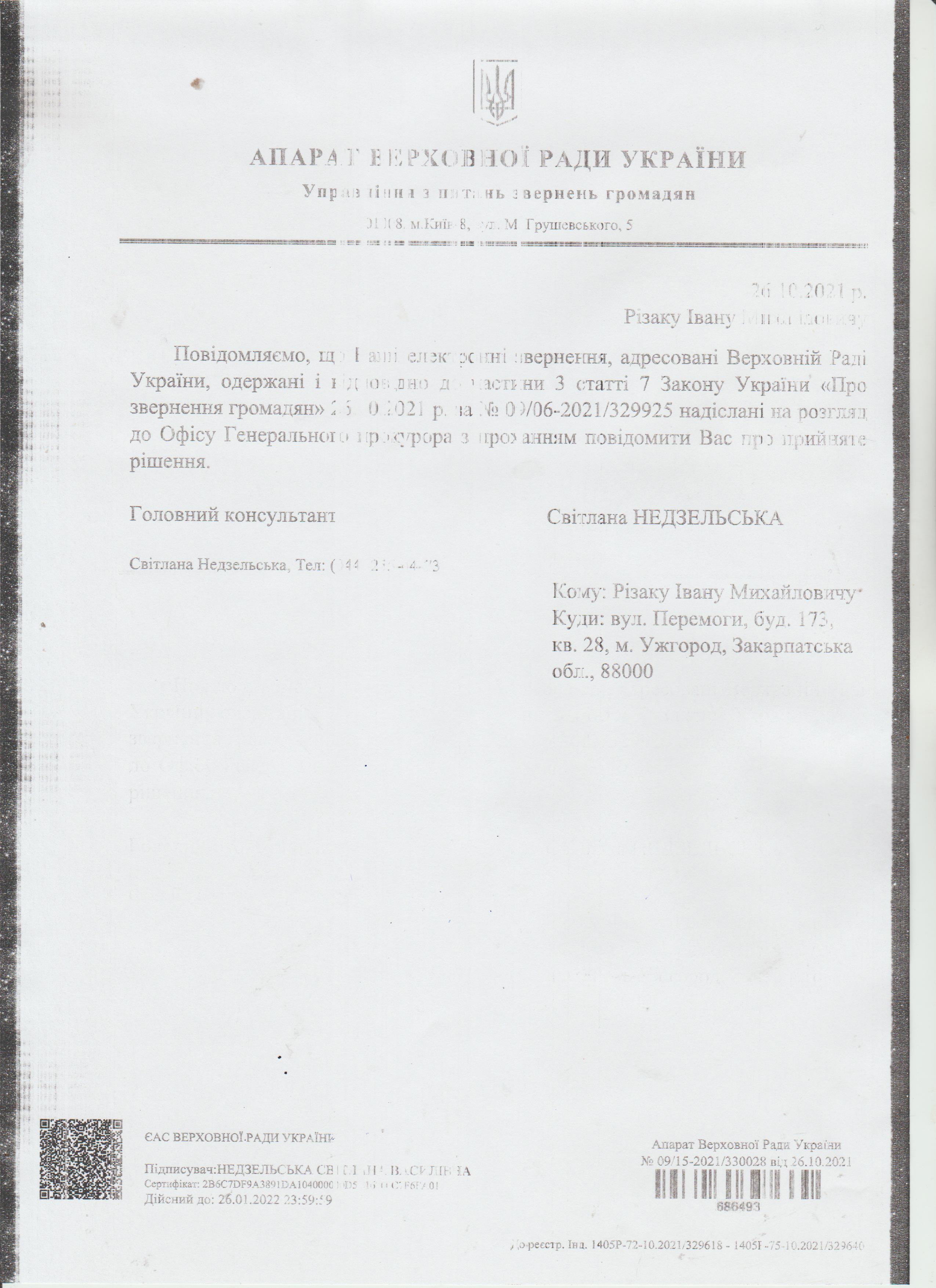 Шановні Анатолію Леонідовичу, Василю Дмитровичу, Василю Миколайовичу! Звертаюся до Вас як батько, як колишній керівник області, як простий житель цього краю, який хоче, щоб на цій землі ніколи не проливалася кров наших рідних, знайомих і близьких. Переконаний, що у політичного керівництва держави є достатньо волі для того, щоб поставити на місце «безпредельщиков», які пробують дестабілізувати ситуацію у державі. Переконаний, що події на кшталт помаранчевого терору у 2005 роців області більше не повторяться. З глибокою повагою, Різак Іван Михайлович, що проживає за адресою м. Ужгород, вул. Капушанська, б.173 кв. 28, голова Закарпатської обласної державної адміністрації (вересень 2002р. – січень 2005р.), народний депутат IV скликання, державний службовець І рангу, багаторічний голова і член координаційного комітету по боротьбі з організованою злочинністю при ОДА, кандидат фізико-математичних наук, тимчасово непрацюючий.