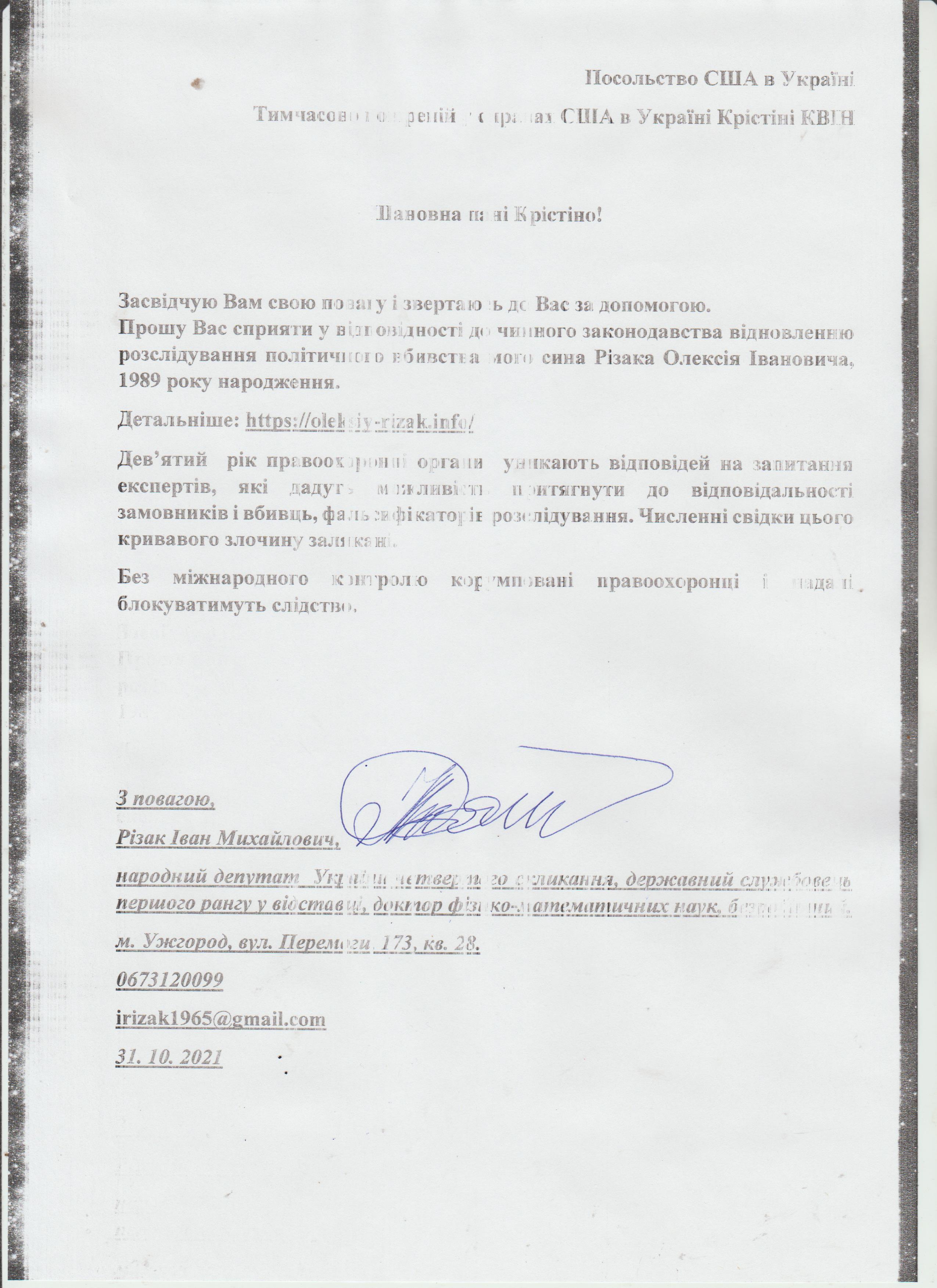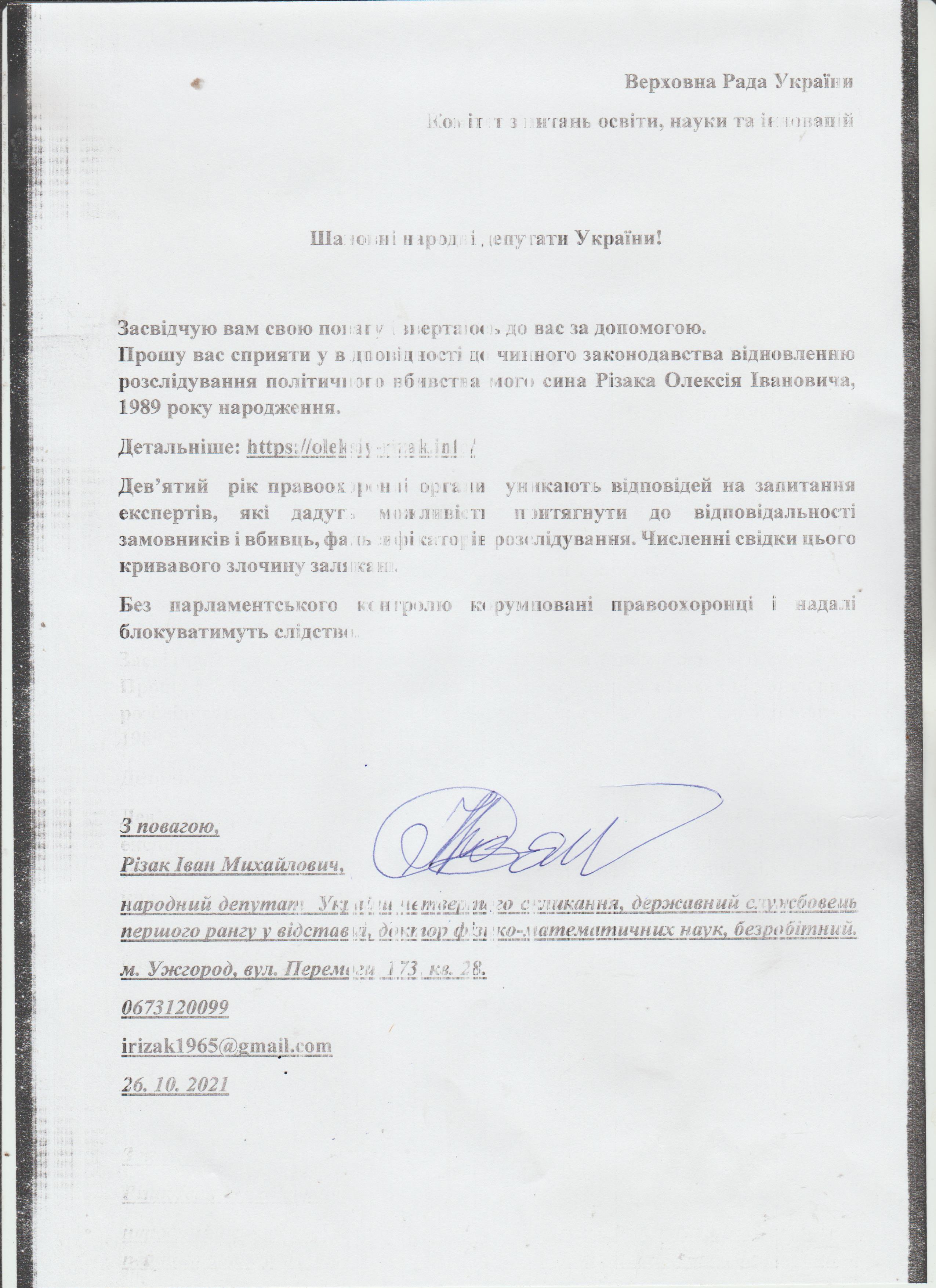 Це дає мені підстави говорити про те, що вбивство мого сина – чітко спланована спецоперація з відповідним інформаційним забезпеченням по своїм масштабам схожа на гебельсівську пропаганду. На час поширення цієї версії загибелі сина не було жодної, підкреслюю жодної, підстави говорити про самогубство, оскільки на той час слідчі не знайшли і сліду падіння з багатоповерхівки Олексія Різака, а також не провели жодної слідчої дії з громадянкою із-за «нещасливої» любові до якої мій син закінчив життя самогубством. Щиро прошу Вас, в найближчі години перекваліфікувати цю трагедію за статею КПК «вбивство» і всебічно, об’єктивно та системно провести відповідні слідчі дії для знаходження впливових замовників і звірів-вбивць мого рідного сина. Коротко Вас проінформую, що Різак Олексій Іванович, 1989 р.н., магістр фінансів (закінчив економічний факультет Харківського національного університету імені В.Н. Каразіна з відзнакою), магістр – юрист (закінчив магістратуру національного університету «Юридична академія України імені Ярослава Мудрого»), має військове звання – молодший лейтенант запасу, працював головним державним податковим інспектором першого рангу ДПС у Закарпатській області. Активно займався спортом. У свій час виступав за юнацьку збірну України з футболу, професійний клуб ФК «Закарпаття». На сьогоднішній день виступав за збірну ДПС у Закарпатській області, щоденно займався фізкультурою (для прикладу скажу, щоранку віджимався до 500 разів, а кількість ранкових стрибків на скакалці сягала 2000 разів, разом зі мною освоював східні єдиноборства), мав щирі відносини із дівчиною, колегами по роботі, був серйозним і відповідальним фахівцем. Додам також, що за півтори години до знаходження його тіла я спілкувався з ним особисто по телефону і обговорював подробиці матчу чемпіонату Італії з футболу Мілан – Фіорентина, під час цієї розмови ми обговорили майбутню поїздку у Київ, а також похід у гості до знайомих. Переконаний, нічого не могло статися за ці півтори години після нашої доброї розмови з почуттям гумору і присутності його дівчини, якій я передав вітання.