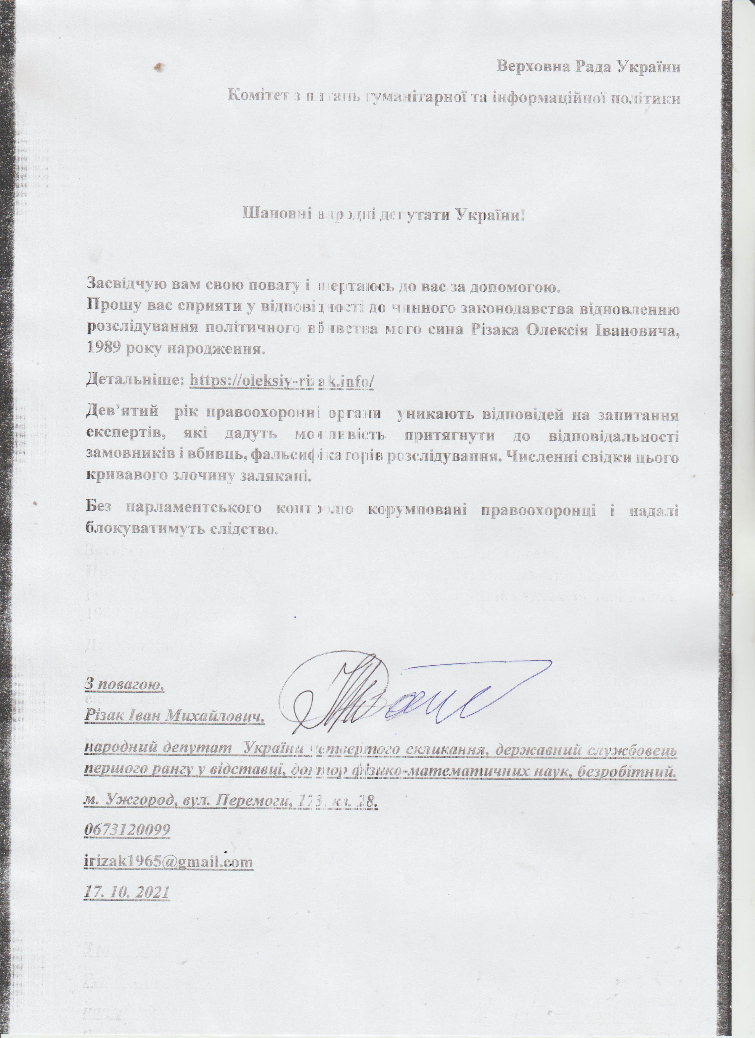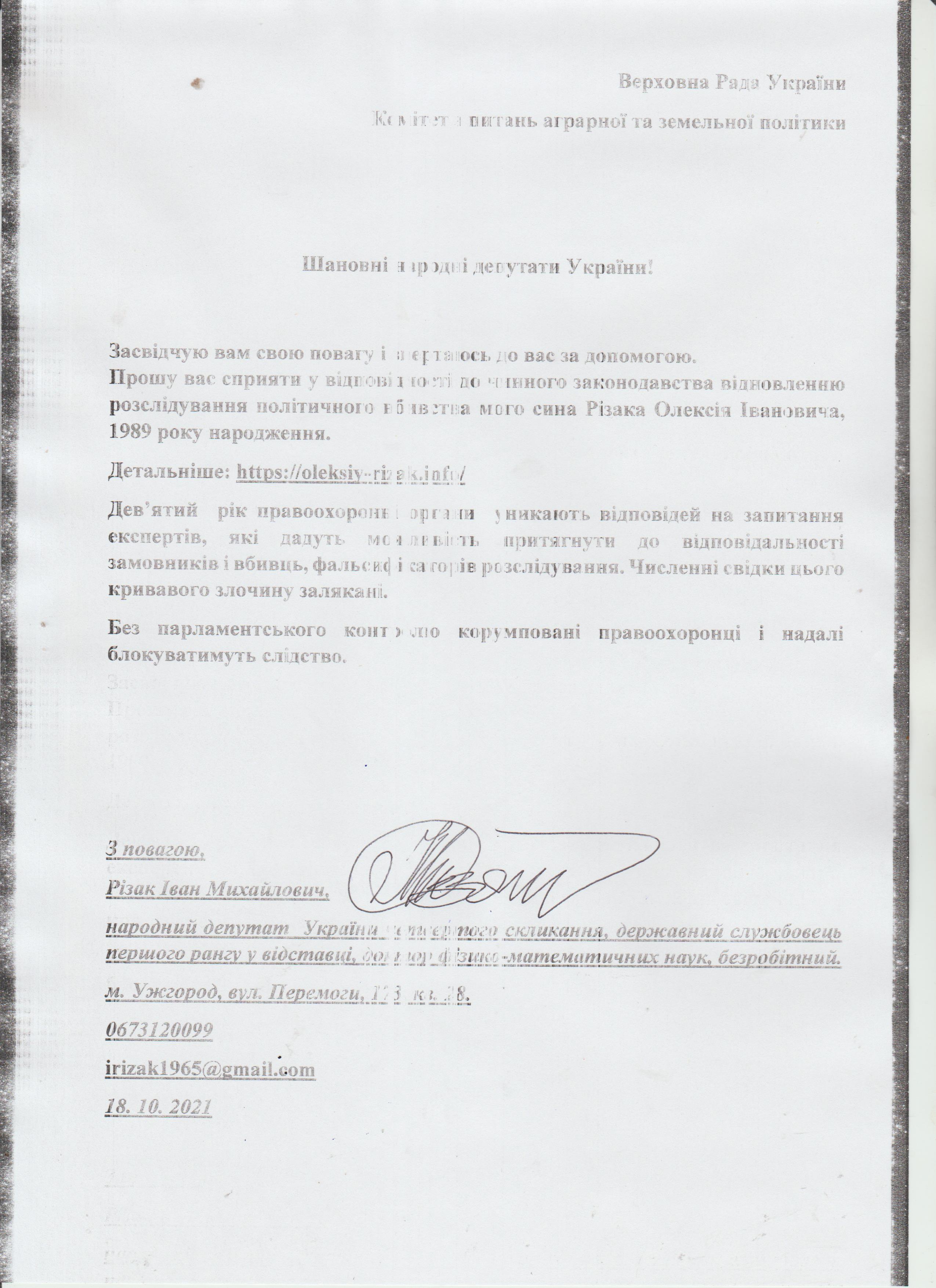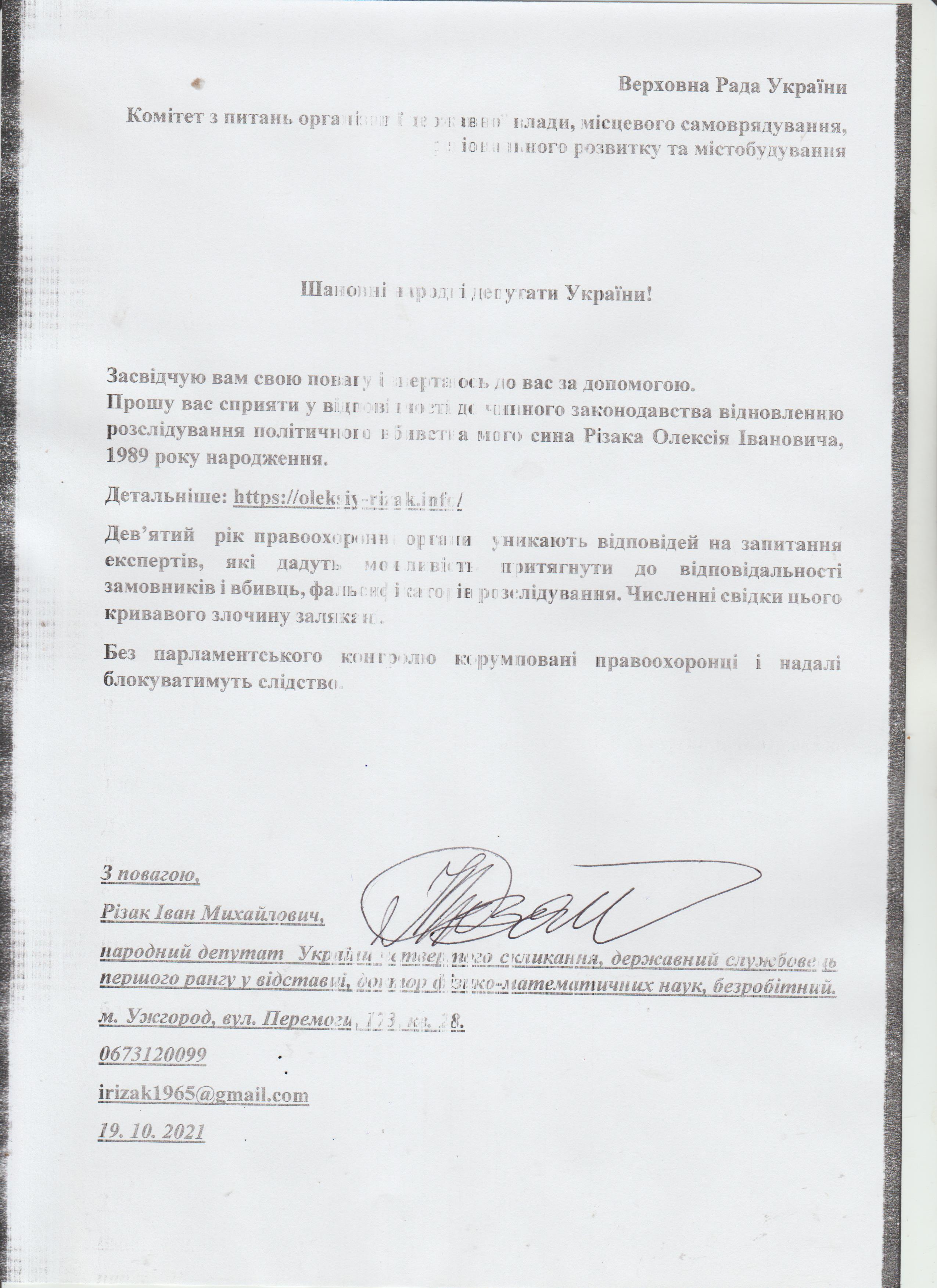 Звертаюся до Вас у зв’язку з тим,що близько двох тижнів тому при невідомих обставинах був убитий єдиний мій син – Олексій Іванович Різак, 1989 р.н. Перш за все, був дуже здивований повідомленням прес-центру УМВС в той же вечір, а також поширенням багатьма ЗМІ інформації про те, що основною причиною трагічної загибелі мого сина є самогубство.