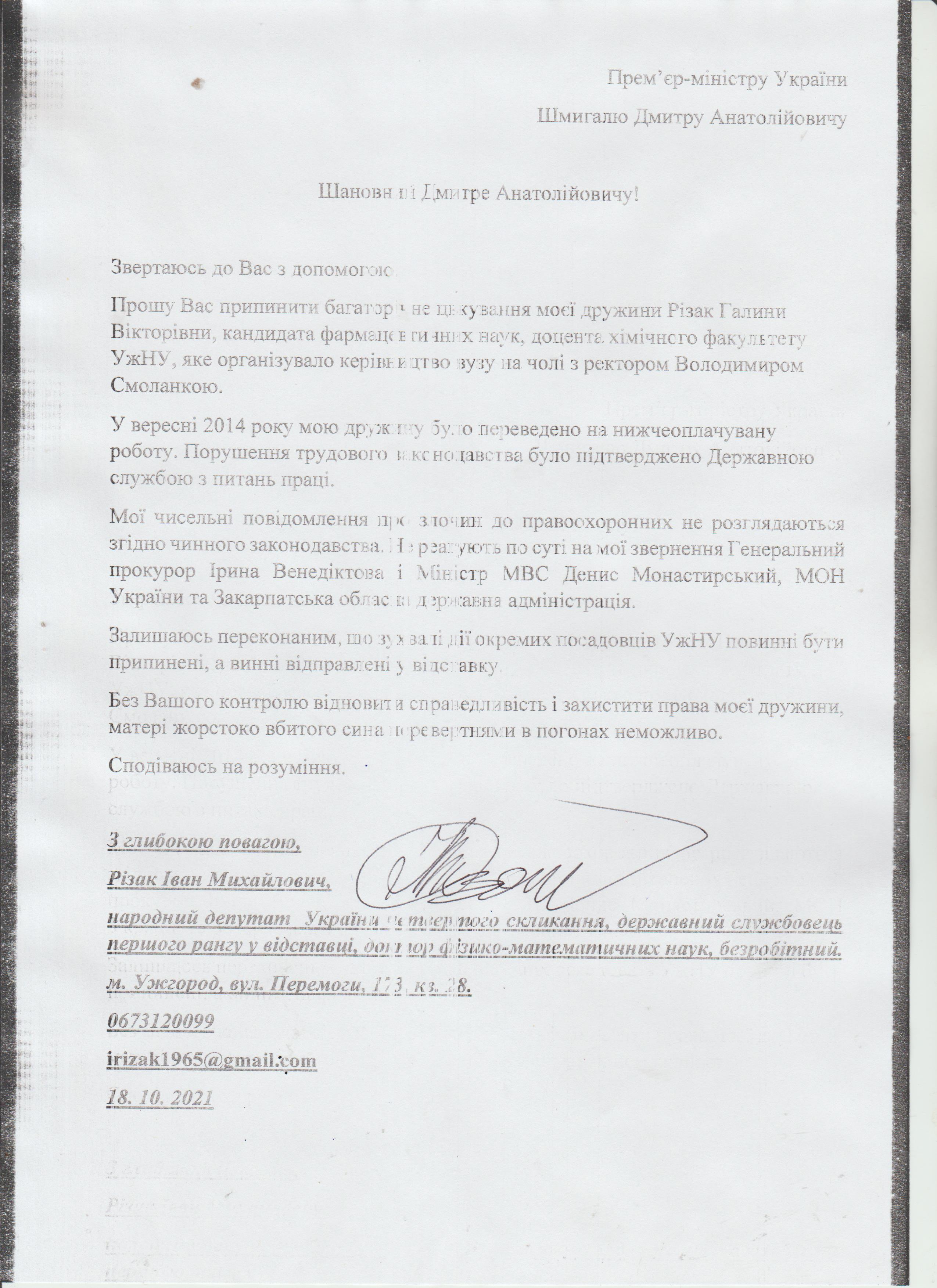 Шановні Анатолію Леонідовичу, Василю Дмитровичу, Василю Миколайовичу! Звертаюся до Вас як батько, як колишній керівник області, як простий житель цього краю, який хоче, щоб на цій землі ніколи не проливалася кров наших рідних, знайомих і близьких. Переконаний, що у політичного керівництва держави є достатньо волі для того, щоб поставити на місце «безпредельщиков», які пробують дестабілізувати ситуацію у державі. Переконаний, що події на кшталт помаранчевого терору у 2005 роців області більше не повторяться. З глибокою повагою, Різак Іван Михайлович, що проживає за адресою м. Ужгород, вул. Капушанська, б.173 кв. 28, голова Закарпатської обласної державної адміністрації (вересень 2002р. – січень 2005р.), народний депутат IV скликання, державний службовець І рангу, багаторічний голова і член координаційного комітету по боротьбі з організованою злочинністю при ОДА, кандидат фізико-математичних наук, тимчасово непрацюючий.