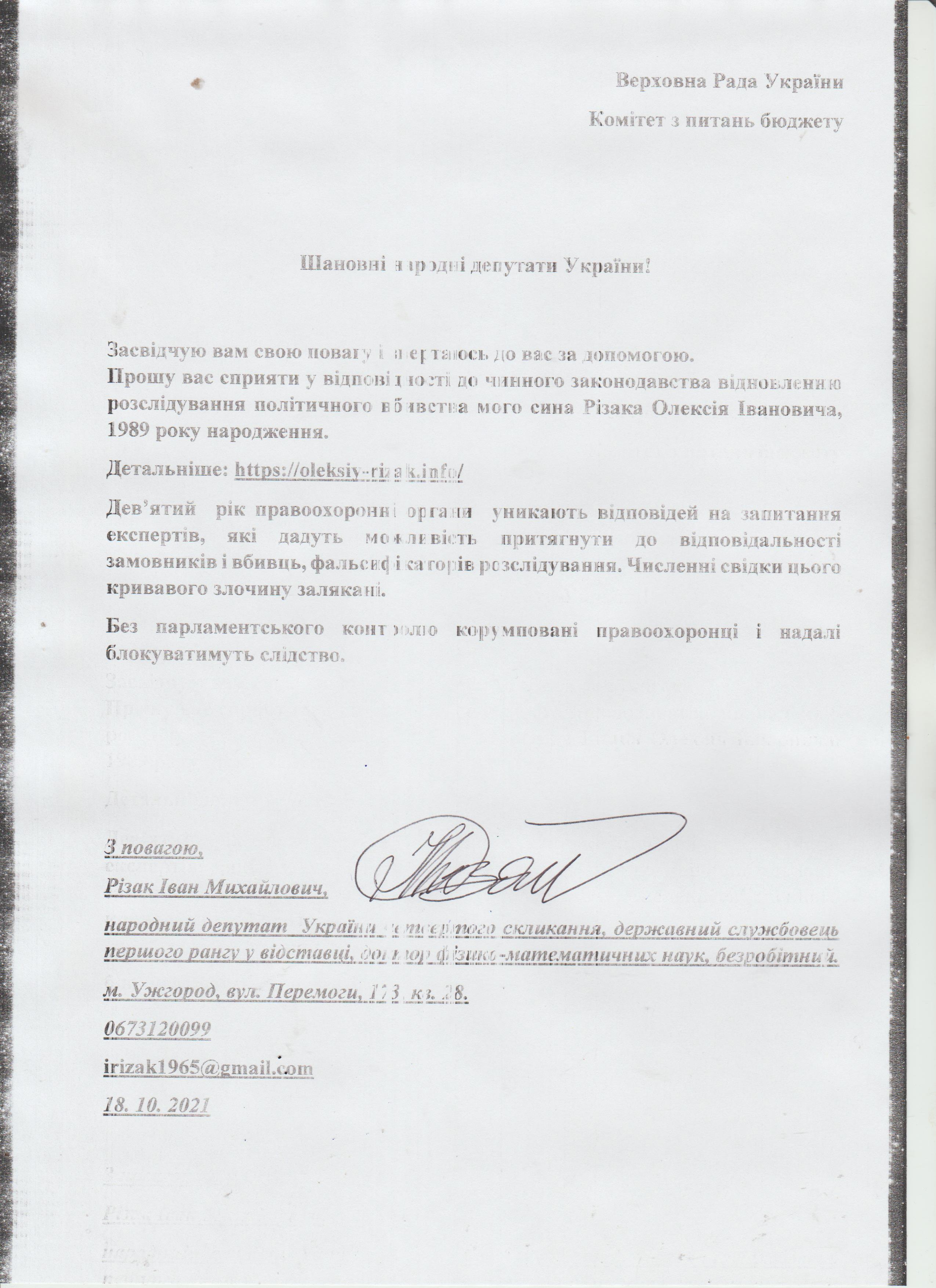 Це дає мені підстави говорити про те, що вбивство мого сина – чітко спланована спецоперація з відповідним інформаційним забезпеченням по своїм масштабам схожа на гебельсівську пропаганду. На час поширення цієї версії загибелі сина не було жодної, підкреслюю жодної, підстави говорити про самогубство, оскільки на той час слідчі не знайшли і сліду падіння з багатоповерхівки Олексія Різака, а також не провели жодної слідчої дії з громадянкою із-за «нещасливої» любові до якої мій син закінчив життя самогубством. Щиро прошу Вас, в найближчі години перекваліфікувати цю трагедію за статею КПК «вбивство» і всебічно, об’єктивно та системно провести відповідні слідчі дії для знаходження впливових замовників і звірів-вбивць мого рідного сина. Коротко Вас проінформую, що Різак Олексій Іванович, 1989 р.н., магістр фінансів (закінчив економічний факультет Харківського національного університету імені В.Н. Каразіна з відзнакою), магістр – юрист (закінчив магістратуру національного університету «Юридична академія України імені Ярослава Мудрого»), має військове звання – молодший лейтенант запасу, працював головним державним податковим інспектором першого рангу ДПС у Закарпатській області. Активно займався спортом. У свій час виступав за юнацьку збірну України з футболу, професійний клуб ФК «Закарпаття». На сьогоднішній день виступав за збірну ДПС у Закарпатській області, щоденно займався фізкультурою (для прикладу скажу, щоранку віджимався до 500 разів, а кількість ранкових стрибків на скакалці сягала 2000 разів, разом зі мною освоював східні єдиноборства), мав щирі відносини із дівчиною, колегами по роботі, був серйозним і відповідальним фахівцем. Додам також, що за півтори години до знаходження його тіла я спілкувався з ним особисто по телефону і обговорював подробиці матчу чемпіонату Італії з футболу Мілан – Фіорентина, під час цієї розмови ми обговорили майбутню поїздку у Київ, а також похід у гості до знайомих. Переконаний, нічого не могло статися за ці півтори години після нашої доброї розмови з почуттям гумору і присутності його дівчини, якій я передав вітання.