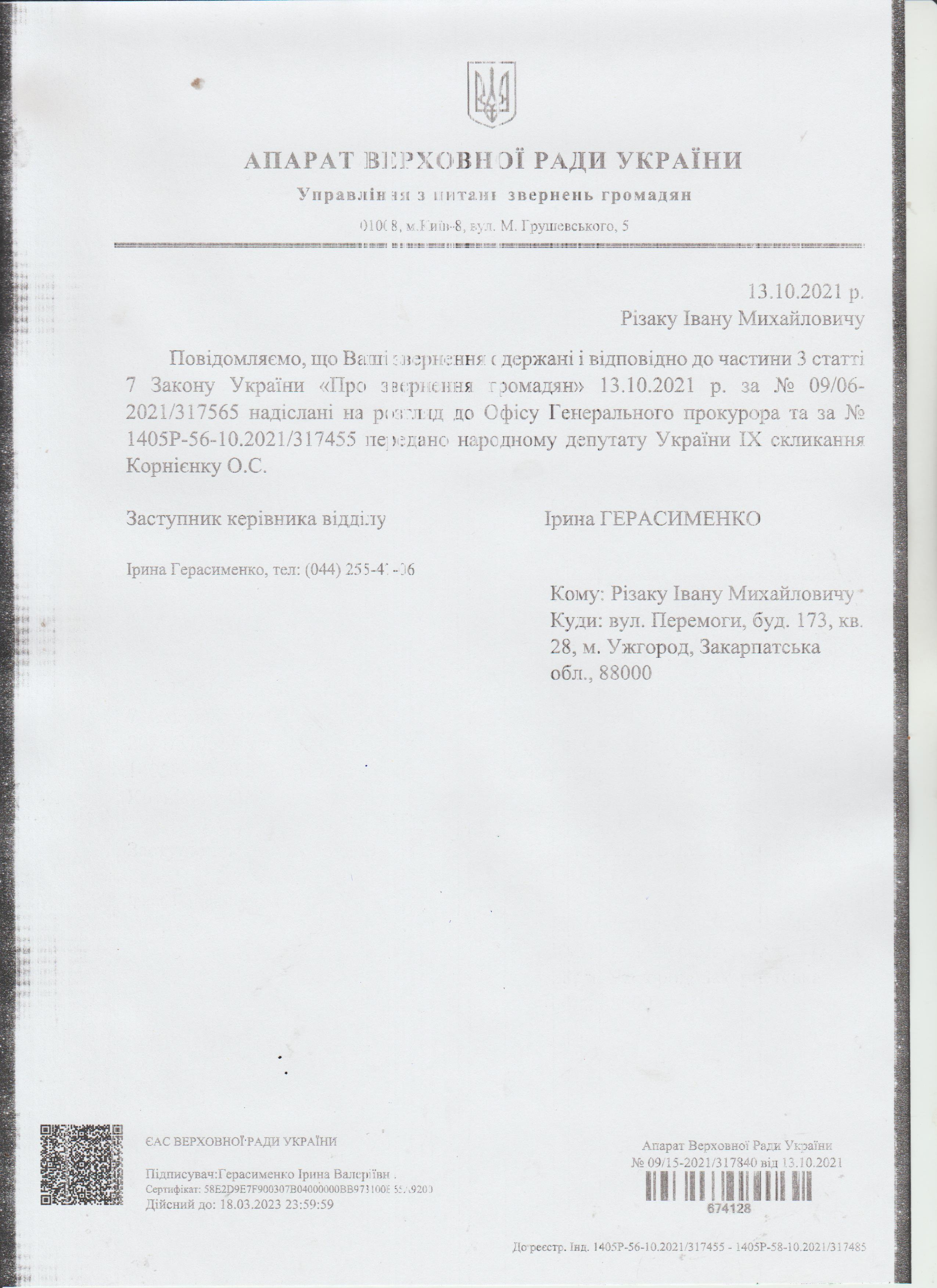 Шановні Анатолію Леонідовичу, Василю Дмитровичу, Василю Миколайовичу! Звертаюся до Вас як батько, як колишній керівник області, як простий житель цього краю, який хоче, щоб на цій землі ніколи не проливалася кров наших рідних, знайомих і близьких. Переконаний, що у політичного керівництва держави є достатньо волі для того, щоб поставити на місце «безпредельщиков», які пробують дестабілізувати ситуацію у державі. Переконаний, що події на кшталт помаранчевого терору у 2005 роців області більше не повторяться. З глибокою повагою, Різак Іван Михайлович, що проживає за адресою м. Ужгород, вул. Капушанська, б.173 кв. 28, голова Закарпатської обласної державної адміністрації (вересень 2002р. – січень 2005р.), народний депутат IV скликання, державний службовець І рангу, багаторічний голова і член координаційного комітету по боротьбі з організованою злочинністю при ОДА, кандидат фізико-математичних наук, тимчасово непрацюючий.