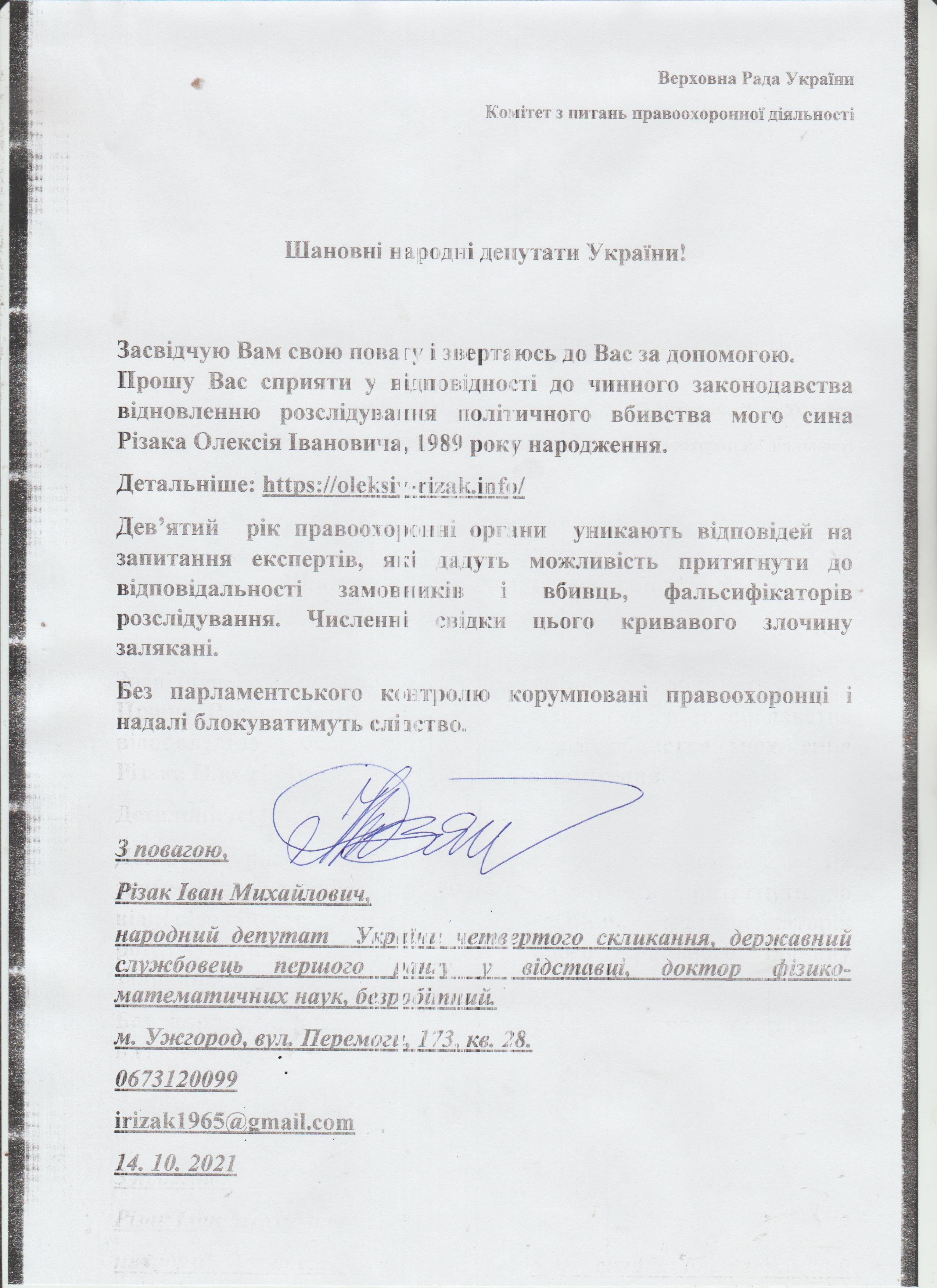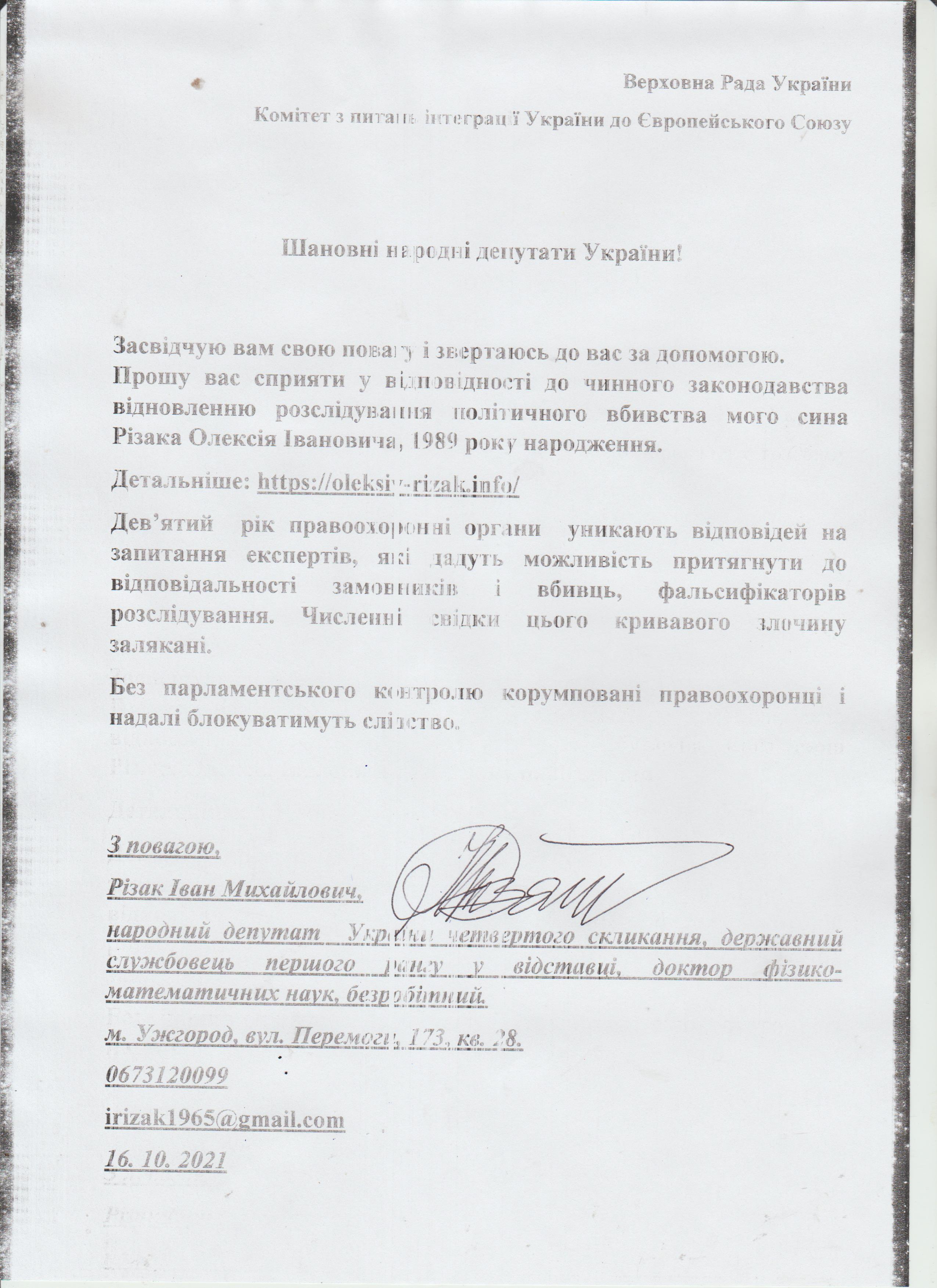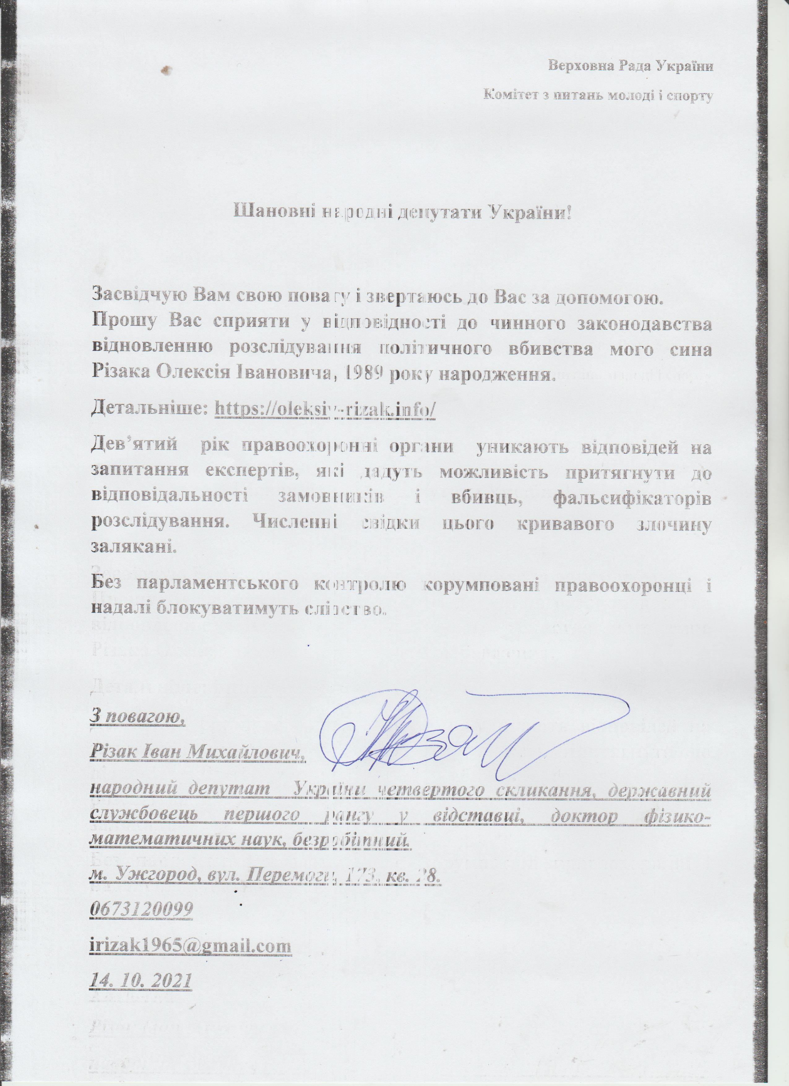 Це дає мені підстави говорити про те, що вбивство мого сина – чітко спланована спецоперація з відповідним інформаційним забезпеченням по своїм масштабам схожа на гебельсівську пропаганду. На час поширення цієї версії загибелі сина не було жодної, підкреслюю жодної, підстави говорити про самогубство, оскільки на той час слідчі не знайшли і сліду падіння з багатоповерхівки Олексія Різака, а також не провели жодної слідчої дії з громадянкою із-за «нещасливої» любові до якої мій син закінчив життя самогубством. Щиро прошу Вас, в найближчі години перекваліфікувати цю трагедію за статею КПК «вбивство» і всебічно, об’єктивно та системно провести відповідні слідчі дії для знаходження впливових замовників і звірів-вбивць мого рідного сина. Коротко Вас проінформую, що Різак Олексій Іванович, 1989 р.н., магістр фінансів (закінчив економічний факультет Харківського національного університету імені В.Н. Каразіна з відзнакою), магістр – юрист (закінчив магістратуру національного університету «Юридична академія України імені Ярослава Мудрого»), має військове звання – молодший лейтенант запасу, працював головним державним податковим інспектором першого рангу ДПС у Закарпатській області. Активно займався спортом. У свій час виступав за юнацьку збірну України з футболу, професійний клуб ФК «Закарпаття». На сьогоднішній день виступав за збірну ДПС у Закарпатській області, щоденно займався фізкультурою (для прикладу скажу, щоранку віджимався до 500 разів, а кількість ранкових стрибків на скакалці сягала 2000 разів, разом зі мною освоював східні єдиноборства), мав щирі відносини із дівчиною, колегами по роботі, був серйозним і відповідальним фахівцем. Додам також, що за півтори години до знаходження його тіла я спілкувався з ним особисто по телефону і обговорював подробиці матчу чемпіонату Італії з футболу Мілан – Фіорентина, під час цієї розмови ми обговорили майбутню поїздку у Київ, а також похід у гості до знайомих. Переконаний, нічого не могло статися за ці півтори години після нашої доброї розмови з почуттям гумору і присутності його дівчини, якій я передав вітання.