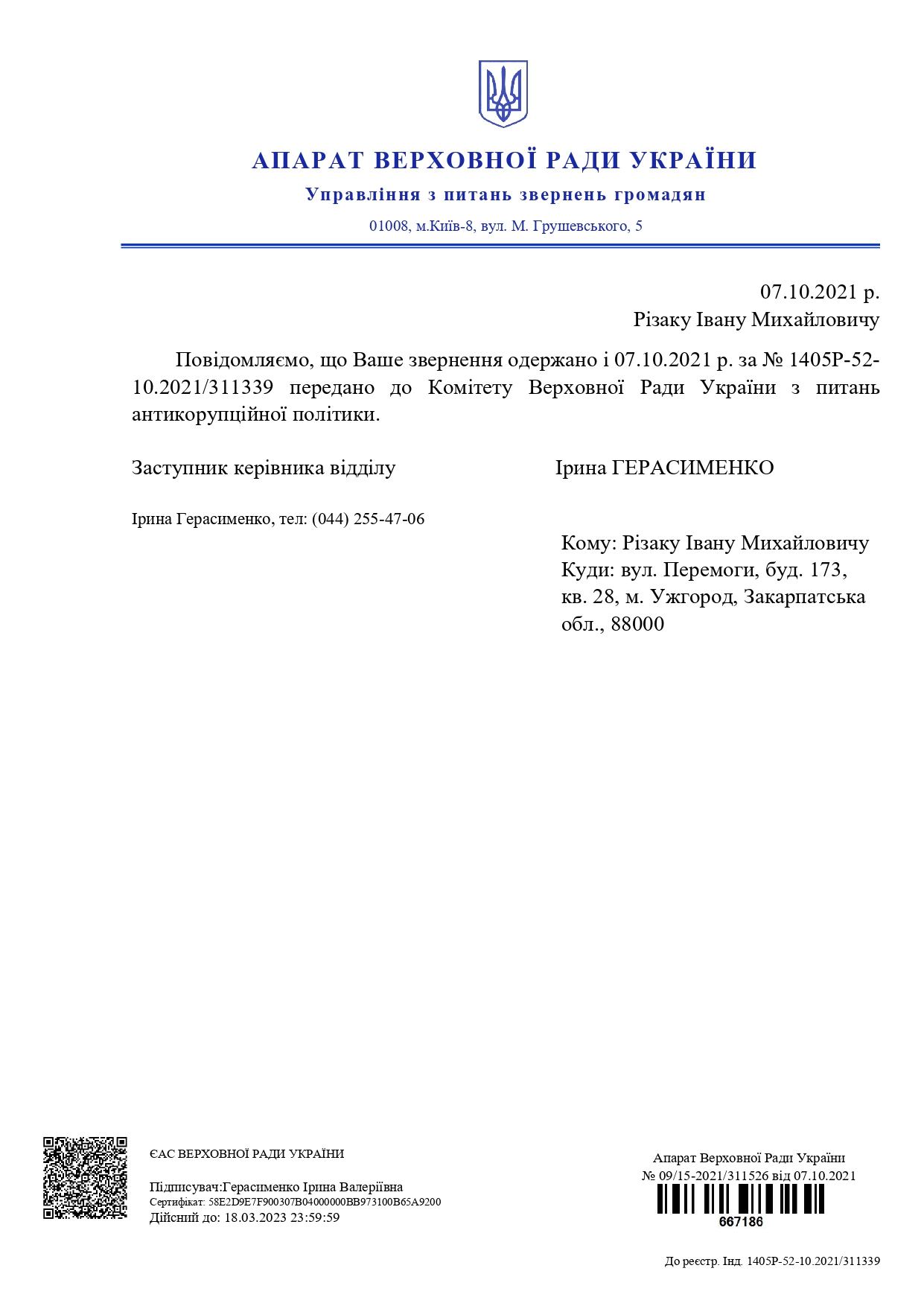 Шановні Анатолію Леонідовичу, Василю Дмитровичу, Василю Миколайовичу! Звертаюся до Вас як батько, як колишній керівник області, як простий житель цього краю, який хоче, щоб на цій землі ніколи не проливалася кров наших рідних, знайомих і близьких. Переконаний, що у політичного керівництва держави є достатньо волі для того, щоб поставити на місце «безпредельщиков», які пробують дестабілізувати ситуацію у державі. Переконаний, що події на кшталт помаранчевого терору у 2005 роців області більше не повторяться. З глибокою повагою, Різак Іван Михайлович, що проживає за адресою м. Ужгород, вул. Капушанська, б.173 кв. 28, голова Закарпатської обласної державної адміністрації (вересень 2002р. – січень 2005р.), народний депутат IV скликання, державний службовець І рангу, багаторічний голова і член координаційного комітету по боротьбі з організованою злочинністю при ОДА, кандидат фізико-математичних наук, тимчасово непрацюючий.
