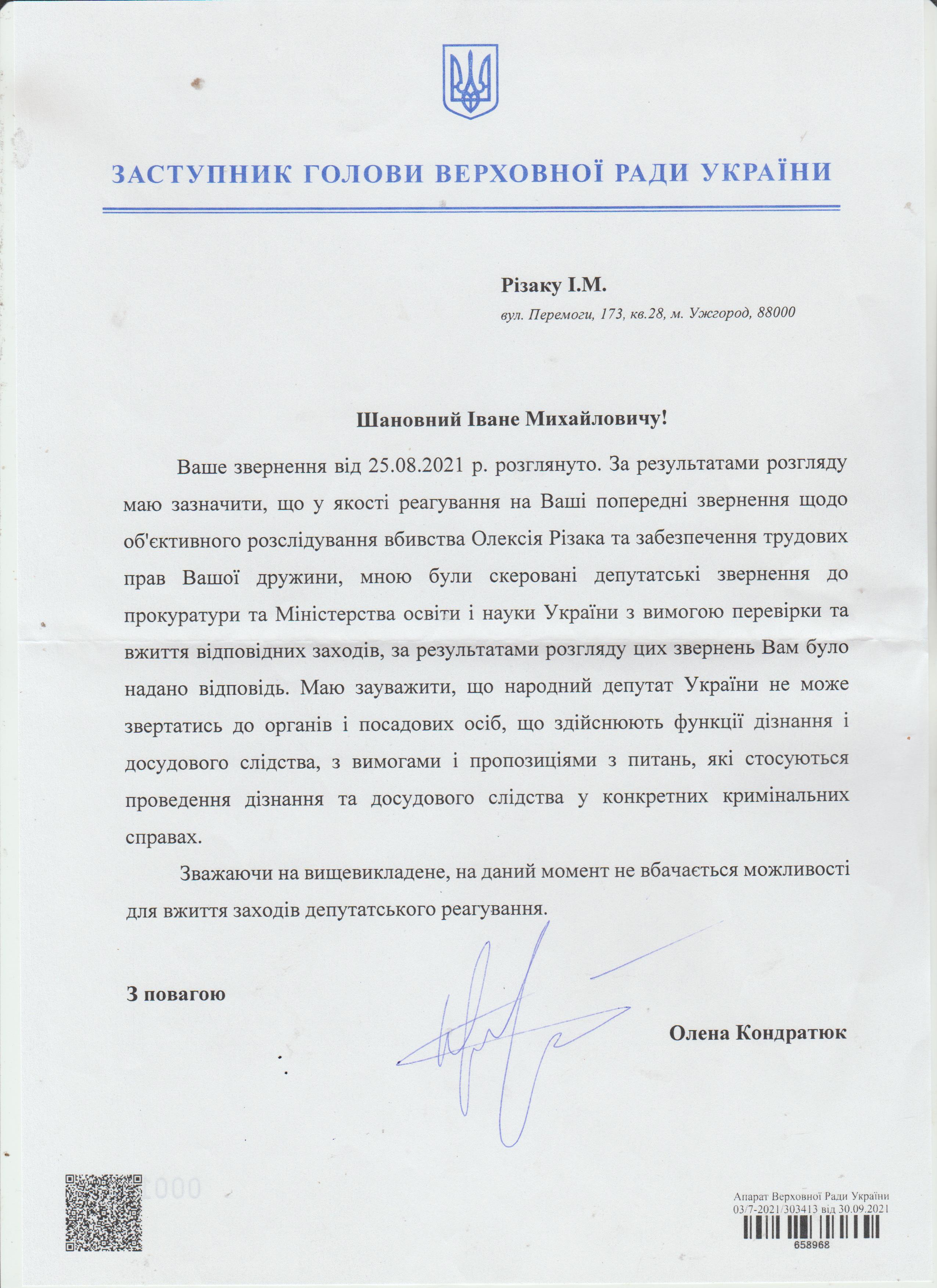 Це дає мені підстави говорити про те, що вбивство мого сина – чітко спланована спецоперація з відповідним інформаційним забезпеченням по своїм масштабам схожа на гебельсівську пропаганду. На час поширення цієї версії загибелі сина не було жодної, підкреслюю жодної, підстави говорити про самогубство, оскільки на той час слідчі не знайшли і сліду падіння з багатоповерхівки Олексія Різака, а також не провели жодної слідчої дії з громадянкою із-за «нещасливої» любові до якої мій син закінчив життя самогубством. Щиро прошу Вас, в найближчі години перекваліфікувати цю трагедію за статею КПК «вбивство» і всебічно, об’єктивно та системно провести відповідні слідчі дії для знаходження впливових замовників і звірів-вбивць мого рідного сина. Коротко Вас проінформую, що Різак Олексій Іванович, 1989 р.н., магістр фінансів (закінчив економічний факультет Харківського національного університету імені В.Н. Каразіна з відзнакою), магістр – юрист (закінчив магістратуру національного університету «Юридична академія України імені Ярослава Мудрого»), має військове звання – молодший лейтенант запасу, працював головним державним податковим інспектором першого рангу ДПС у Закарпатській області. Активно займався спортом. У свій час виступав за юнацьку збірну України з футболу, професійний клуб ФК «Закарпаття». На сьогоднішній день виступав за збірну ДПС у Закарпатській області, щоденно займався фізкультурою (для прикладу скажу, щоранку віджимався до 500 разів, а кількість ранкових стрибків на скакалці сягала 2000 разів, разом зі мною освоював східні єдиноборства), мав щирі відносини із дівчиною, колегами по роботі, був серйозним і відповідальним фахівцем. Додам також, що за півтори години до знаходження його тіла я спілкувався з ним особисто по телефону і обговорював подробиці матчу чемпіонату Італії з футболу Мілан – Фіорентина, під час цієї розмови ми обговорили майбутню поїздку у Київ, а також похід у гості до знайомих. Переконаний, нічого не могло статися за ці півтори години після нашої доброї розмови з почуттям гумору і присутності його дівчини, якій я передав вітання.