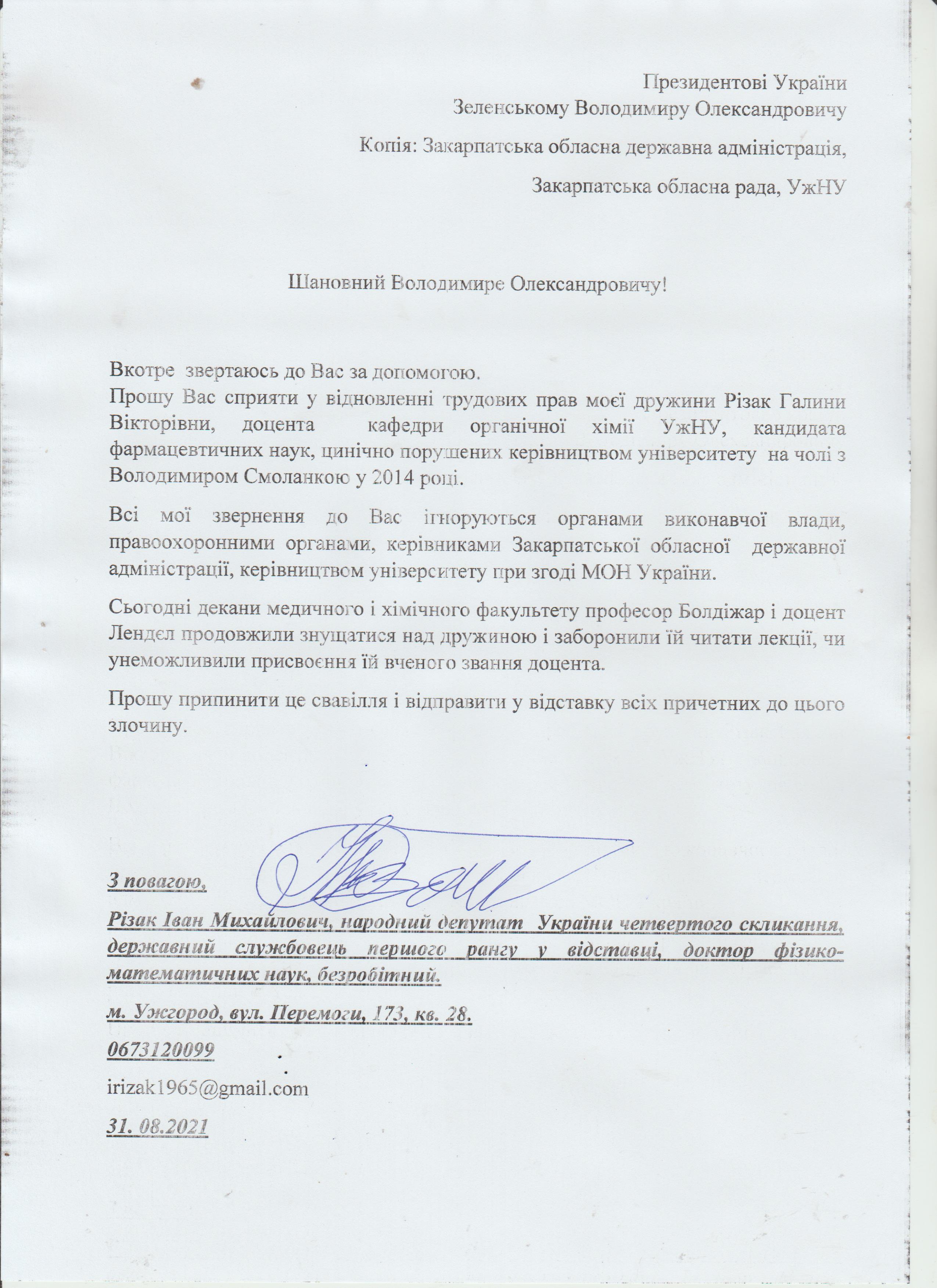 Шановні Анатолію Леонідовичу, Василю Дмитровичу, Василю Миколайовичу! Звертаюся до Вас як батько, як колишній керівник області, як простий житель цього краю, який хоче, щоб на цій землі ніколи не проливалася кров наших рідних, знайомих і близьких. Переконаний, що у політичного керівництва держави є достатньо волі для того, щоб поставити на місце «безпредельщиков», які пробують дестабілізувати ситуацію у державі. Переконаний, що події на кшталт помаранчевого терору у 2005 роців області більше не повторяться. З глибокою повагою, Різак Іван Михайлович, що проживає за адресою м. Ужгород, вул. Капушанська, б.173 кв. 28, голова Закарпатської обласної державної адміністрації (вересень 2002р. – січень 2005р.), народний депутат IV скликання, державний службовець І рангу, багаторічний голова і член координаційного комітету по боротьбі з організованою злочинністю при ОДА, кандидат фізико-математичних наук, тимчасово непрацюючий.