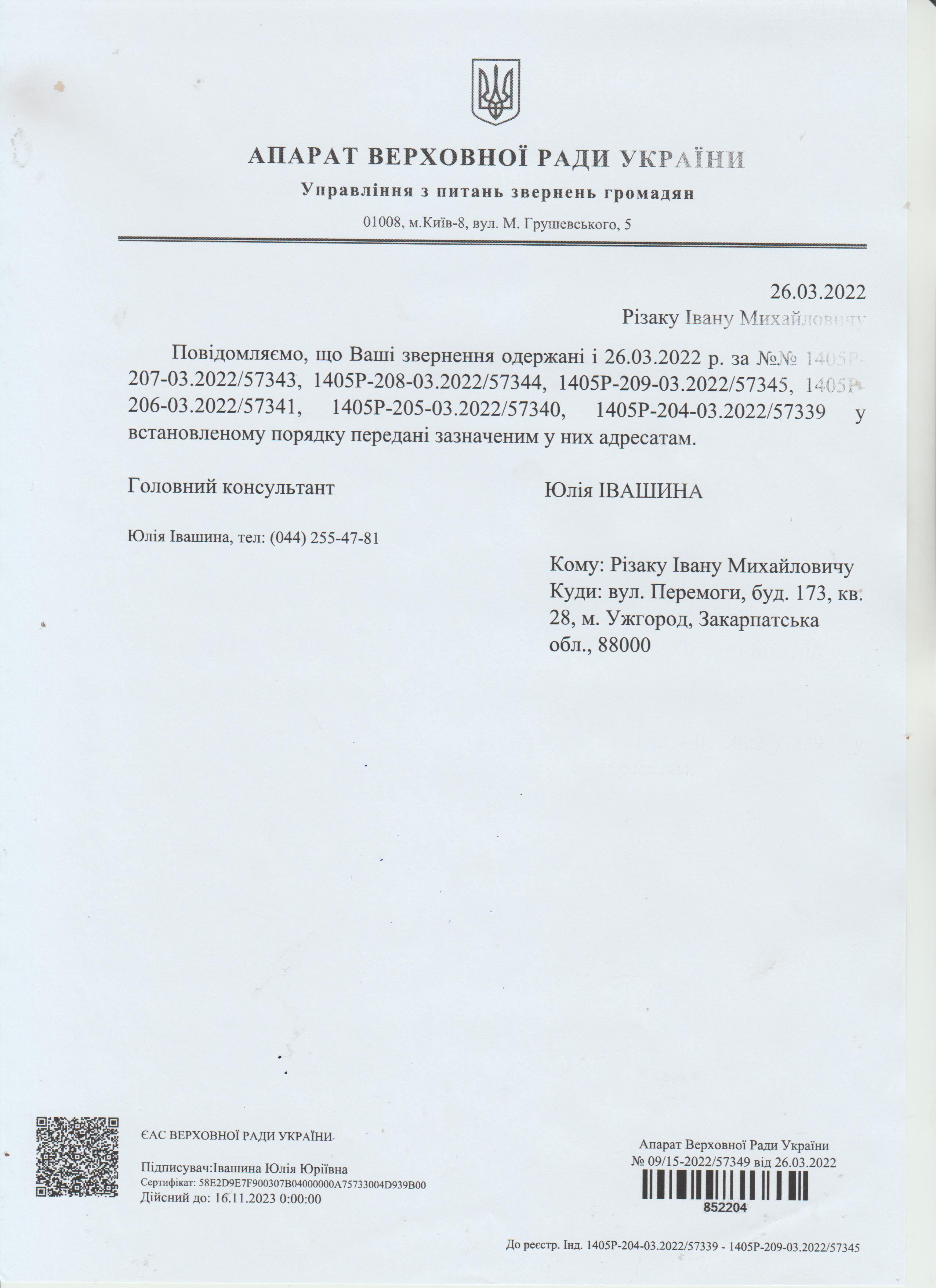 Шановні Анатолію Леонідовичу, Василю Дмитровичу, Василю Миколайовичу! Звертаюся до Вас як батько, як колишній керівник області, як простий житель цього краю, який хоче, щоб на цій землі ніколи не проливалася кров наших рідних, знайомих і близьких. Переконаний, що у політичного керівництва держави є достатньо волі для того, щоб поставити на місце «безпредельщиков», які пробують дестабілізувати ситуацію у державі. Переконаний, що події на кшталт помаранчевого терору у 2005 роців області більше не повторяться. З глибокою повагою, Різак Іван Михайлович, що проживає за адресою м. Ужгород, вул. Капушанська, б.173 кв. 28, голова Закарпатської обласної державної адміністрації (вересень 2002р. – січень 2005р.), народний депутат IV скликання, державний службовець І рангу, багаторічний голова і член координаційного комітету по боротьбі з організованою злочинністю при ОДА, кандидат фізико-математичних наук, тимчасово непрацюючий.