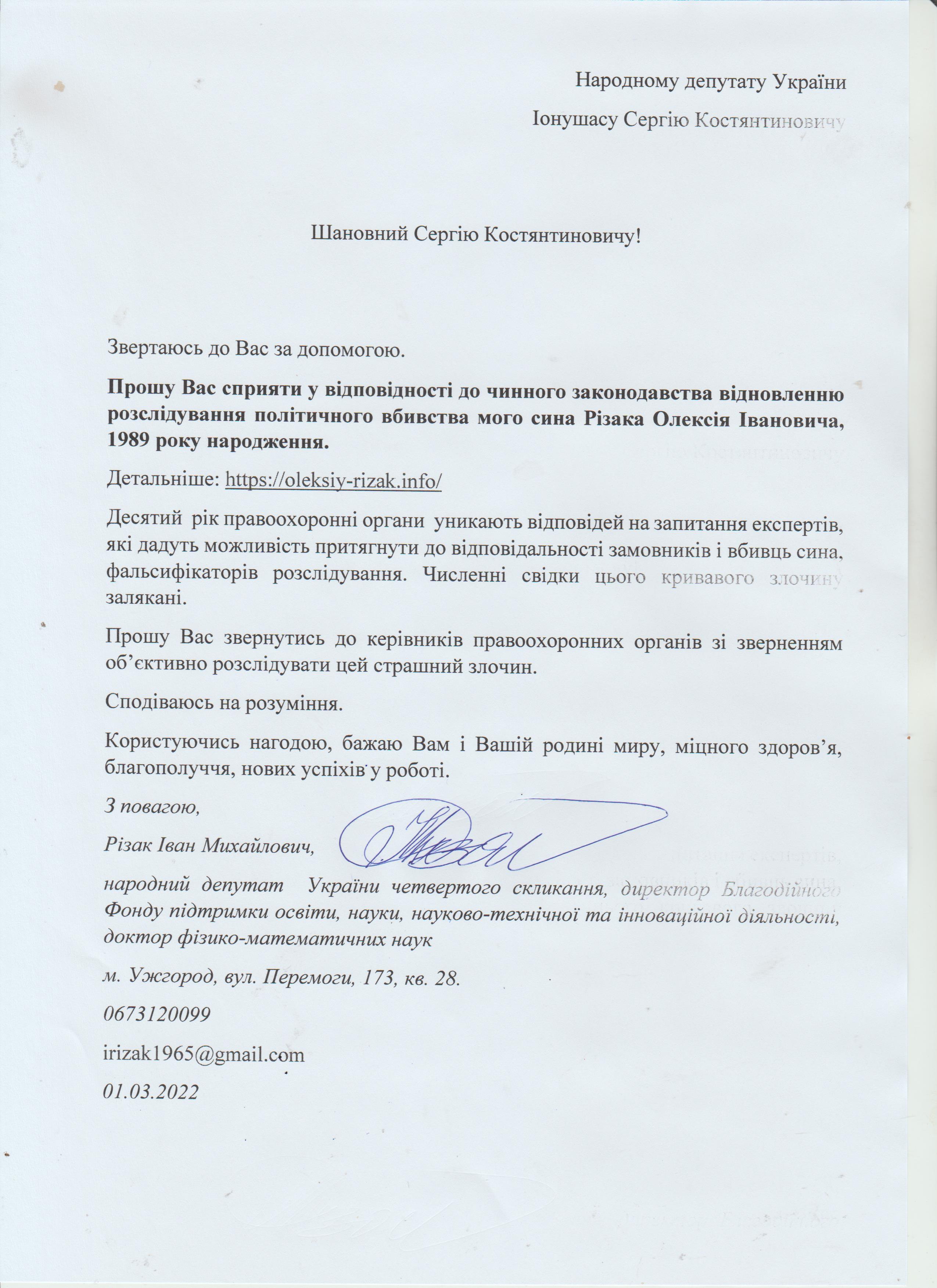 Шановні Анатолію Леонідовичу, Василю Дмитровичу, Василю Миколайовичу! Звертаюся до Вас як батько, як колишній керівник області, як простий житель цього краю, який хоче, щоб на цій землі ніколи не проливалася кров наших рідних, знайомих і близьких. Переконаний, що у політичного керівництва держави є достатньо волі для того, щоб поставити на місце «безпредельщиков», які пробують дестабілізувати ситуацію у державі. Переконаний, що події на кшталт помаранчевого терору у 2005 роців області більше не повторяться. З глибокою повагою, Різак Іван Михайлович, що проживає за адресою м. Ужгород, вул. Капушанська, б.173 кв. 28, голова Закарпатської обласної державної адміністрації (вересень 2002р. – січень 2005р.), народний депутат IV скликання, державний службовець І рангу, багаторічний голова і член координаційного комітету по боротьбі з організованою злочинністю при ОДА, кандидат фізико-математичних наук, тимчасово непрацюючий.