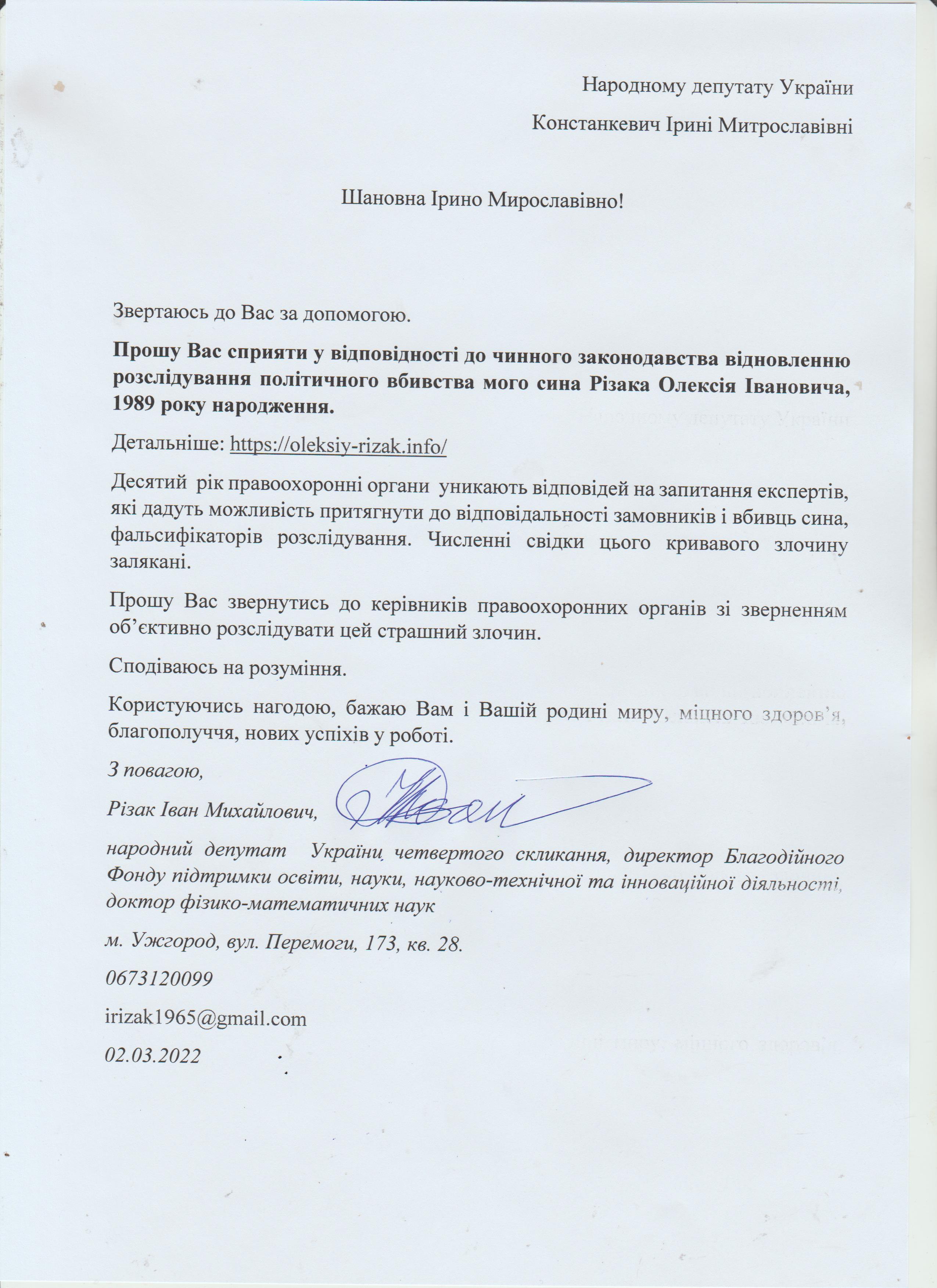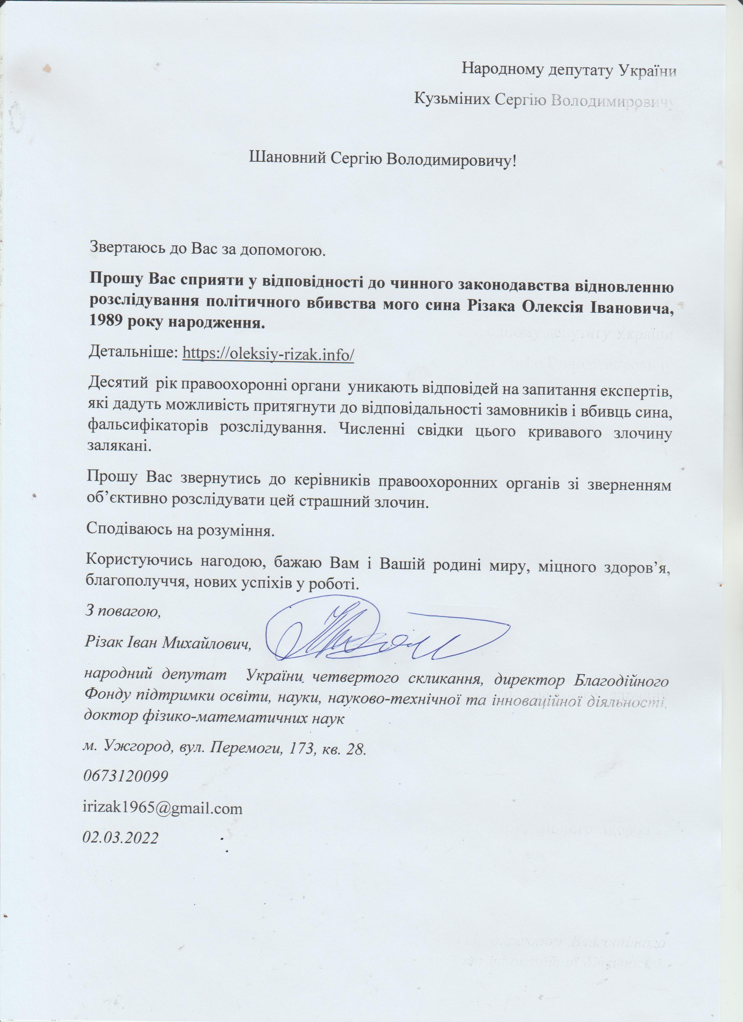 З метою сприяння слідству, а також всебічно об’єктивного розслідування справи прошу Вас доручити своїм підлеглим перевірити наступні питання: 1) чи міг володіти працівник ДПС в Закарпатській області Олексій Різак якоюсь інформацією про тіньовий та кримінальний бізнес в області, знання якої загрожувало б його життю? 2) перевірити у відповідних державних органах наявність у Різака Олексія Івановича та його близьких родичів майна, фінансів, земельних ділянок, підприємств, бізнесу, акцій, облігацій та інших цінних паперів, володіння якими могло б потенційно загрожувати його життю з боку конкурентів та інших співвласників? 3) чи були у нього відносини з громадянкою чи її родичами такими, що могли серйозно впливати на його майновий, матеріальний та ін. стан. 4) чи залучались до спеціальної перевірки, яку потрібно проходити при зарахуванні на державну службу, підрозділи зовнішнього спостереження якоїсь із правоохоронних структур області (я стверджую, що з часу переїзду мене в Закарпаття за нами було встановлене тотальне зовнішнє спостереження)? 5) хотілося б дізнатися (думаю, що це не є слідчою таємницею) в який час і з допомогою якого транспорту 16 листопада 2012 року виїхав син від своєї дівчини, чи проводжала вона його сама або з близькими родичами, чи бачила щось підозріле і яким таксі він виїжджав додому? 6) хотілося б також дізнатися хто першим побачив тіло вбитого юнака і повідомив швидку допомогу і міліцію? 7) з метою перевірки версії спроби отруєння сина Олексія, прошу дати на перевірку у спеціальну токсикологічну лабораторію результати трьох аналізів в «Астра-дія» і одного аналізу, проведеного в кардіодиспансері кілька тижнів тому.