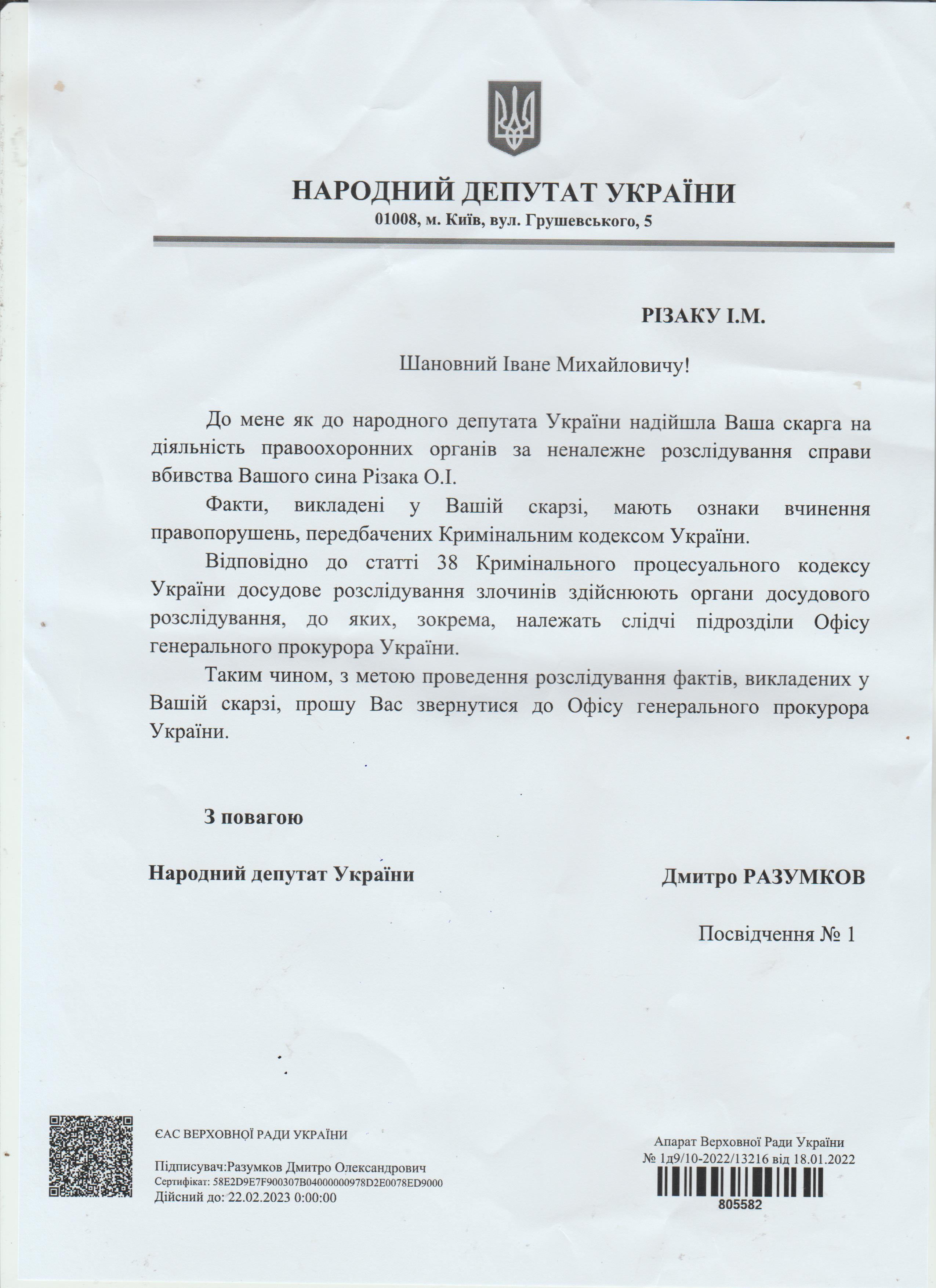 Звертаю Вашу увагу також і на те, що під час огляду тіла мною та моєю дружиною було встановлено, що син на своєму тілі не мав жодної подряпини, а вся одежа була збережена наче нова, на ній ми також не знайшли ніяких пошкоджень. Наголошую, що факт огляду нами тіла та його упізнання не фіксувалося у жодному документі. Підкреслюю, що у медичних додатках до свідоцтва про смерть Різака Олексія Івановича не вказано часу смерті.