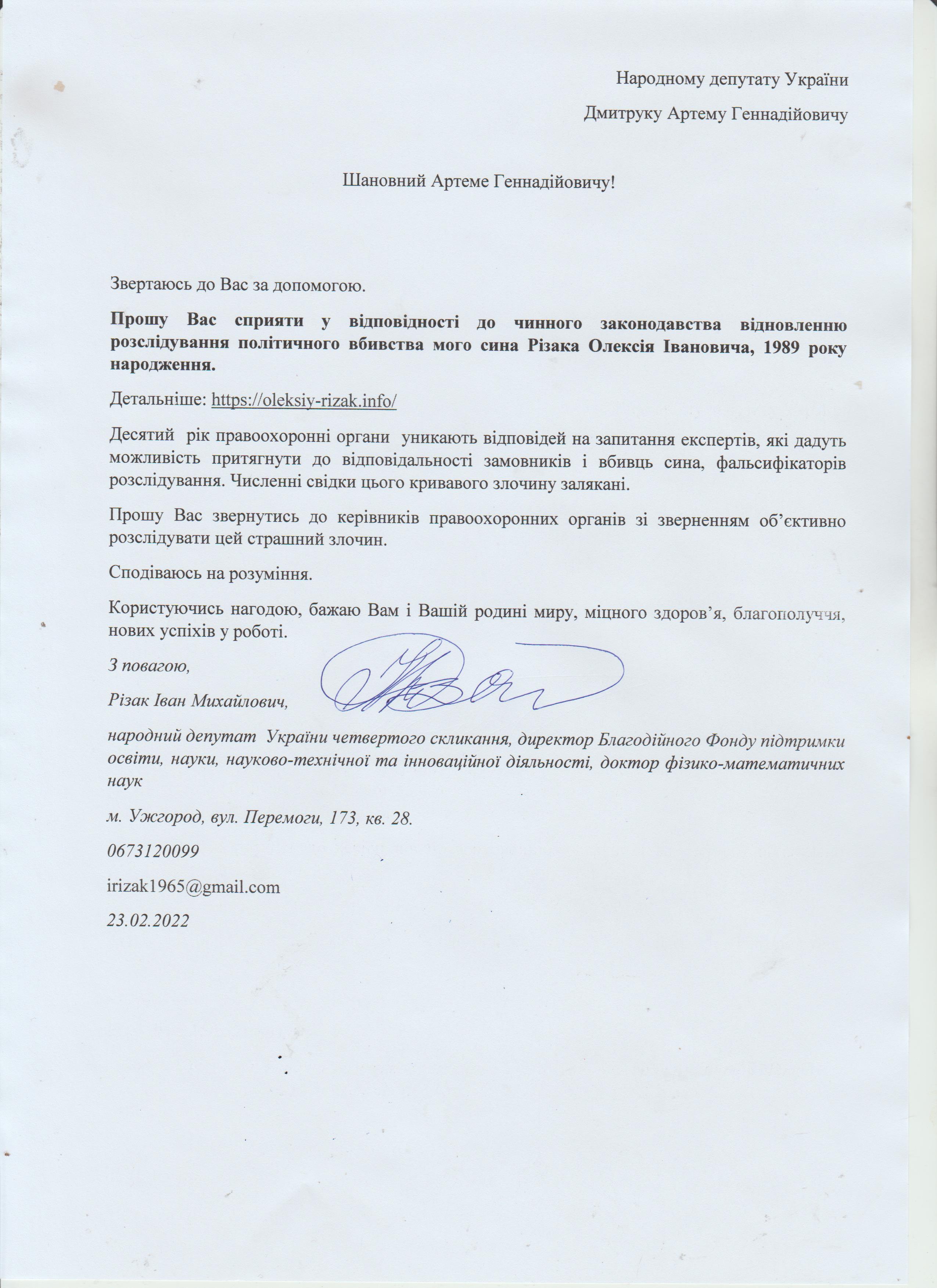 Це дає мені підстави говорити про те, що вбивство мого сина – чітко спланована спецоперація з відповідним інформаційним забезпеченням по своїм масштабам схожа на гебельсівську пропаганду. На час поширення цієї версії загибелі сина не було жодної, підкреслюю жодної, підстави говорити про самогубство, оскільки на той час слідчі не знайшли і сліду падіння з багатоповерхівки Олексія Різака, а також не провели жодної слідчої дії з громадянкою із-за «нещасливої» любові до якої мій син закінчив життя самогубством. Щиро прошу Вас, в найближчі години перекваліфікувати цю трагедію за статею КПК «вбивство» і всебічно, об’єктивно та системно провести відповідні слідчі дії для знаходження впливових замовників і звірів-вбивць мого рідного сина. Коротко Вас проінформую, що Різак Олексій Іванович, 1989 р.н., магістр фінансів (закінчив економічний факультет Харківського національного університету імені В.Н. Каразіна з відзнакою), магістр – юрист (закінчив магістратуру національного університету «Юридична академія України імені Ярослава Мудрого»), має військове звання – молодший лейтенант запасу, працював головним державним податковим інспектором першого рангу ДПС у Закарпатській області. Активно займався спортом. У свій час виступав за юнацьку збірну України з футболу, професійний клуб ФК «Закарпаття». На сьогоднішній день виступав за збірну ДПС у Закарпатській області, щоденно займався фізкультурою (для прикладу скажу, щоранку віджимався до 500 разів, а кількість ранкових стрибків на скакалці сягала 2000 разів, разом зі мною освоював східні єдиноборства), мав щирі відносини із дівчиною, колегами по роботі, був серйозним і відповідальним фахівцем. Додам також, що за півтори години до знаходження його тіла я спілкувався з ним особисто по телефону і обговорював подробиці матчу чемпіонату Італії з футболу Мілан – Фіорентина, під час цієї розмови ми обговорили майбутню поїздку у Київ, а також похід у гості до знайомих. Переконаний, нічого не могло статися за ці півтори години після нашої доброї розмови з почуттям гумору і присутності його дівчини, якій я передав вітання.