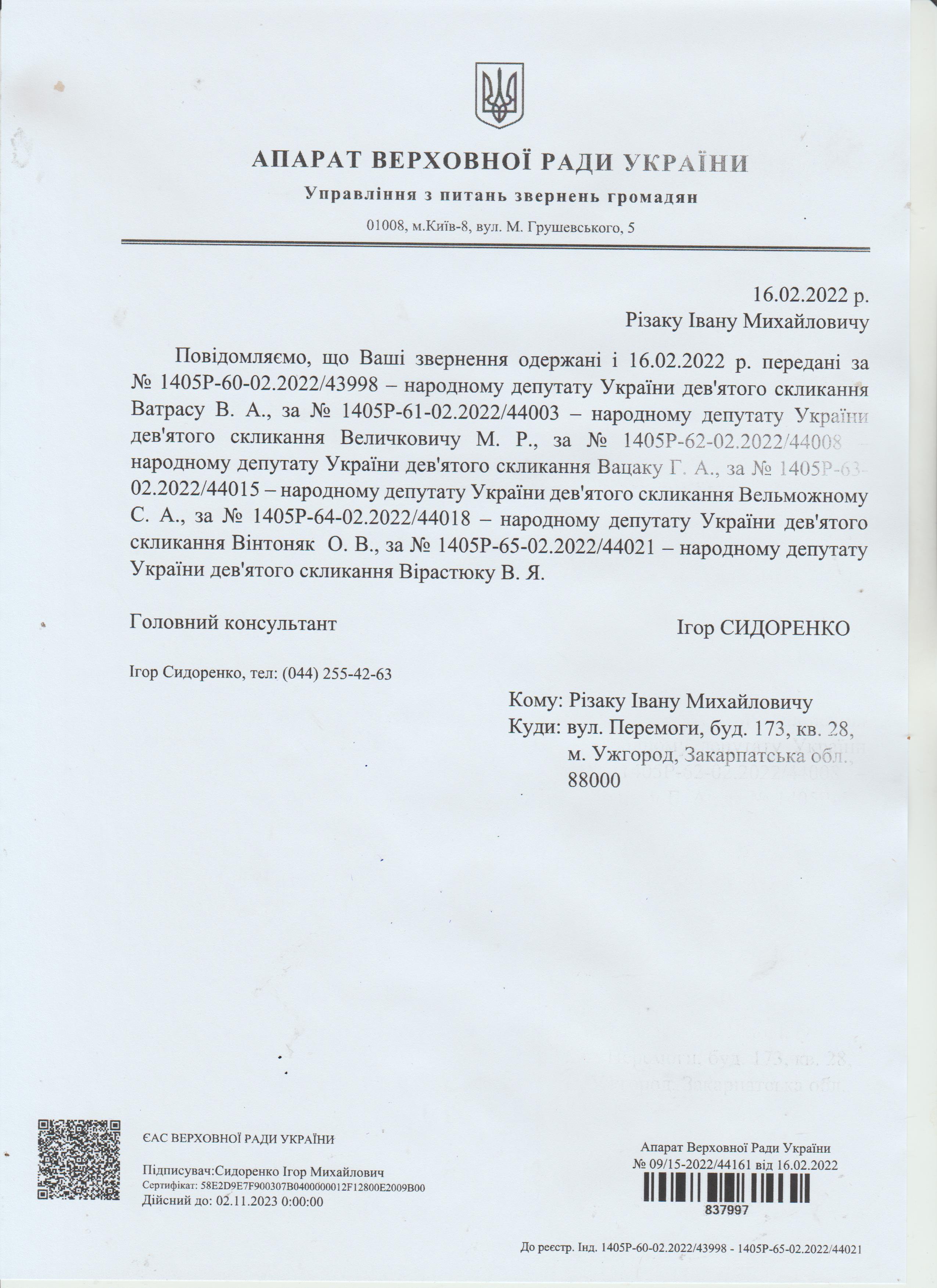Шановні Анатолію Леонідовичу, Василю Дмитровичу, Василю Миколайовичу! Звертаюся до Вас як батько, як колишній керівник області, як простий житель цього краю, який хоче, щоб на цій землі ніколи не проливалася кров наших рідних, знайомих і близьких. Переконаний, що у політичного керівництва держави є достатньо волі для того, щоб поставити на місце «безпредельщиков», які пробують дестабілізувати ситуацію у державі. Переконаний, що події на кшталт помаранчевого терору у 2005 роців області більше не повторяться. З глибокою повагою, Різак Іван Михайлович, що проживає за адресою м. Ужгород, вул. Капушанська, б.173 кв. 28, голова Закарпатської обласної державної адміністрації (вересень 2002р. – січень 2005р.), народний депутат IV скликання, державний службовець І рангу, багаторічний голова і член координаційного комітету по боротьбі з організованою злочинністю при ОДА, кандидат фізико-математичних наук, тимчасово непрацюючий.