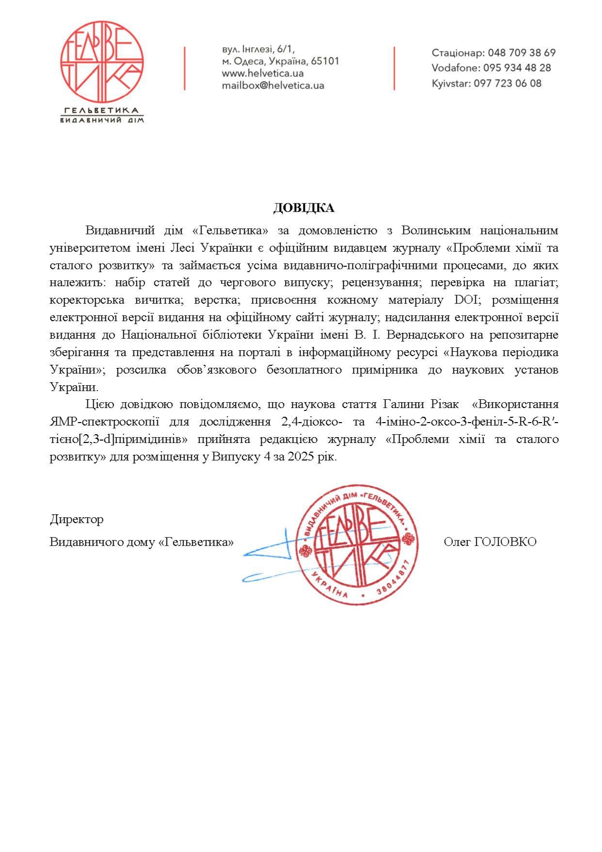 В найближчому випуску наукового журналу Проблеми хімії та сталого розвитку" Волинського національного університету буде опубліковано статтю відомої авторитетної вченої у галузі органічної хімії Галини Вікторівни Різак "ВИКОРИСТАННЯ ЯМР-СПЕКТРОСКОПІЇ ДЛЯ ДОСЛІДЖЕННЯ 2,4- ДІОКСО- ТА 4-ІМІНО-2-ОКСО-3-ФЕНІЛ-5-R-6-R`-ТІЄНО[2,3- d]ПІРИМІДИНІВ".