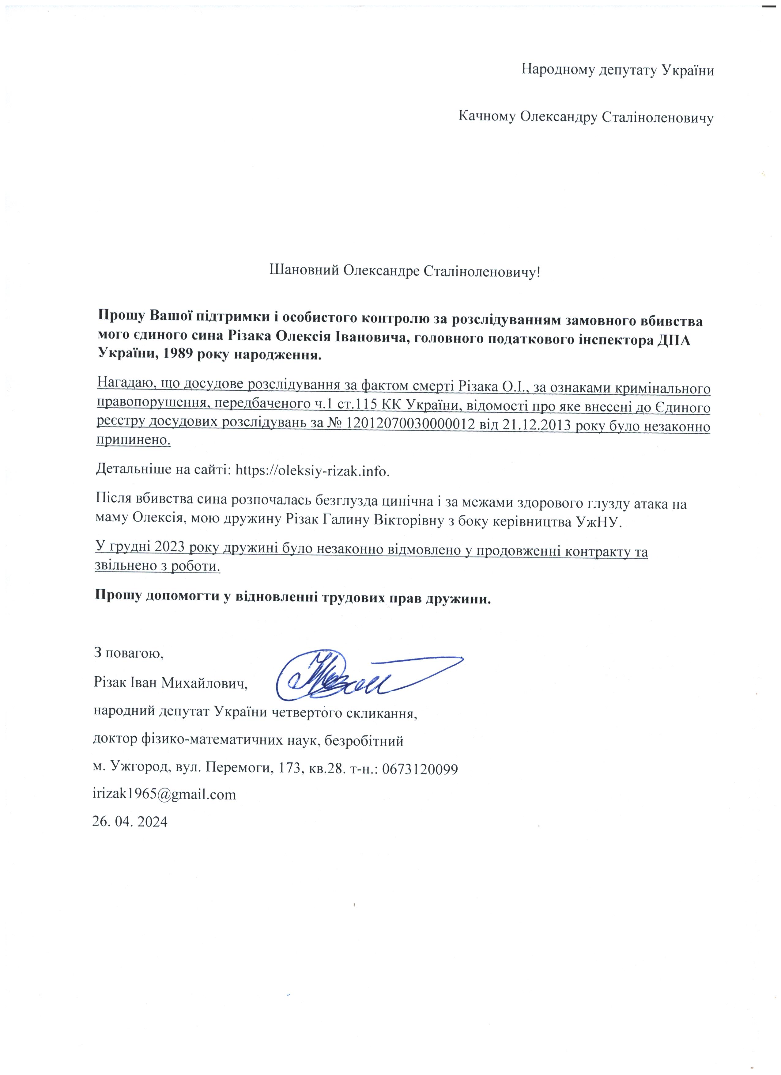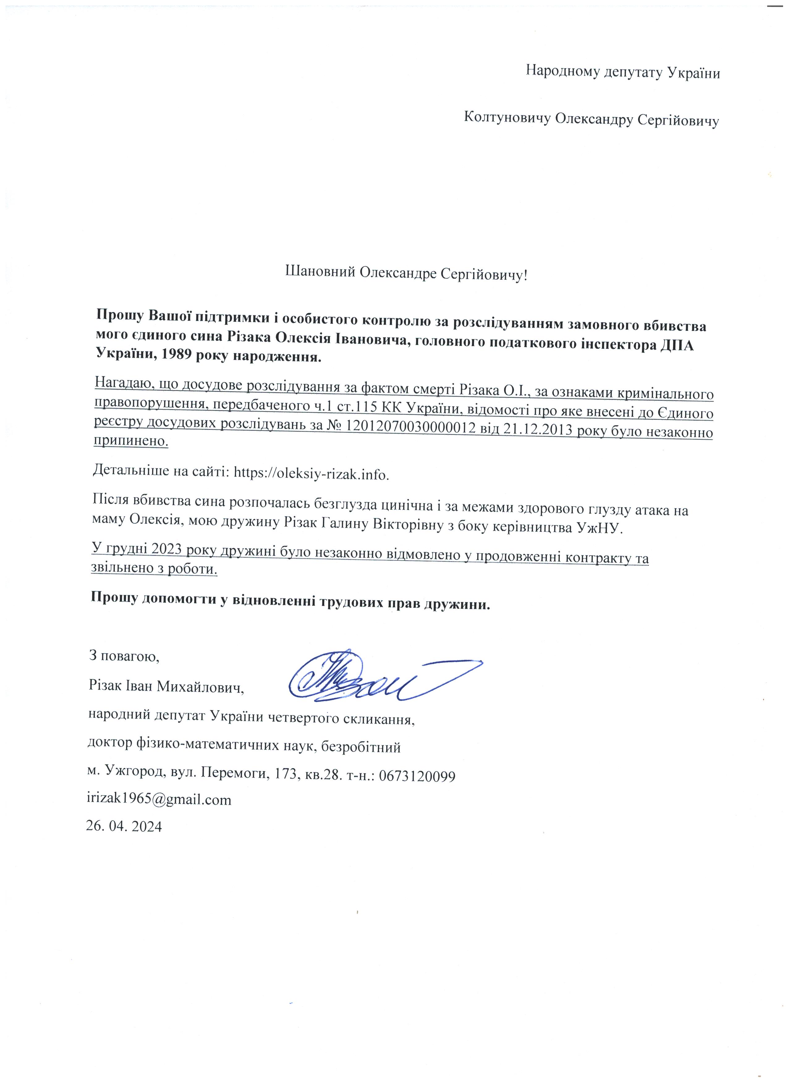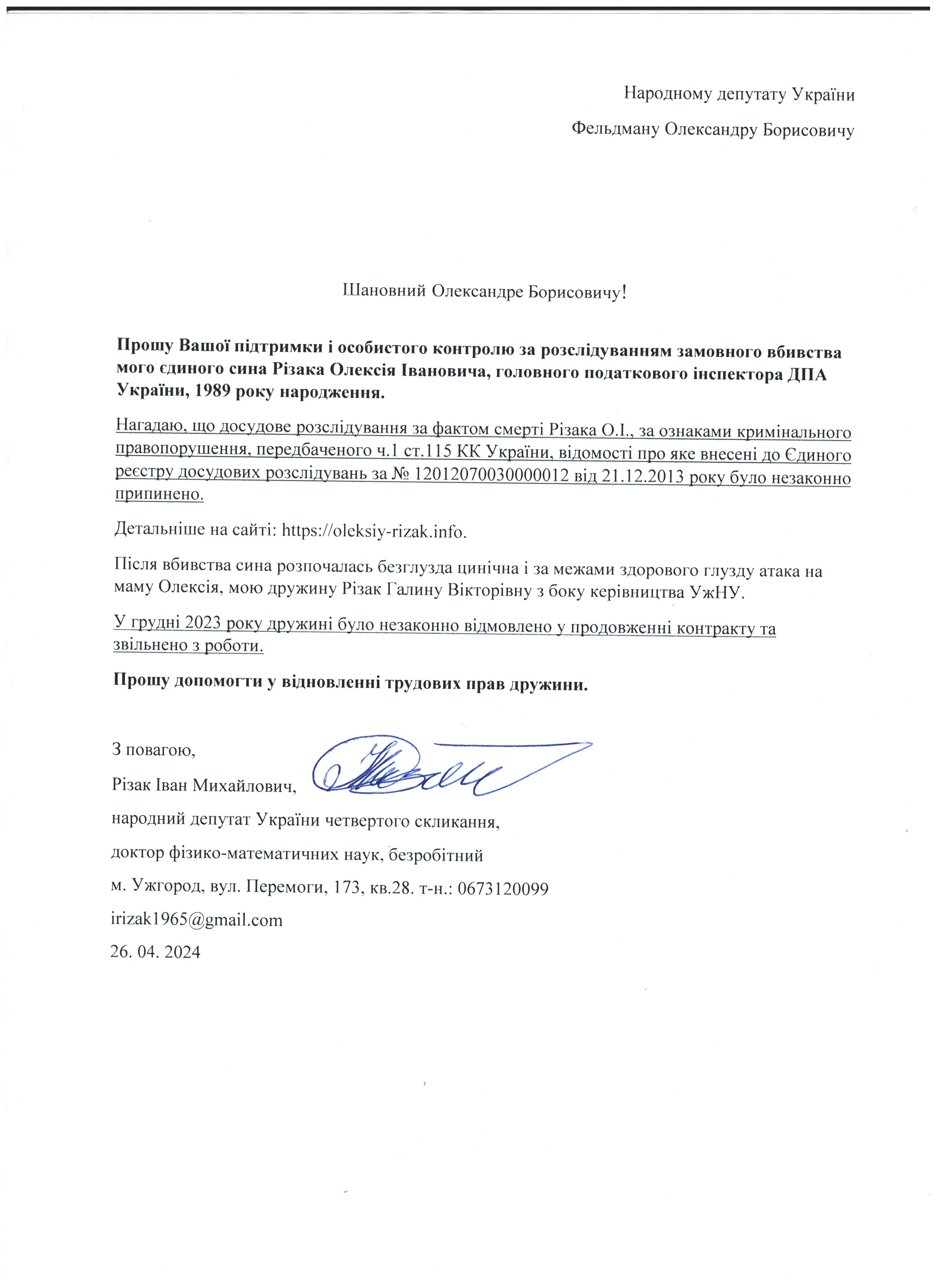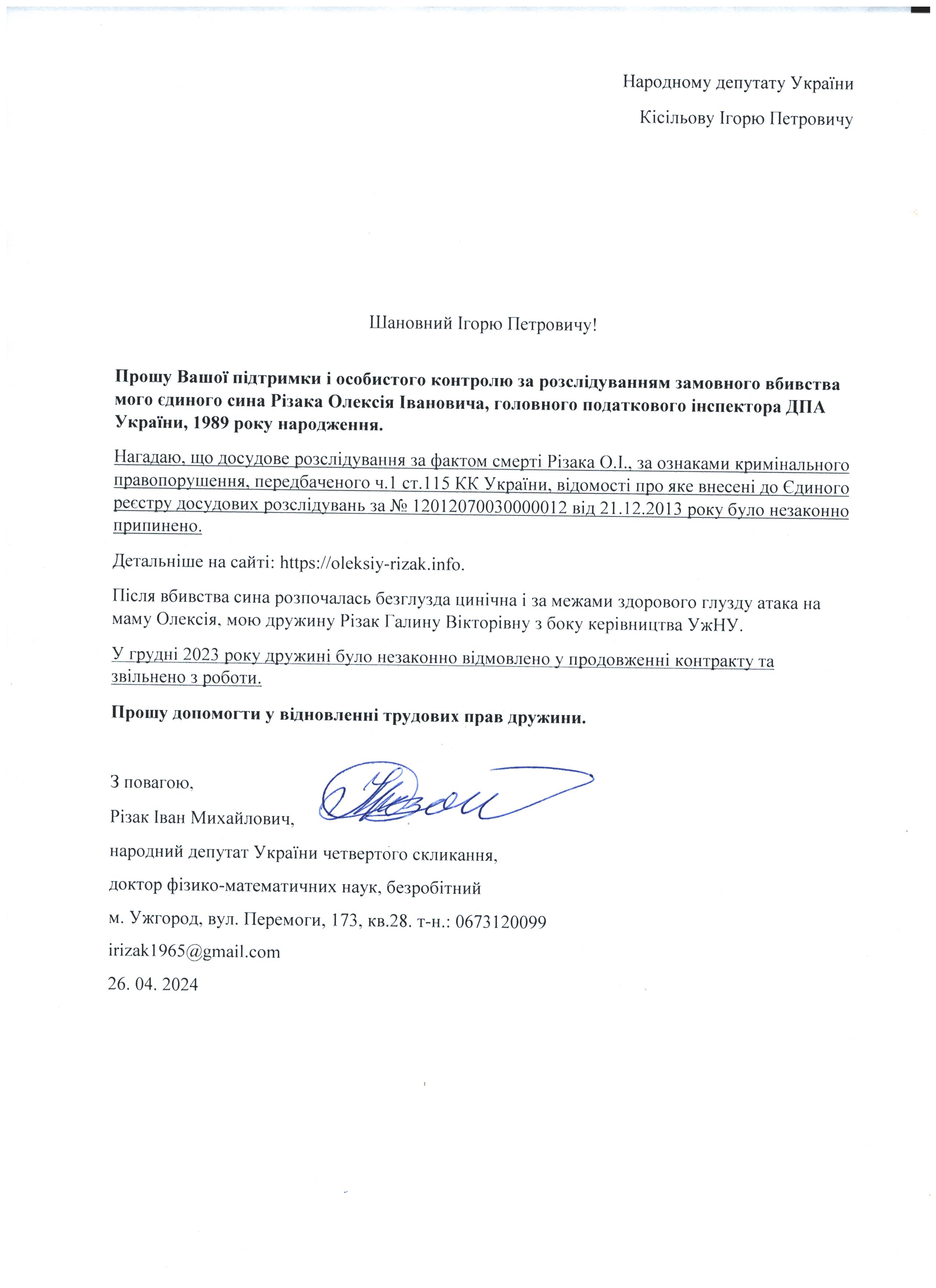Це дає мені підстави говорити про те, що вбивство мого сина – чітко спланована спецоперація з відповідним інформаційним забезпеченням по своїм масштабам схожа на гебельсівську пропаганду. На час поширення цієї версії загибелі сина не було жодної, підкреслюю жодної, підстави говорити про самогубство, оскільки на той час слідчі не знайшли і сліду падіння з багатоповерхівки Олексія Різака, а також не провели жодної слідчої дії з громадянкою із-за «нещасливої» любові до якої мій син закінчив життя самогубством. Щиро прошу Вас, в найближчі години перекваліфікувати цю трагедію за статею КПК «вбивство» і всебічно, об’єктивно та системно провести відповідні слідчі дії для знаходження впливових замовників і звірів-вбивць мого рідного сина. Коротко Вас проінформую, що Різак Олексій Іванович, 1989 р.н., магістр фінансів (закінчив економічний факультет Харківського національного університету імені В.Н. Каразіна з відзнакою), магістр – юрист (закінчив магістратуру національного університету «Юридична академія України імені Ярослава Мудрого»), має військове звання – молодший лейтенант запасу, працював головним державним податковим інспектором першого рангу ДПС у Закарпатській області. Активно займався спортом. У свій час виступав за юнацьку збірну України з футболу, професійний клуб ФК «Закарпаття». На сьогоднішній день виступав за збірну ДПС у Закарпатській області, щоденно займався фізкультурою (для прикладу скажу, щоранку віджимався до 500 разів, а кількість ранкових стрибків на скакалці сягала 2000 разів, разом зі мною освоював східні єдиноборства), мав щирі відносини із дівчиною, колегами по роботі, був серйозним і відповідальним фахівцем. Додам також, що за півтори години до знаходження його тіла я спілкувався з ним особисто по телефону і обговорював подробиці матчу чемпіонату Італії з футболу Мілан – Фіорентина, під час цієї розмови ми обговорили майбутню поїздку у Київ, а також похід у гості до знайомих. Переконаний, нічого не могло статися за ці півтори години після нашої доброї розмови з почуттям гумору і присутності його дівчини, якій я передав вітання.