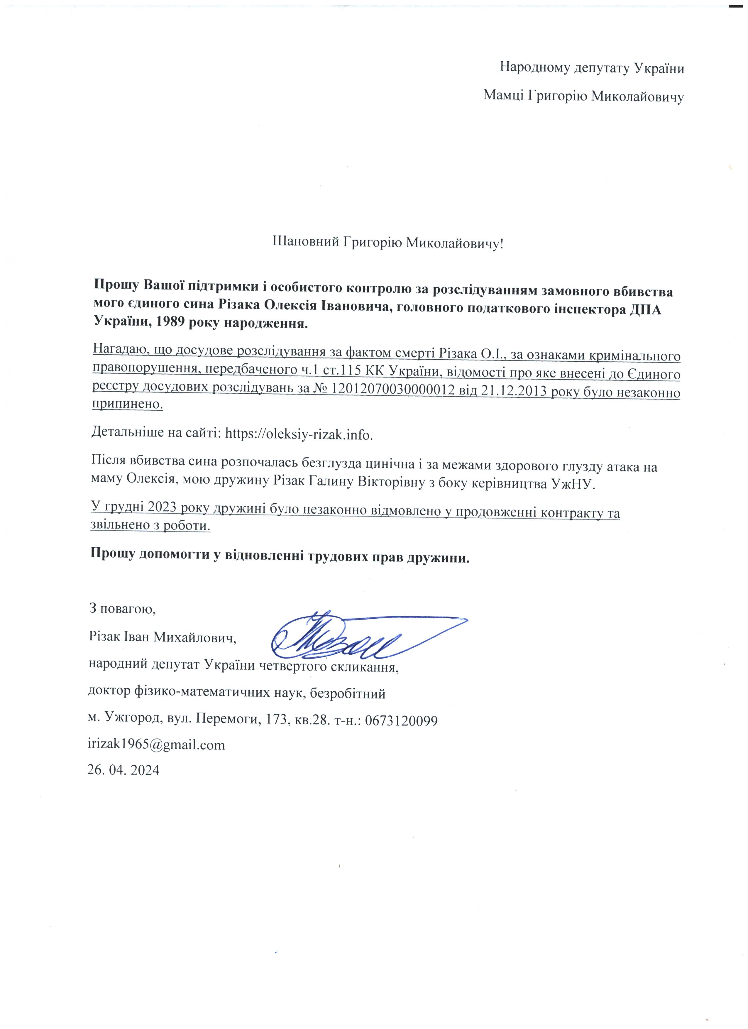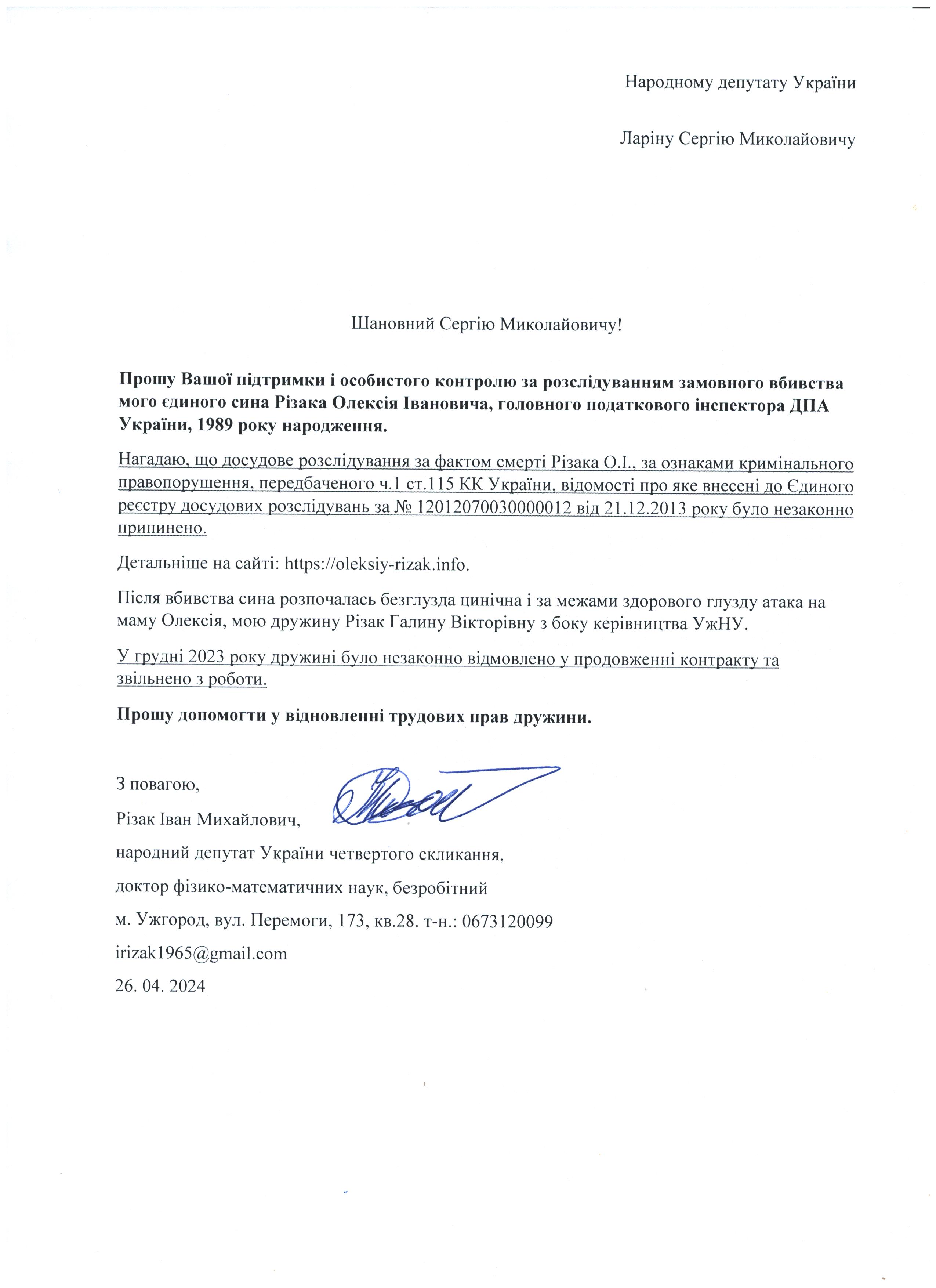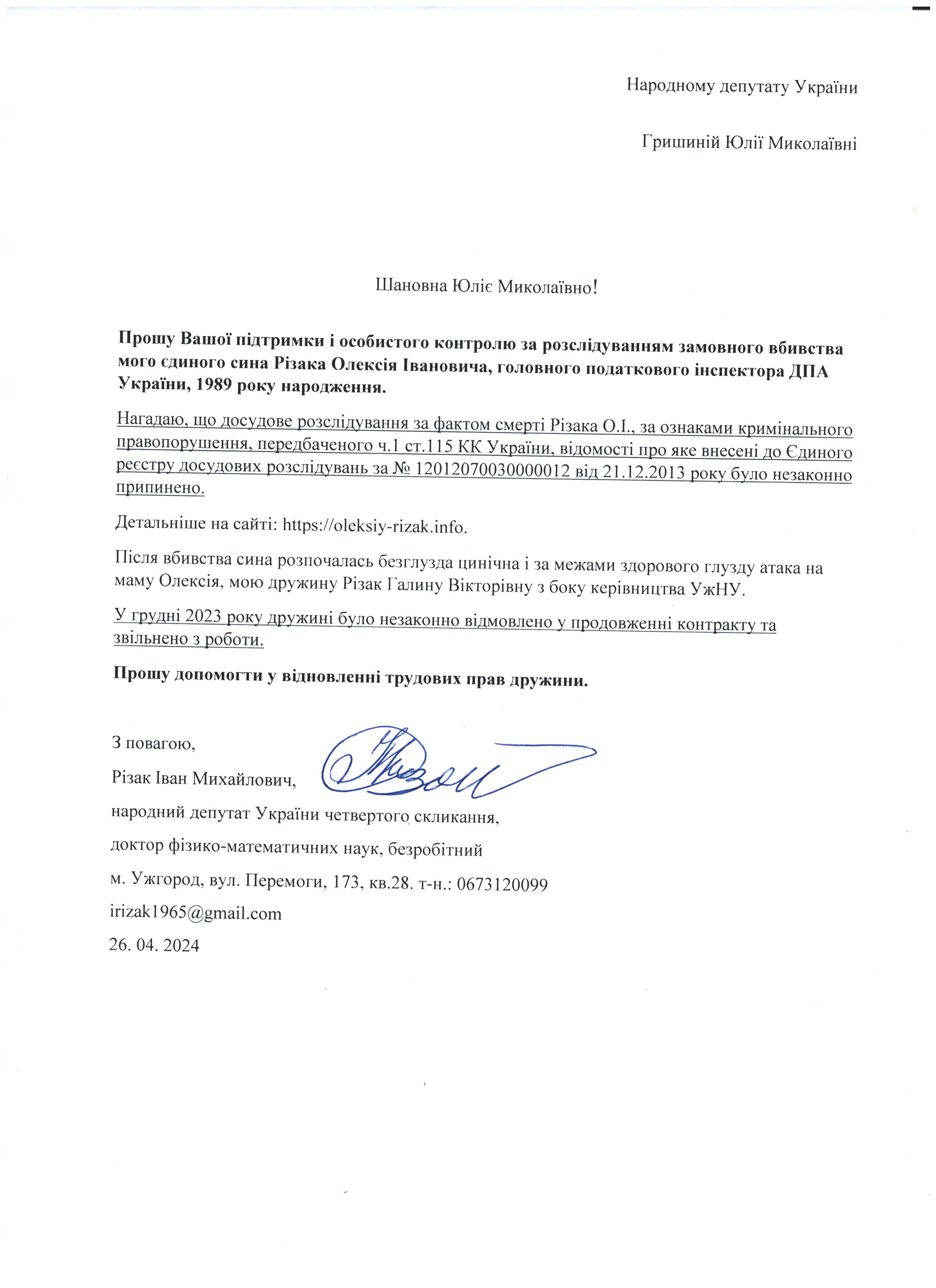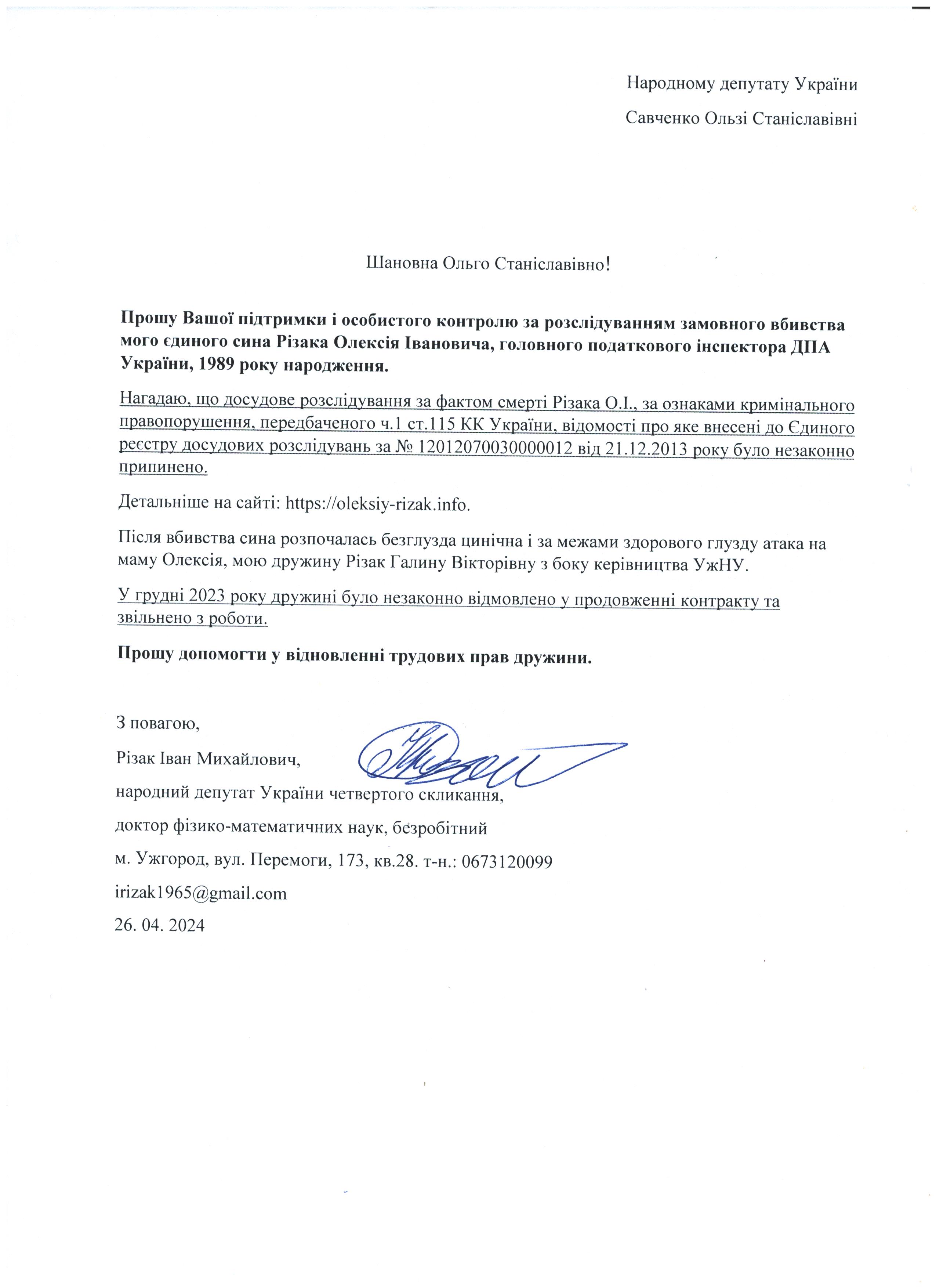 Це дає мені підстави говорити про те, що вбивство мого сина – чітко спланована спецоперація з відповідним інформаційним забезпеченням по своїм масштабам схожа на гебельсівську пропаганду. На час поширення цієї версії загибелі сина не було жодної, підкреслюю жодної, підстави говорити про самогубство, оскільки на той час слідчі не знайшли і сліду падіння з багатоповерхівки Олексія Різака, а також не провели жодної слідчої дії з громадянкою із-за «нещасливої» любові до якої мій син закінчив життя самогубством. Щиро прошу Вас, в найближчі години перекваліфікувати цю трагедію за статею КПК «вбивство» і всебічно, об’єктивно та системно провести відповідні слідчі дії для знаходження впливових замовників і звірів-вбивць мого рідного сина. Коротко Вас проінформую, що Різак Олексій Іванович, 1989 р.н., магістр фінансів (закінчив економічний факультет Харківського національного університету імені В.Н. Каразіна з відзнакою), магістр – юрист (закінчив магістратуру національного університету «Юридична академія України імені Ярослава Мудрого»), має військове звання – молодший лейтенант запасу, працював головним державним податковим інспектором першого рангу ДПС у Закарпатській області. Активно займався спортом. У свій час виступав за юнацьку збірну України з футболу, професійний клуб ФК «Закарпаття». На сьогоднішній день виступав за збірну ДПС у Закарпатській області, щоденно займався фізкультурою (для прикладу скажу, щоранку віджимався до 500 разів, а кількість ранкових стрибків на скакалці сягала 2000 разів, разом зі мною освоював східні єдиноборства), мав щирі відносини із дівчиною, колегами по роботі, був серйозним і відповідальним фахівцем. Додам також, що за півтори години до знаходження його тіла я спілкувався з ним особисто по телефону і обговорював подробиці матчу чемпіонату Італії з футболу Мілан – Фіорентина, під час цієї розмови ми обговорили майбутню поїздку у Київ, а також похід у гості до знайомих. Переконаний, нічого не могло статися за ці півтори години після нашої доброї розмови з почуттям гумору і присутності його дівчини, якій я передав вітання.