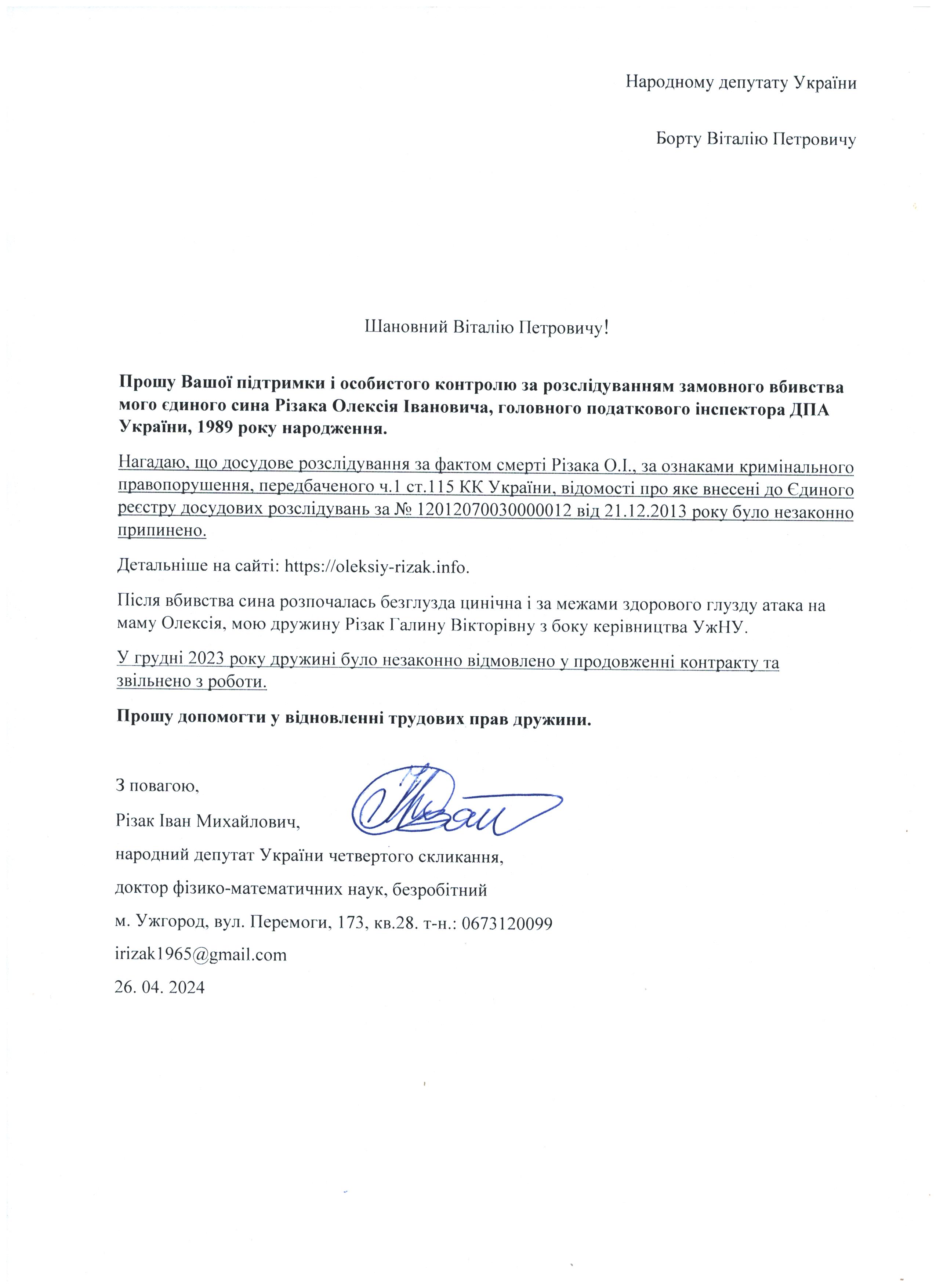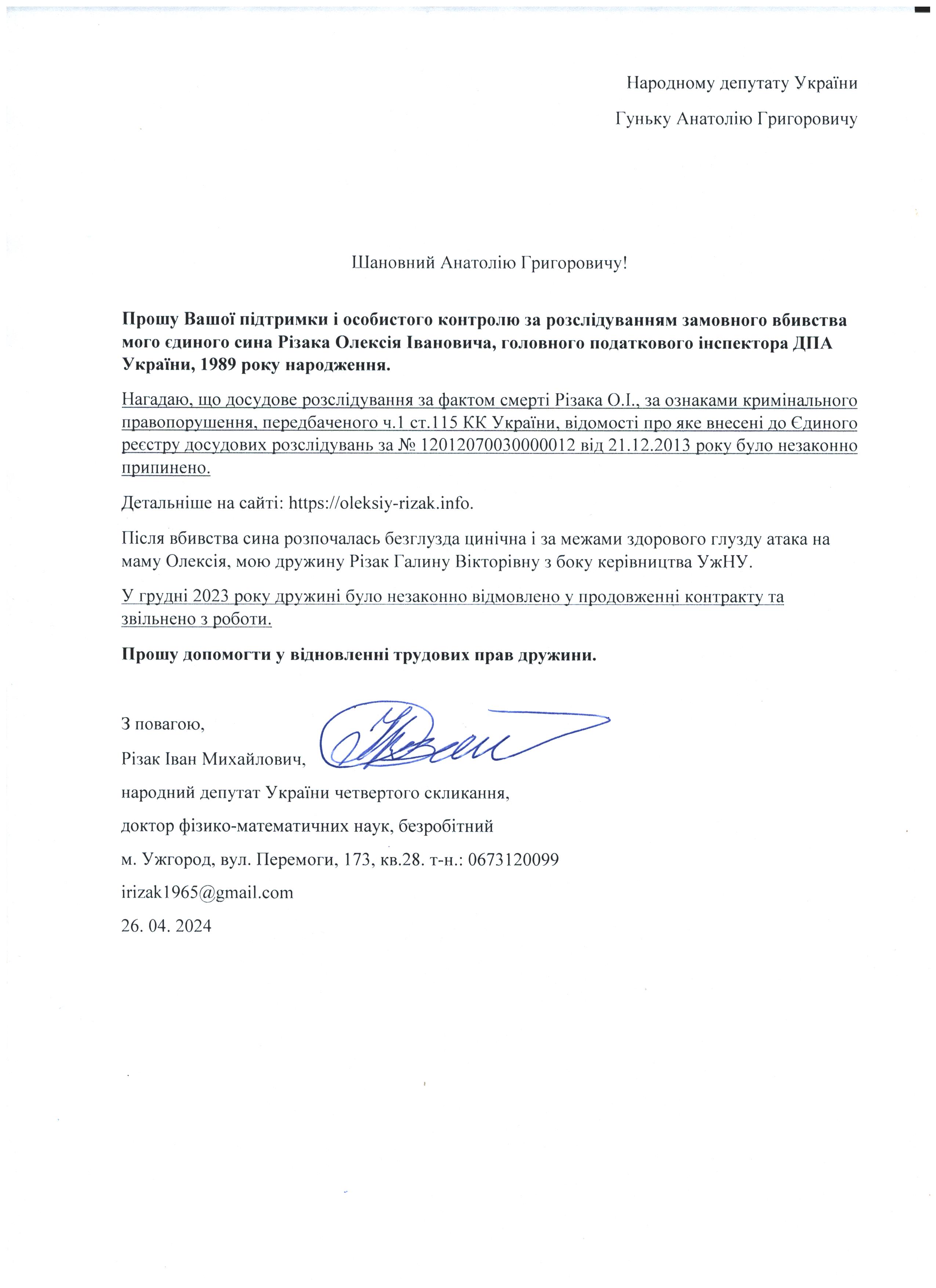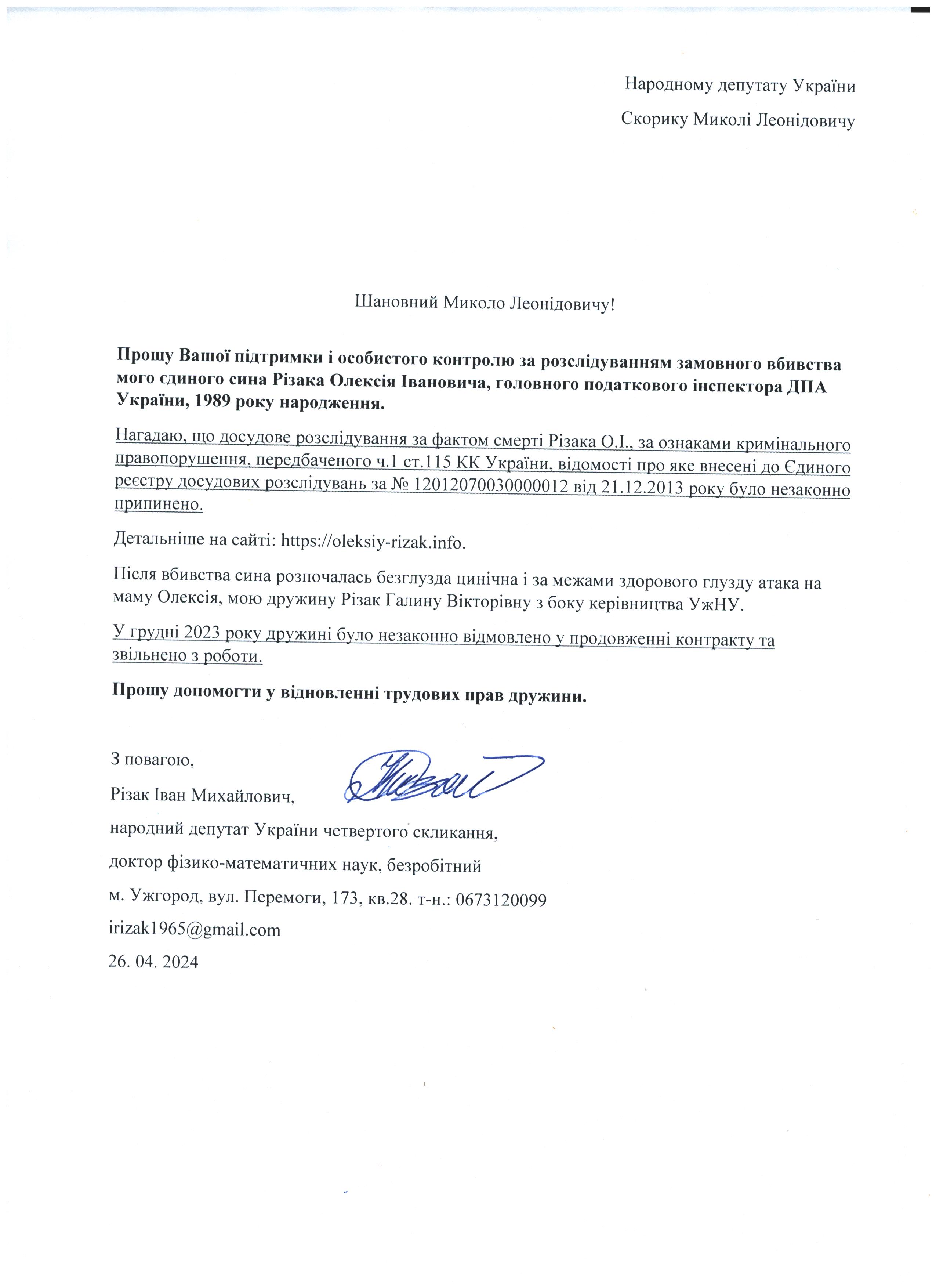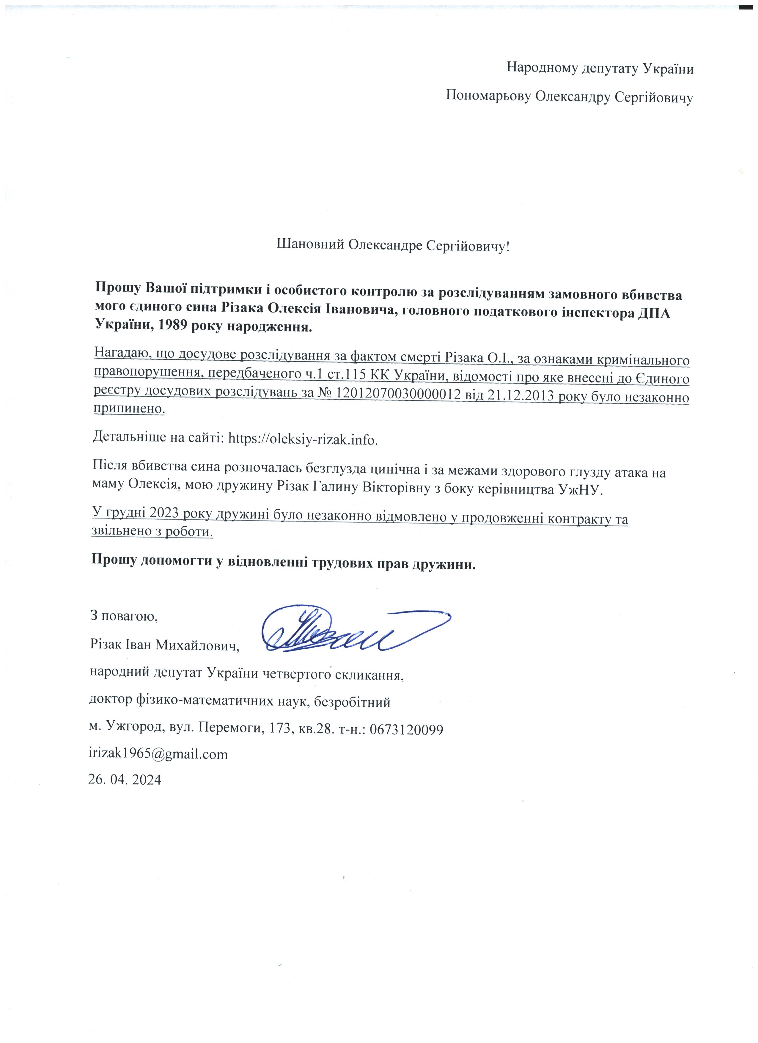 Це дає мені підстави говорити про те, що вбивство мого сина – чітко спланована спецоперація з відповідним інформаційним забезпеченням по своїм масштабам схожа на гебельсівську пропаганду. На час поширення цієї версії загибелі сина не було жодної, підкреслюю жодної, підстави говорити про самогубство, оскільки на той час слідчі не знайшли і сліду падіння з багатоповерхівки Олексія Різака, а також не провели жодної слідчої дії з громадянкою із-за «нещасливої» любові до якої мій син закінчив життя самогубством. Щиро прошу Вас, в найближчі години перекваліфікувати цю трагедію за статею КПК «вбивство» і всебічно, об’єктивно та системно провести відповідні слідчі дії для знаходження впливових замовників і звірів-вбивць мого рідного сина. Коротко Вас проінформую, що Різак Олексій Іванович, 1989 р.н., магістр фінансів (закінчив економічний факультет Харківського національного університету імені В.Н. Каразіна з відзнакою), магістр – юрист (закінчив магістратуру національного університету «Юридична академія України імені Ярослава Мудрого»), має військове звання – молодший лейтенант запасу, працював головним державним податковим інспектором першого рангу ДПС у Закарпатській області. Активно займався спортом. У свій час виступав за юнацьку збірну України з футболу, професійний клуб ФК «Закарпаття». На сьогоднішній день виступав за збірну ДПС у Закарпатській області, щоденно займався фізкультурою (для прикладу скажу, щоранку віджимався до 500 разів, а кількість ранкових стрибків на скакалці сягала 2000 разів, разом зі мною освоював східні єдиноборства), мав щирі відносини із дівчиною, колегами по роботі, був серйозним і відповідальним фахівцем. Додам також, що за півтори години до знаходження його тіла я спілкувався з ним особисто по телефону і обговорював подробиці матчу чемпіонату Італії з футболу Мілан – Фіорентина, під час цієї розмови ми обговорили майбутню поїздку у Київ, а також похід у гості до знайомих. Переконаний, нічого не могло статися за ці півтори години після нашої доброї розмови з почуттям гумору і присутності його дівчини, якій я передав вітання.