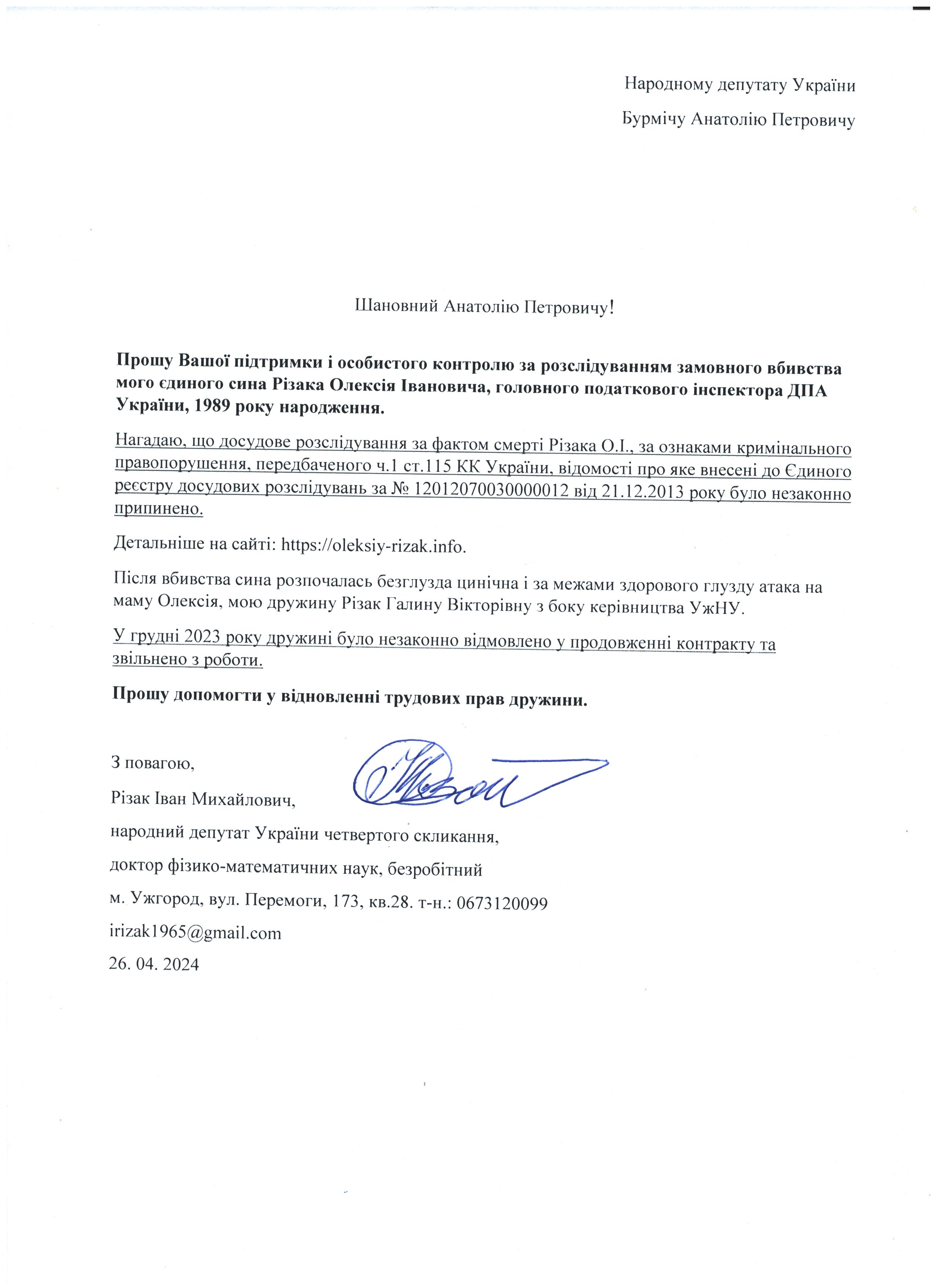 З метою сприяння слідству, а також всебічно об’єктивного розслідування справи прошу Вас доручити своїм підлеглим перевірити наступні питання: 1) чи міг володіти працівник ДПС в Закарпатській області Олексій Різак якоюсь інформацією про тіньовий та кримінальний бізнес в області, знання якої загрожувало б його життю? 2) перевірити у відповідних державних органах наявність у Різака Олексія Івановича та його близьких родичів майна, фінансів, земельних ділянок, підприємств, бізнесу, акцій, облігацій та інших цінних паперів, володіння якими могло б потенційно загрожувати його життю з боку конкурентів та інших співвласників? 3) чи були у нього відносини з громадянкою чи її родичами такими, що могли серйозно впливати на його майновий, матеріальний та ін. стан. 4) чи залучались до спеціальної перевірки, яку потрібно проходити при зарахуванні на державну службу, підрозділи зовнішнього спостереження якоїсь із правоохоронних структур області (я стверджую, що з часу переїзду мене в Закарпаття за нами було встановлене тотальне зовнішнє спостереження)? 5) хотілося б дізнатися (думаю, що це не є слідчою таємницею) в який час і з допомогою якого транспорту 16 листопада 2012 року виїхав син від своєї дівчини, чи проводжала вона його сама або з близькими родичами, чи бачила щось підозріле і яким таксі він виїжджав додому? 6) хотілося б також дізнатися хто першим побачив тіло вбитого юнака і повідомив швидку допомогу і міліцію? 7) з метою перевірки версії спроби отруєння сина Олексія, прошу дати на перевірку у спеціальну токсикологічну лабораторію результати трьох аналізів в «Астра-дія» і одного аналізу, проведеного в кардіодиспансері кілька тижнів тому.