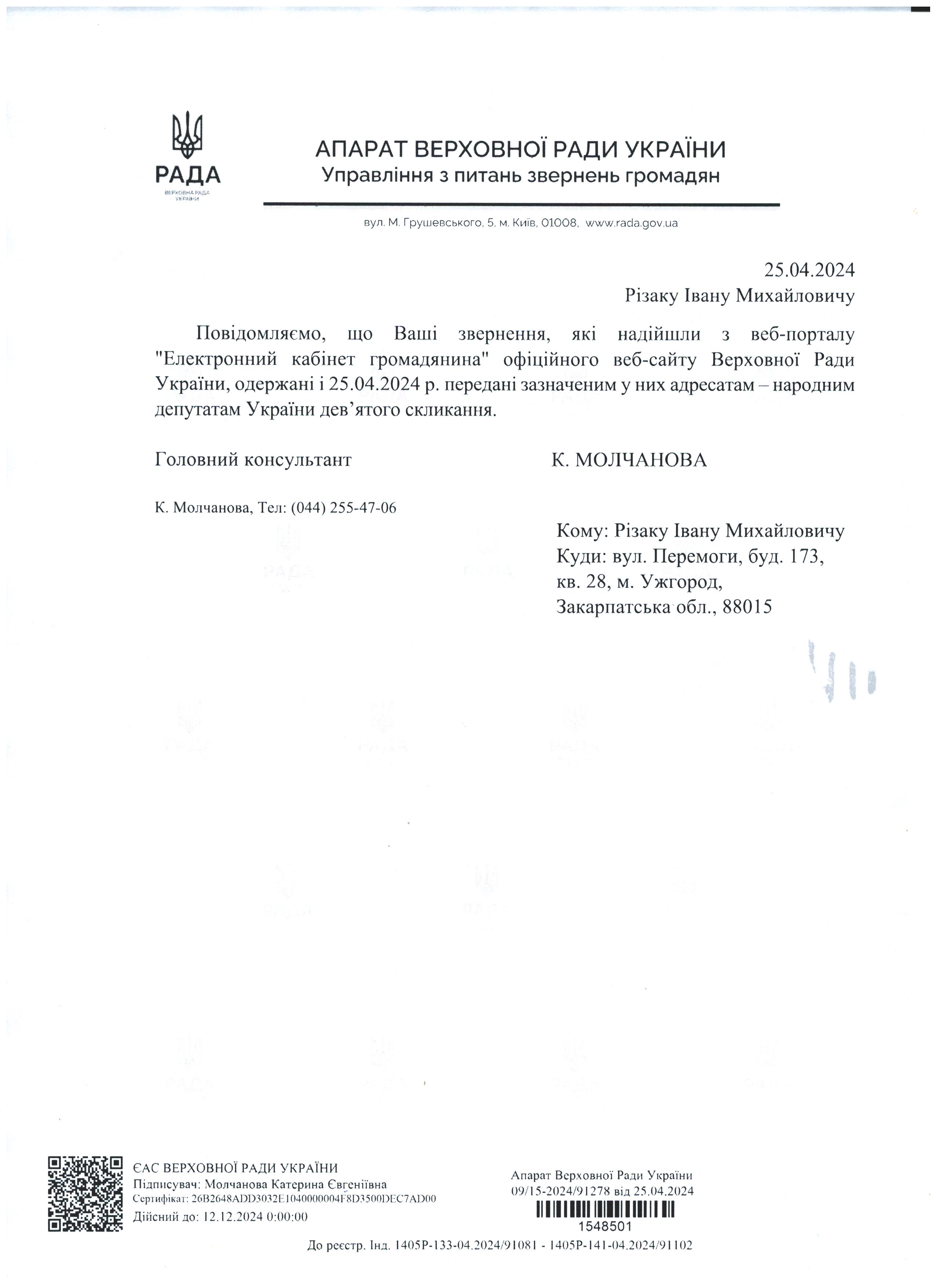 Шановні Анатолію Леонідовичу, Василю Дмитровичу, Василю Миколайовичу! Звертаюся до Вас як батько, як колишній керівник області, як простий житель цього краю, який хоче, щоб на цій землі ніколи не проливалася кров наших рідних, знайомих і близьких. Переконаний, що у політичного керівництва держави є достатньо волі для того, щоб поставити на місце «безпредельщиков», які пробують дестабілізувати ситуацію у державі. Переконаний, що події на кшталт помаранчевого терору у 2005 роців області більше не повторяться. З глибокою повагою, Різак Іван Михайлович, що проживає за адресою м. Ужгород, вул. Капушанська, б.173 кв. 28, голова Закарпатської обласної державної адміністрації (вересень 2002р. – січень 2005р.), народний депутат IV скликання, державний службовець І рангу, багаторічний голова і член координаційного комітету по боротьбі з організованою злочинністю при ОДА, кандидат фізико-математичних наук, тимчасово непрацюючий.