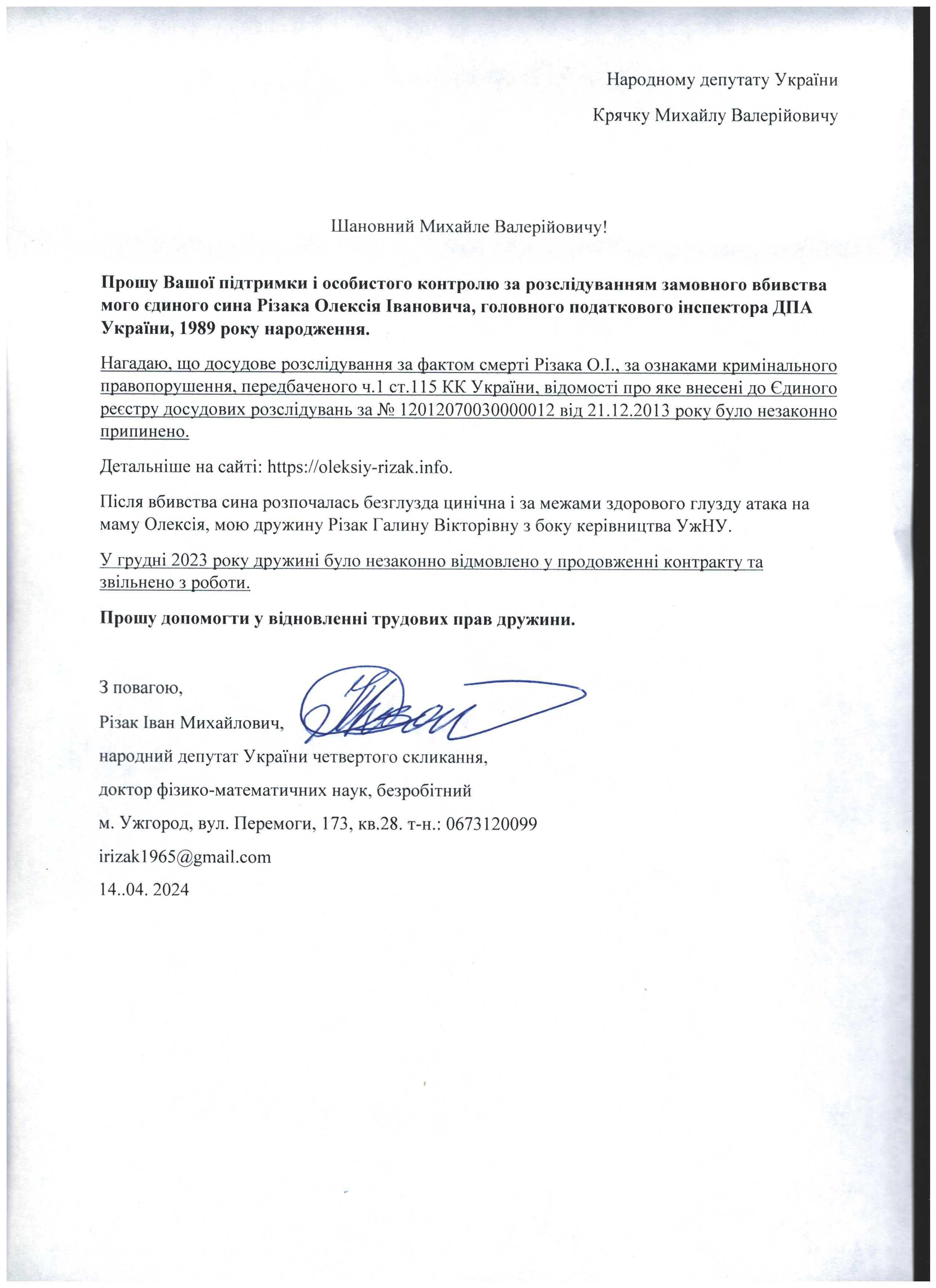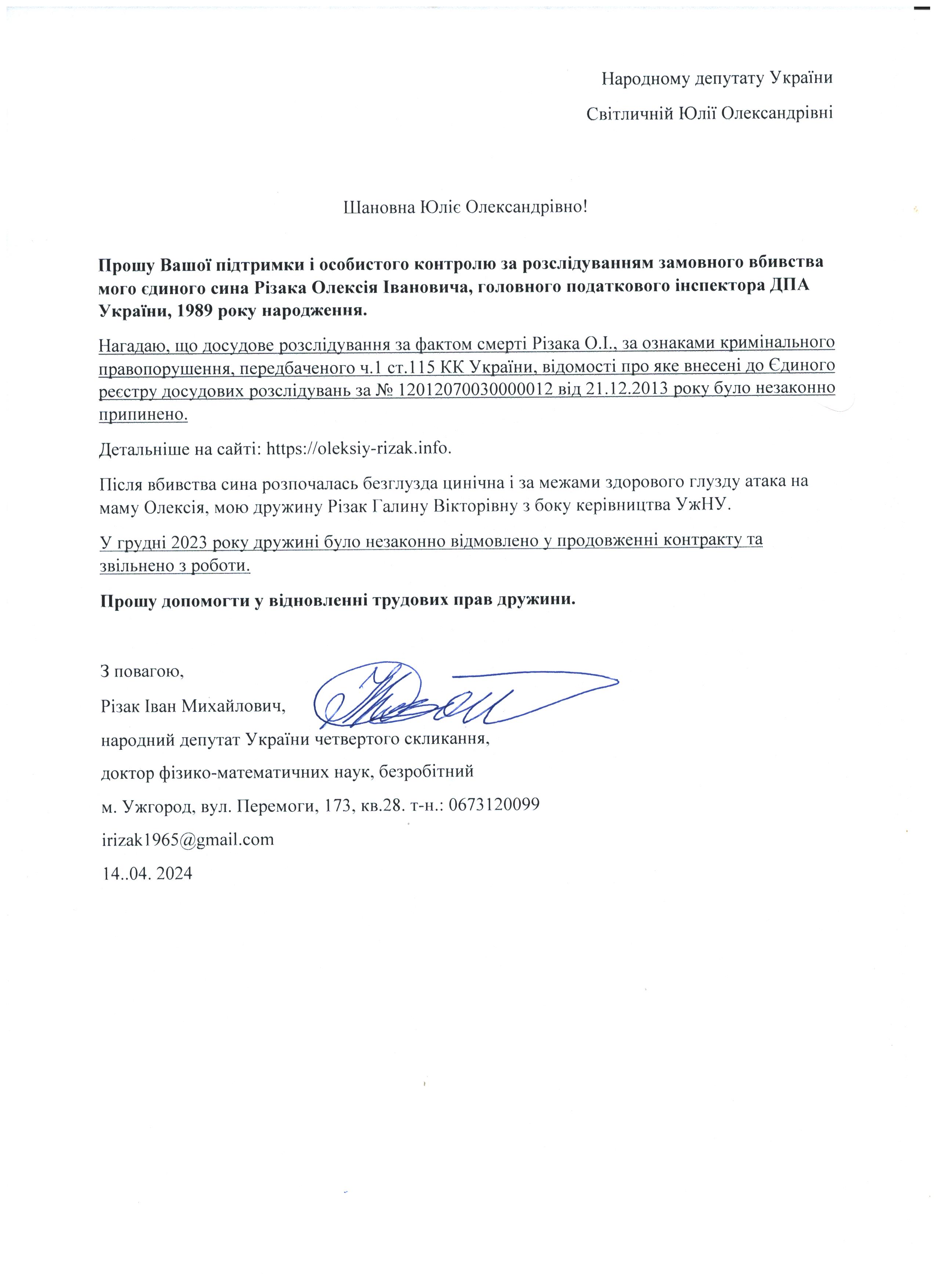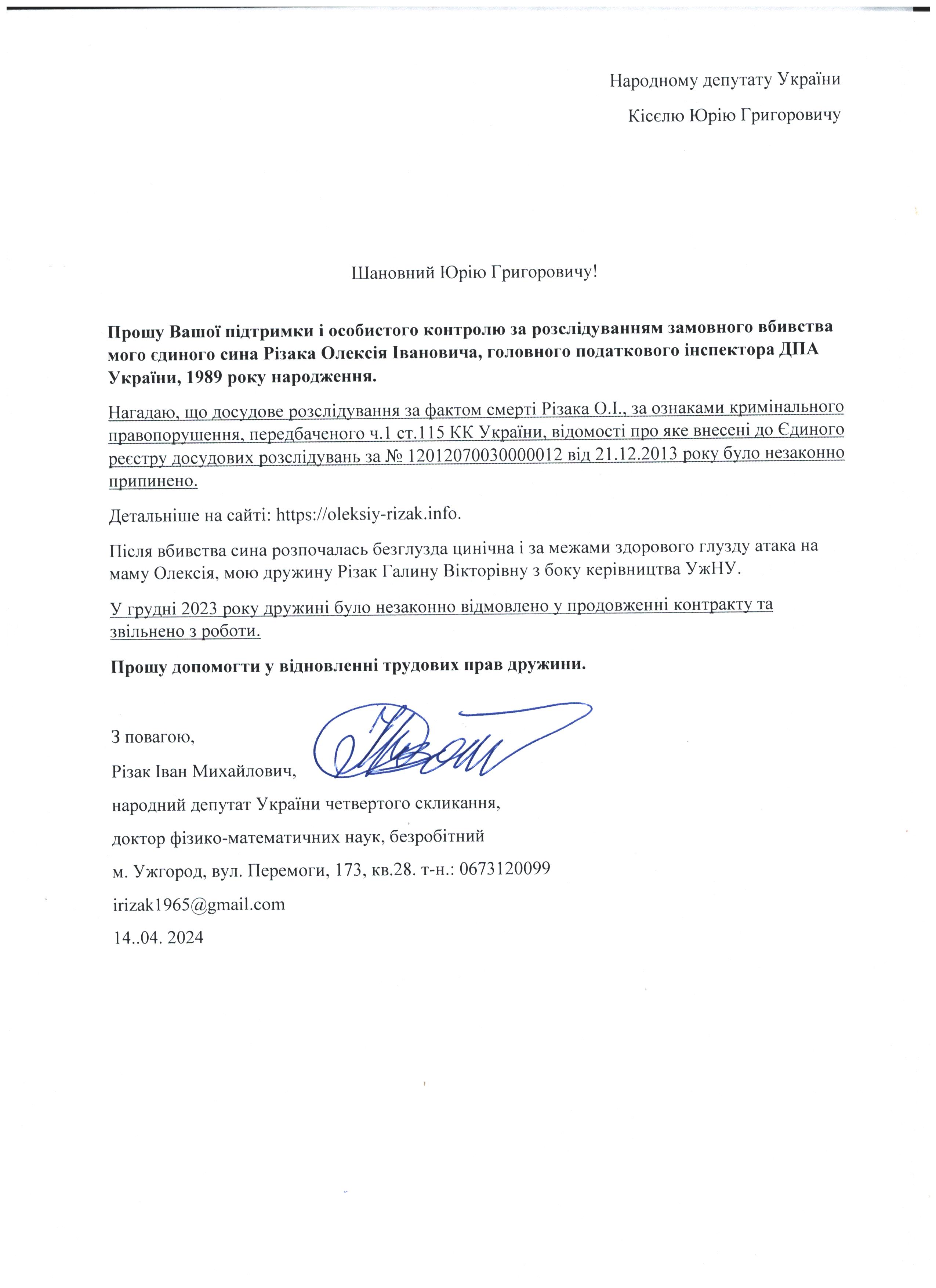 Це дає мені підстави говорити про те, що вбивство мого сина – чітко спланована спецоперація з відповідним інформаційним забезпеченням по своїм масштабам схожа на гебельсівську пропаганду. На час поширення цієї версії загибелі сина не було жодної, підкреслюю жодної, підстави говорити про самогубство, оскільки на той час слідчі не знайшли і сліду падіння з багатоповерхівки Олексія Різака, а також не провели жодної слідчої дії з громадянкою із-за «нещасливої» любові до якої мій син закінчив життя самогубством. Щиро прошу Вас, в найближчі години перекваліфікувати цю трагедію за статею КПК «вбивство» і всебічно, об’єктивно та системно провести відповідні слідчі дії для знаходження впливових замовників і звірів-вбивць мого рідного сина. Коротко Вас проінформую, що Різак Олексій Іванович, 1989 р.н., магістр фінансів (закінчив економічний факультет Харківського національного університету імені В.Н. Каразіна з відзнакою), магістр – юрист (закінчив магістратуру національного університету «Юридична академія України імені Ярослава Мудрого»), має військове звання – молодший лейтенант запасу, працював головним державним податковим інспектором першого рангу ДПС у Закарпатській області. Активно займався спортом. У свій час виступав за юнацьку збірну України з футболу, професійний клуб ФК «Закарпаття». На сьогоднішній день виступав за збірну ДПС у Закарпатській області, щоденно займався фізкультурою (для прикладу скажу, щоранку віджимався до 500 разів, а кількість ранкових стрибків на скакалці сягала 2000 разів, разом зі мною освоював східні єдиноборства), мав щирі відносини із дівчиною, колегами по роботі, був серйозним і відповідальним фахівцем. Додам також, що за півтори години до знаходження його тіла я спілкувався з ним особисто по телефону і обговорював подробиці матчу чемпіонату Італії з футболу Мілан – Фіорентина, під час цієї розмови ми обговорили майбутню поїздку у Київ, а також похід у гості до знайомих. Переконаний, нічого не могло статися за ці півтори години після нашої доброї розмови з почуттям гумору і присутності його дівчини, якій я передав вітання.