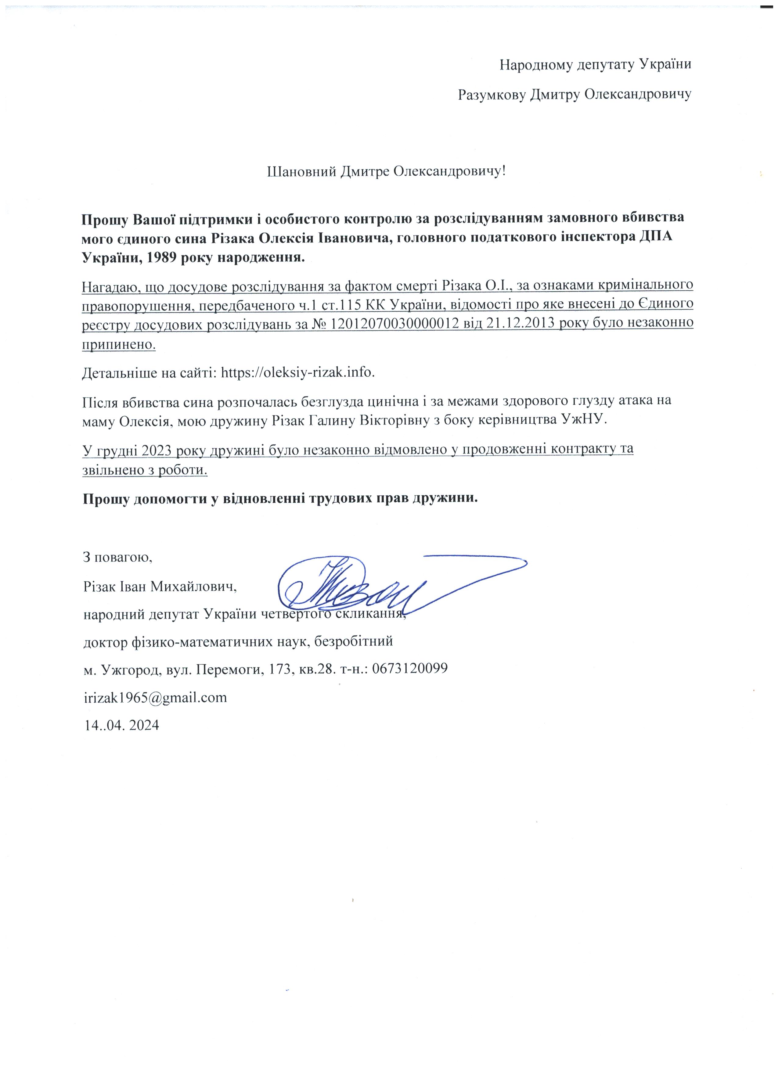 Шановні Анатолію Леонідовичу, Василю Дмитровичу, Василю Миколайовичу! Звертаюся до Вас як батько, як колишній керівник області, як простий житель цього краю, який хоче, щоб на цій землі ніколи не проливалася кров наших рідних, знайомих і близьких. Переконаний, що у політичного керівництва держави є достатньо волі для того, щоб поставити на місце «безпредельщиков», які пробують дестабілізувати ситуацію у державі. Переконаний, що події на кшталт помаранчевого терору у 2005 роців області більше не повторяться. З глибокою повагою, Різак Іван Михайлович, що проживає за адресою м. Ужгород, вул. Капушанська, б.173 кв. 28, голова Закарпатської обласної державної адміністрації (вересень 2002р. – січень 2005р.), народний депутат IV скликання, державний службовець І рангу, багаторічний голова і член координаційного комітету по боротьбі з організованою злочинністю при ОДА, кандидат фізико-математичних наук, тимчасово непрацюючий.