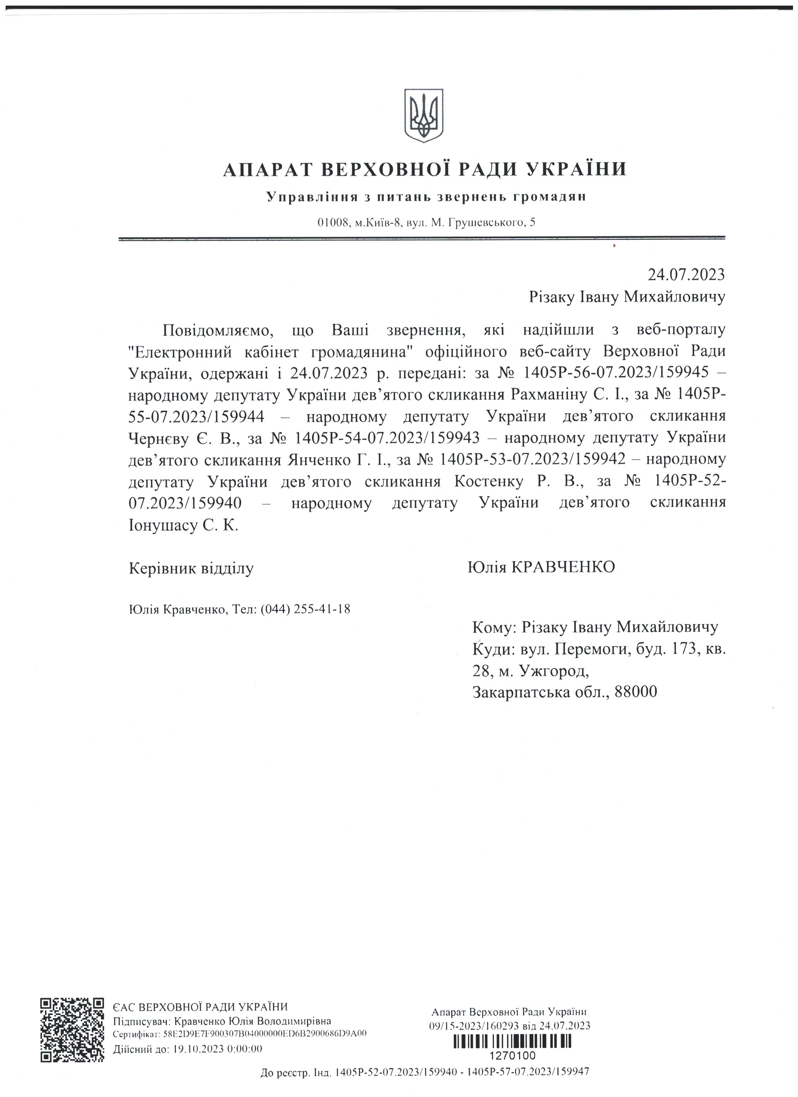 Шановні Анатолію Леонідовичу, Василю Дмитровичу, Василю Миколайовичу! Звертаюся до Вас як батько, як колишній керівник області, як простий житель цього краю, який хоче, щоб на цій землі ніколи не проливалася кров наших рідних, знайомих і близьких. Переконаний, що у політичного керівництва держави є достатньо волі для того, щоб поставити на місце «безпредельщиков», які пробують дестабілізувати ситуацію у державі. Переконаний, що події на кшталт помаранчевого терору у 2005 роців області більше не повторяться. З глибокою повагою, Різак Іван Михайлович, що проживає за адресою м. Ужгород, вул. Капушанська, б.173 кв. 28, голова Закарпатської обласної державної адміністрації (вересень 2002р. – січень 2005р.), народний депутат IV скликання, державний службовець І рангу, багаторічний голова і член координаційного комітету по боротьбі з організованою злочинністю при ОДА, кандидат фізико-математичних наук, тимчасово непрацюючий.